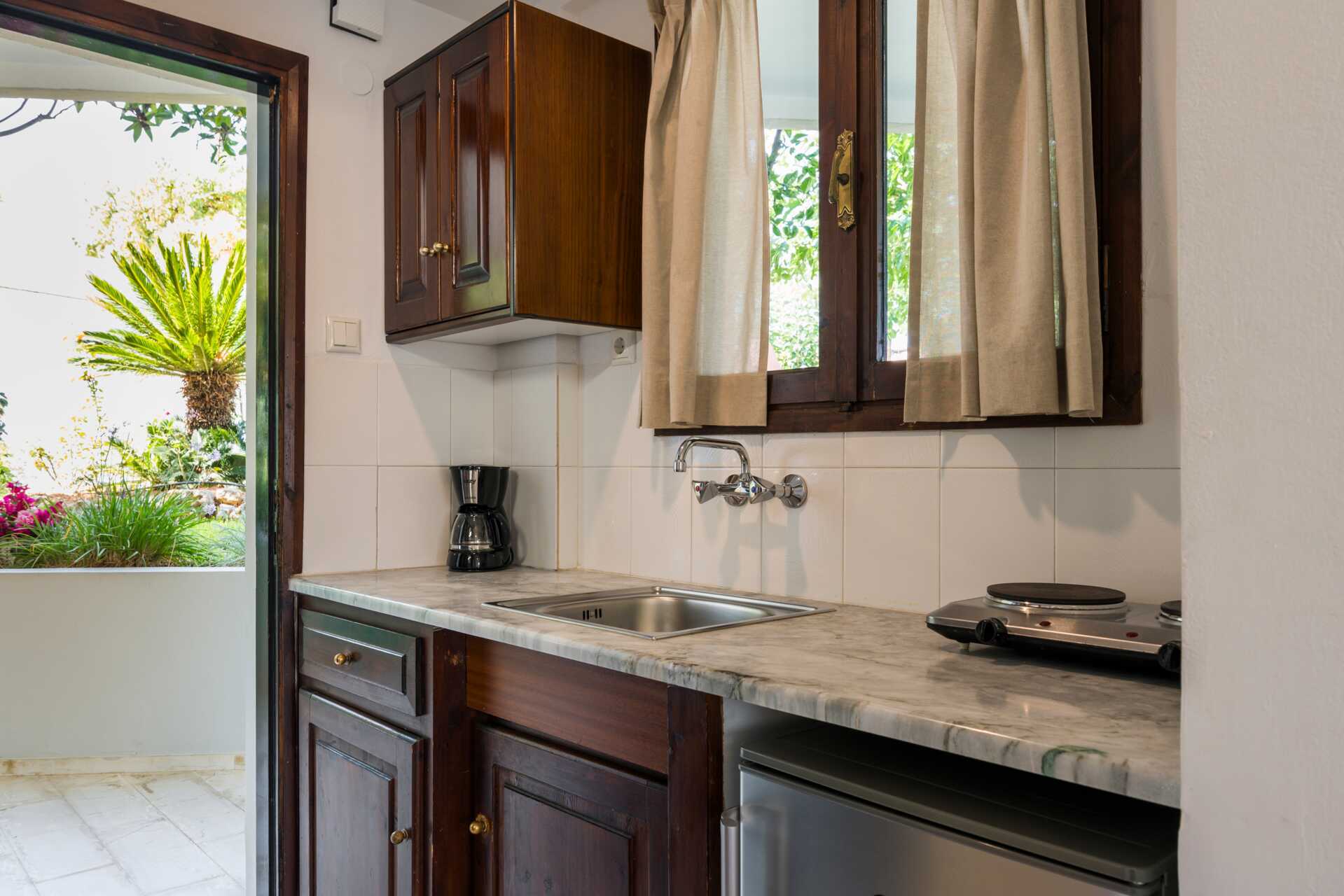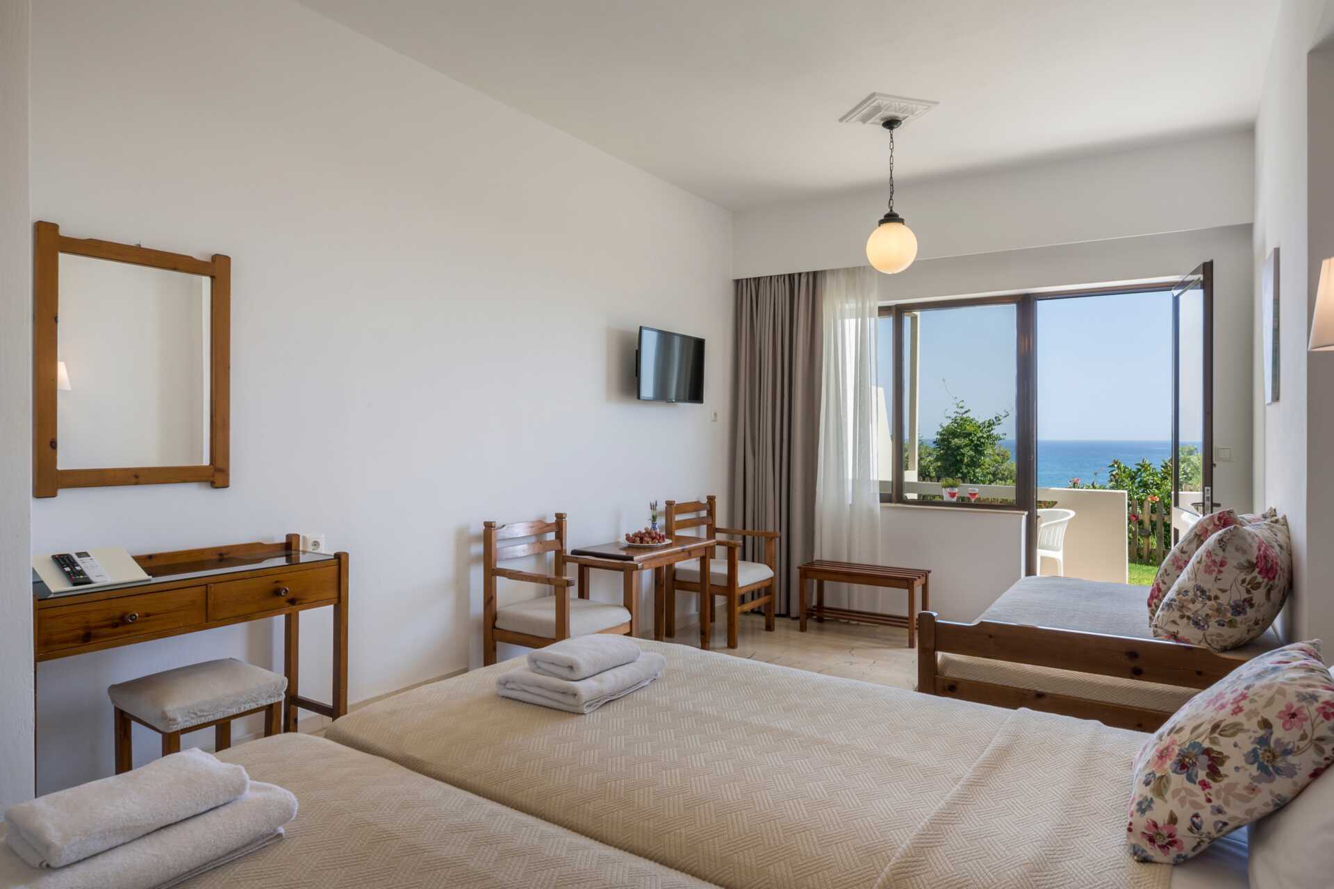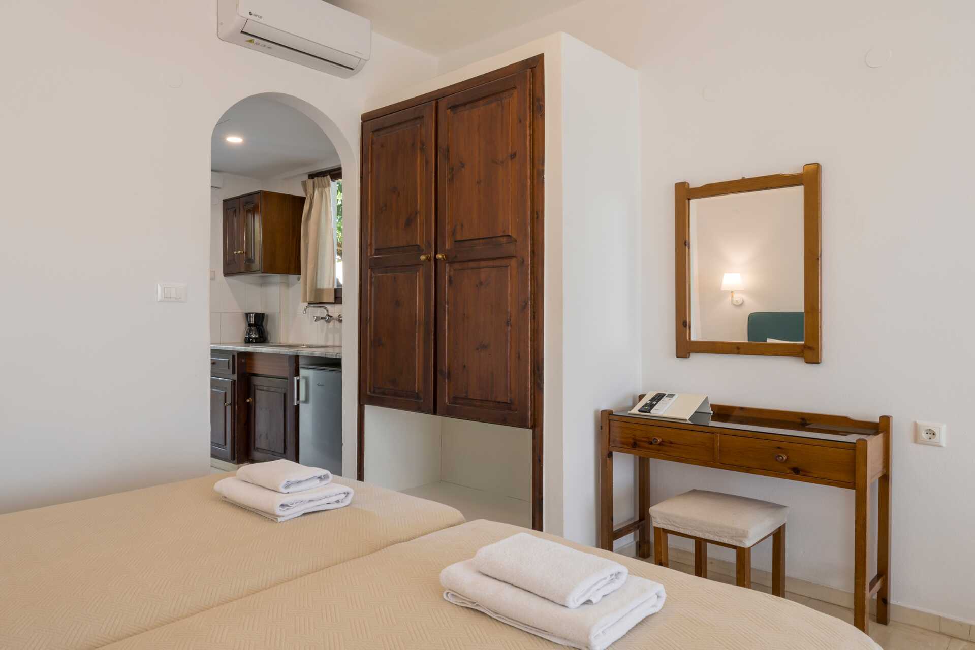 Enrumslägenhet med balkong med havsutsikt eller markterrass med begränsad havsutsikt. Kombinerat sovrum med vardagsrum och minikök. Två enkelsängar. Möjlighet till extrabädd i enkelsäng. Sovdelen ligger ett trappsteg upp. Minikök med kokplattor, kylskåp, vattenkokare, kaffebryggare och enkel köksutrustning. Wifi och luftkonditionering ingår. Deponering mot avgift. Tv med lokala kanaler. Hårtork. Badrum med badkar och wc. Städning 6 ggr/vecka.