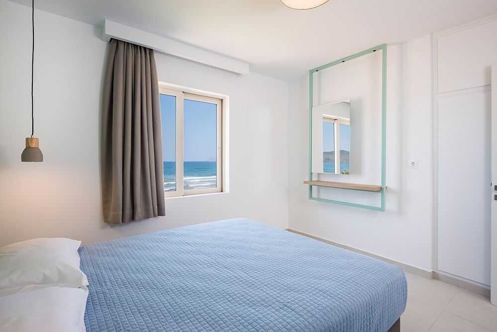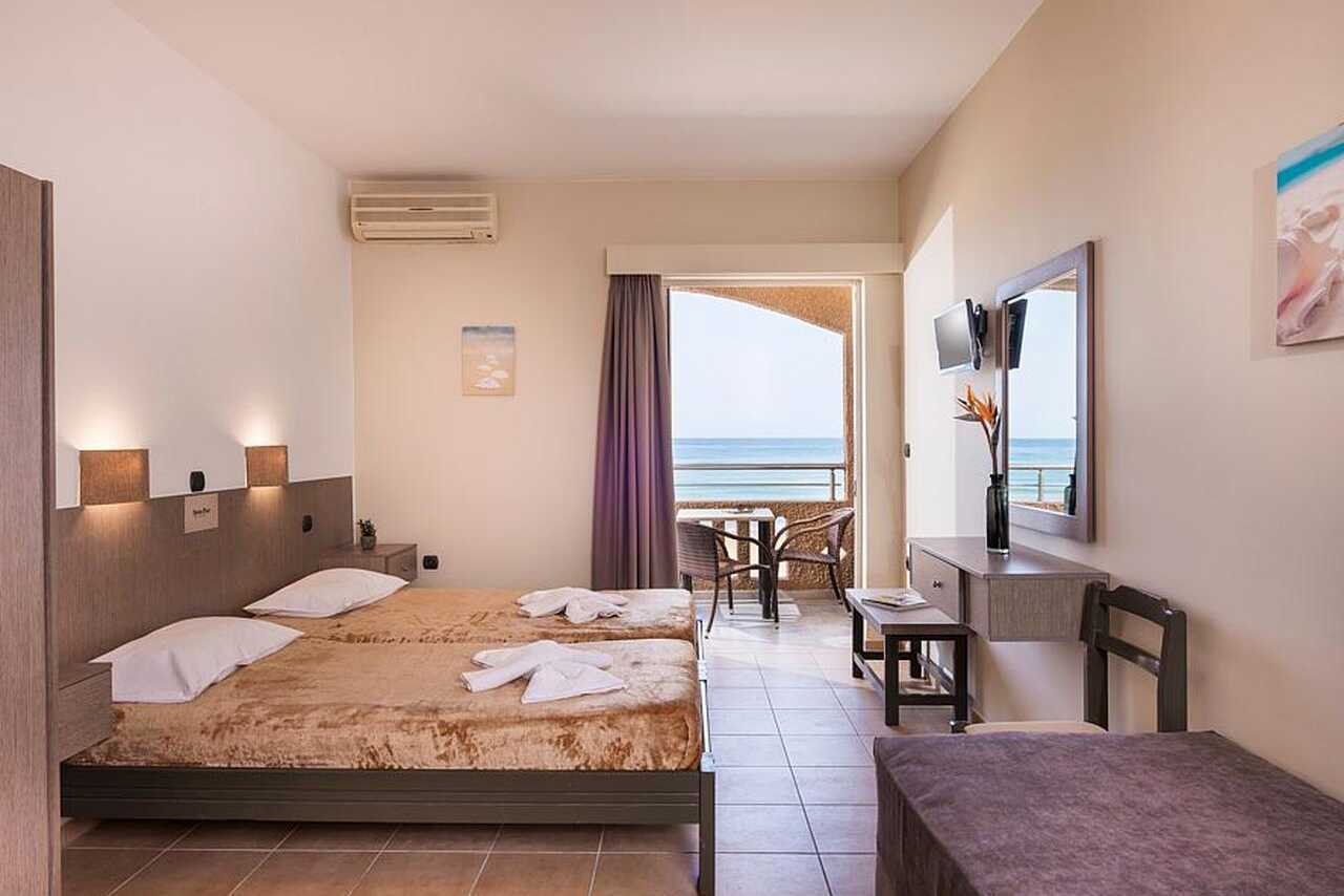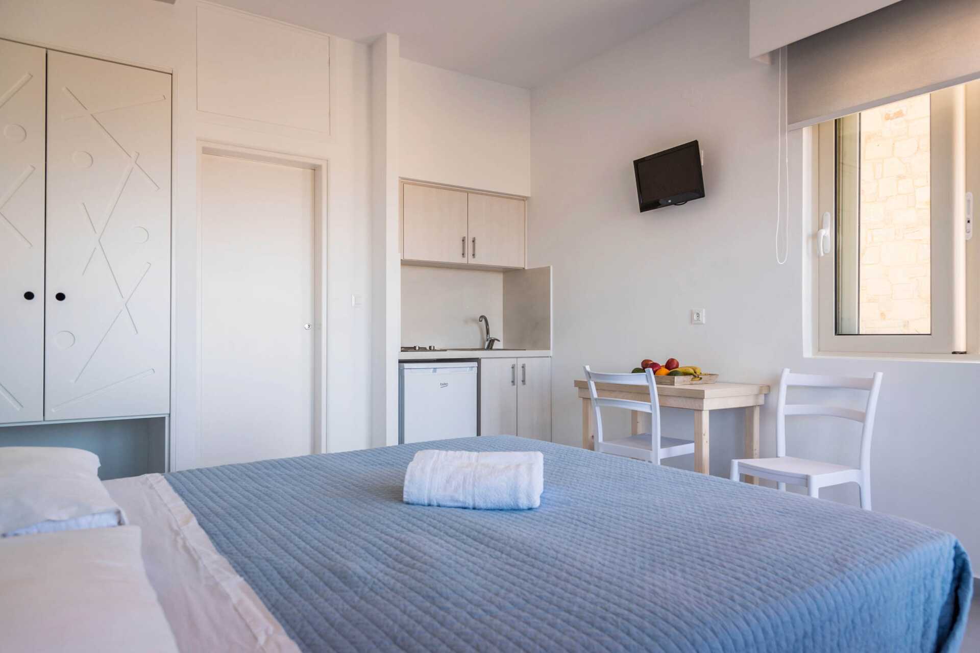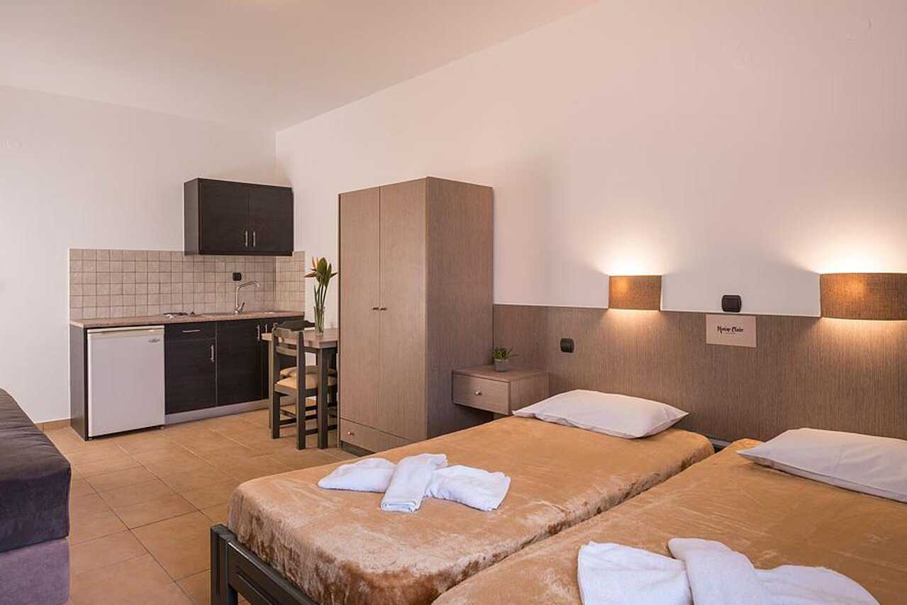 Enrumslägenhet med balkong, vissa med havsutsikt eller poolutsikt eller med markterass och havsutsikt. En dubbelsäng eller två enkelsängar. Möjlighet till extrabädd i bäddsoffa. Kombinerat sovrum och minikök. Minikök med kokplattor, kylskåp, kaffebryggare, vattenkokare och enklare köksutrustning. Wifi och luftkonditionering ingår. Deponering mot avgift. Hårtork. Badrum med dusch samt wc. Städning 6 ggr/vecka.