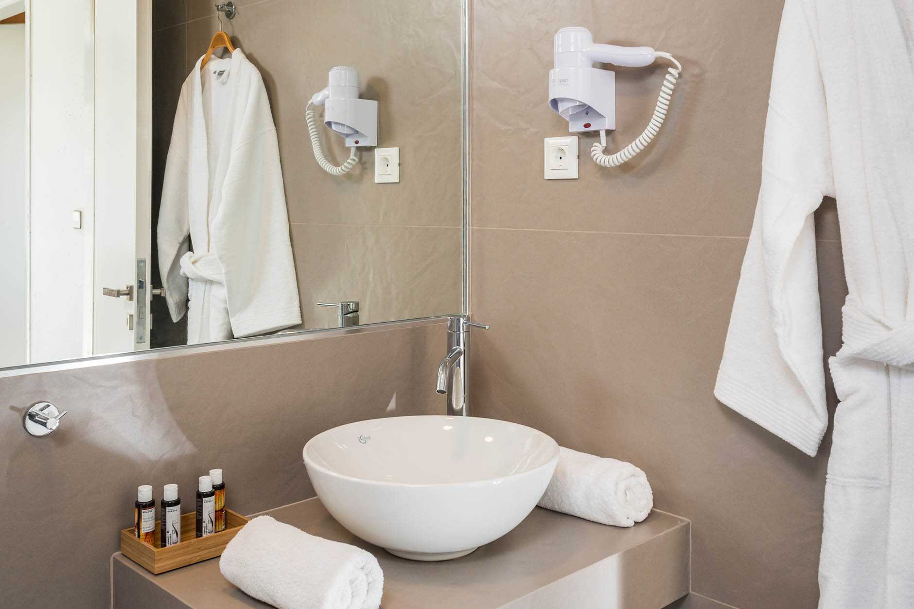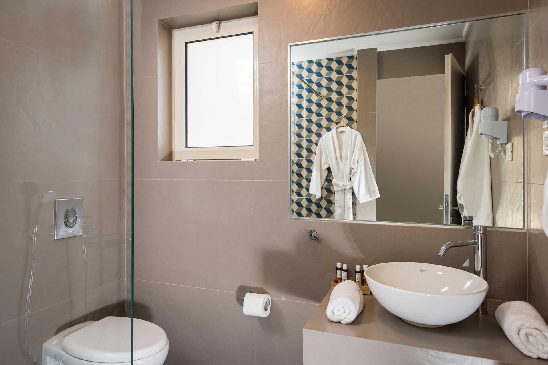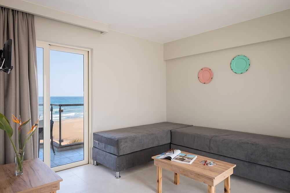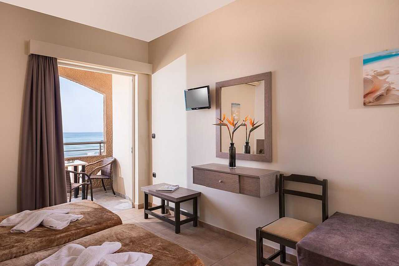 Enrumslägenhet med balkong, vissa med havsutsikt eller poolutsikt eller med markterass och havsutsikt. En dubbelsäng eller två enkelsängar. Möjlighet till extrabädd i bäddsoffa. Kombinerat sovrum och minikök. Minikök med kokplattor, kylskåp, kaffebryggare, vattenkokare och enklare köksutrustning. Wifi och luftkonditionering ingår. Deponering mot avgift. Hårtork. Badrum med dusch samt wc. Städning 6 ggr/vecka.