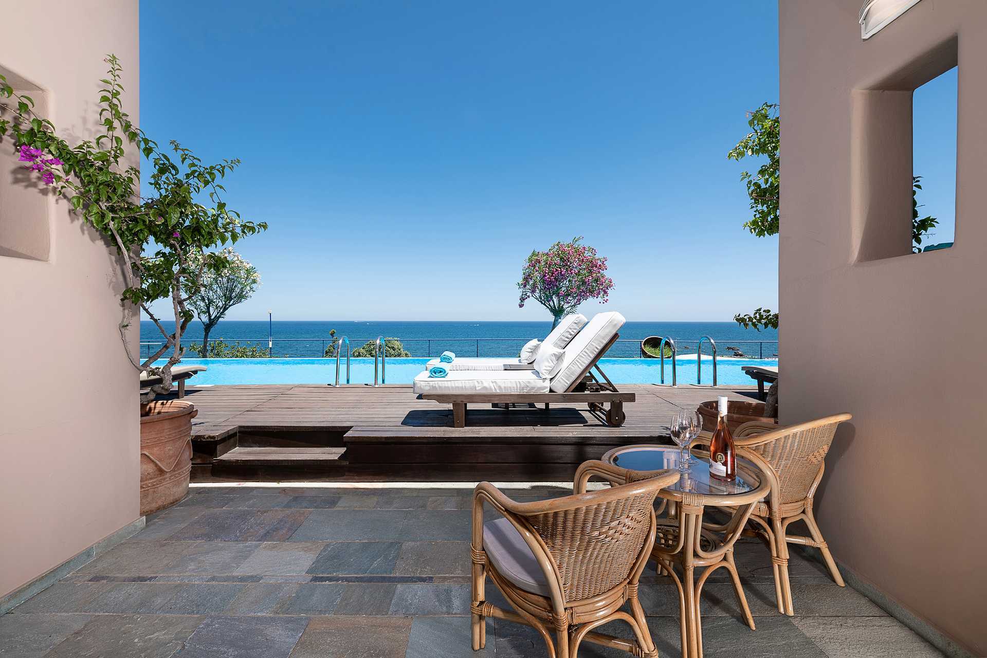 Superiorrum med delad pool, markterrass och havsutsikt. Åldersgränsen för att bo i denna rumstyp är 16 år. En dubbelsäng. Wifi, luftkonditionering och deponering ingår. Minibar mot avgift. Vattenkokare samt kaffe och te. Tv med internationella kanaler. Badrockar och tofflor. Hårtork. Badrum med badkar och wc. Städning 7 ggr/vecka. Barn under två år räknas in i maxantalet personer i rummet.