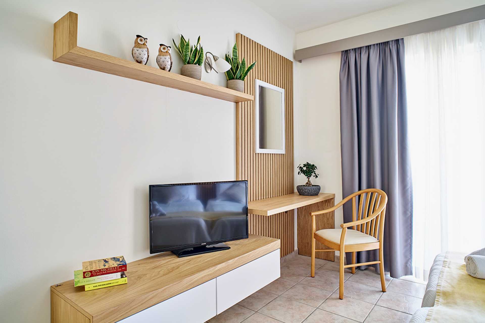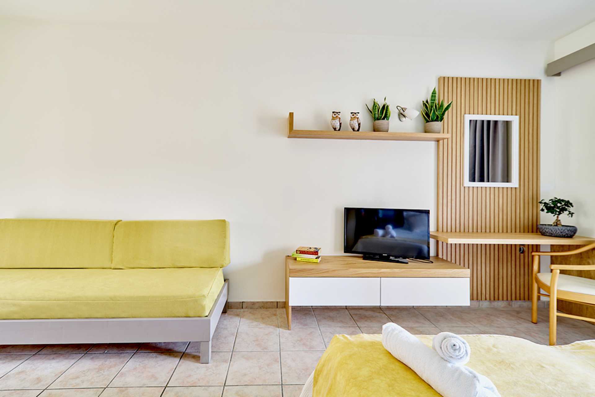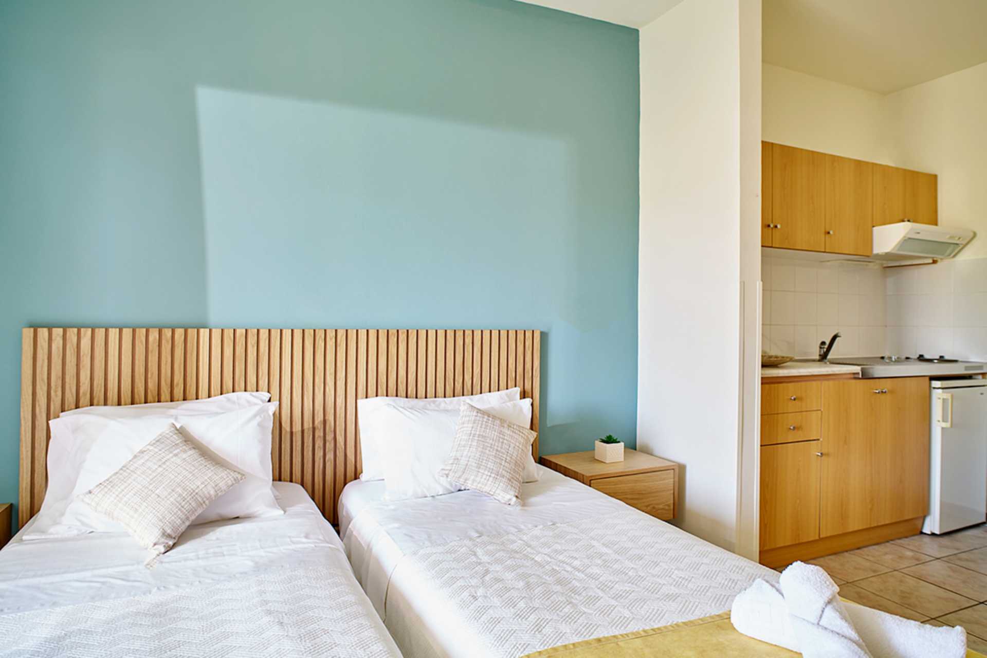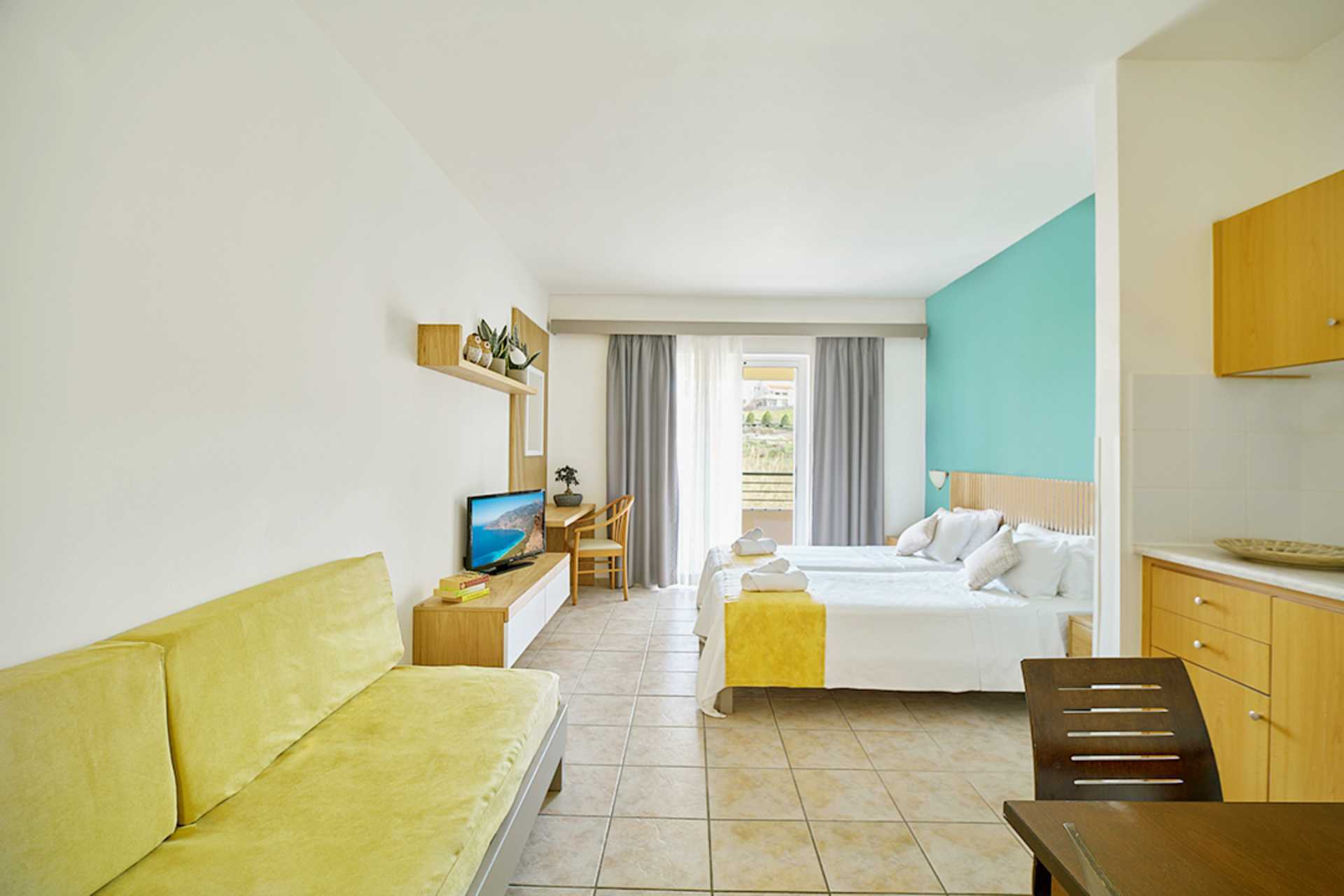 Enrumslägenhet med balkong eller markbalkong, vissa med poolutsikt. Kombinerat sovrum och minikök. I vissa lägenheter förekommer några trappsteg. Två enkelsängar. Möjlighet till extrabädd i bäddsoffa. Minikök med kokplattor, kylskåp, kaffebryggare, mikrovågsugn, vattenkokare, brödrost och enkel köksutrustning. Wifi, luftkonditionering och deponering ingår. Tv med internationella kanaler. Hårtork. Badrum med dusch och wc. Städning 6 ggr/vecka.