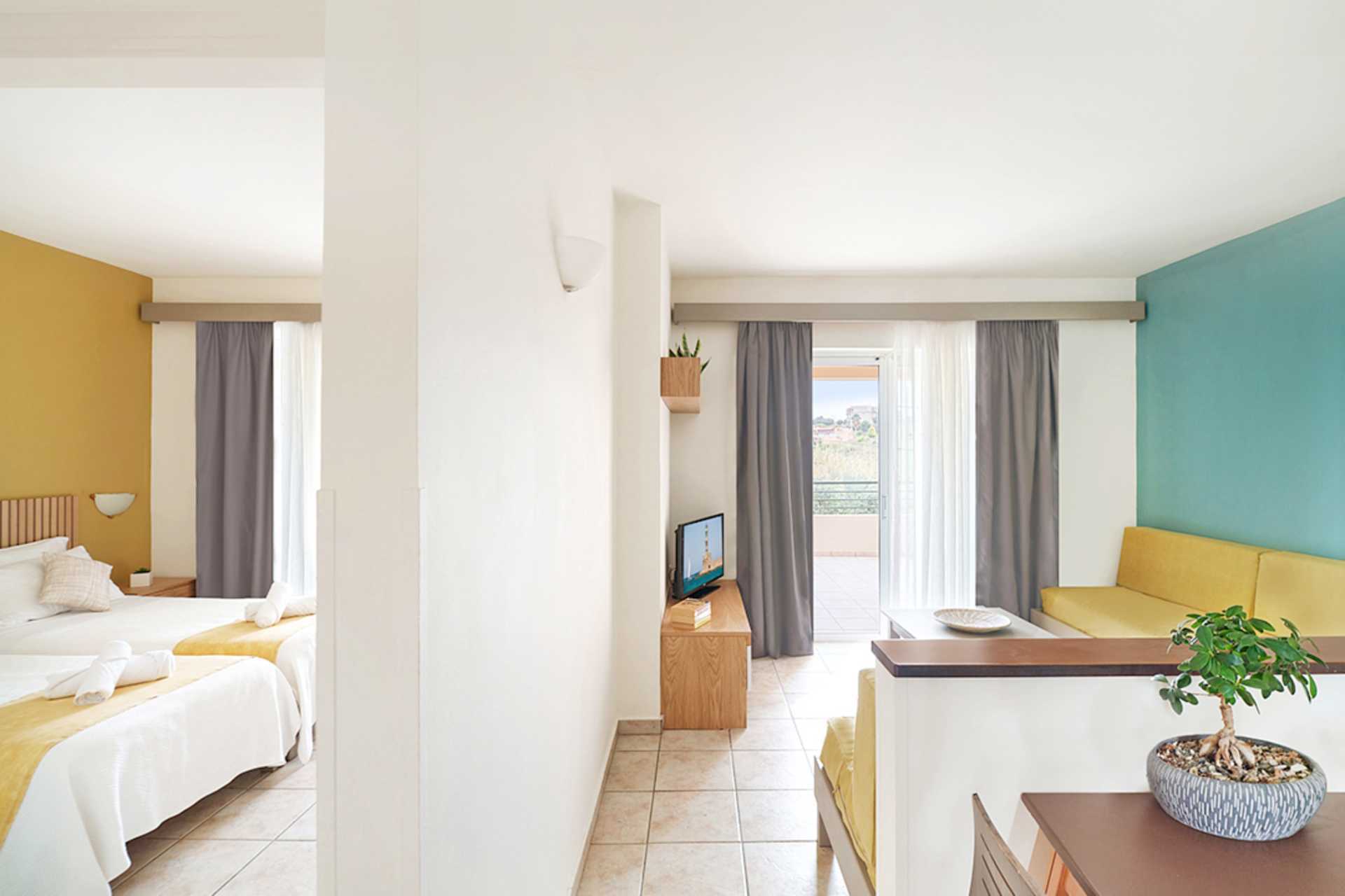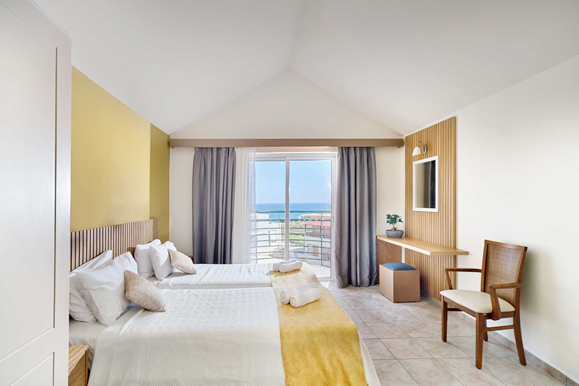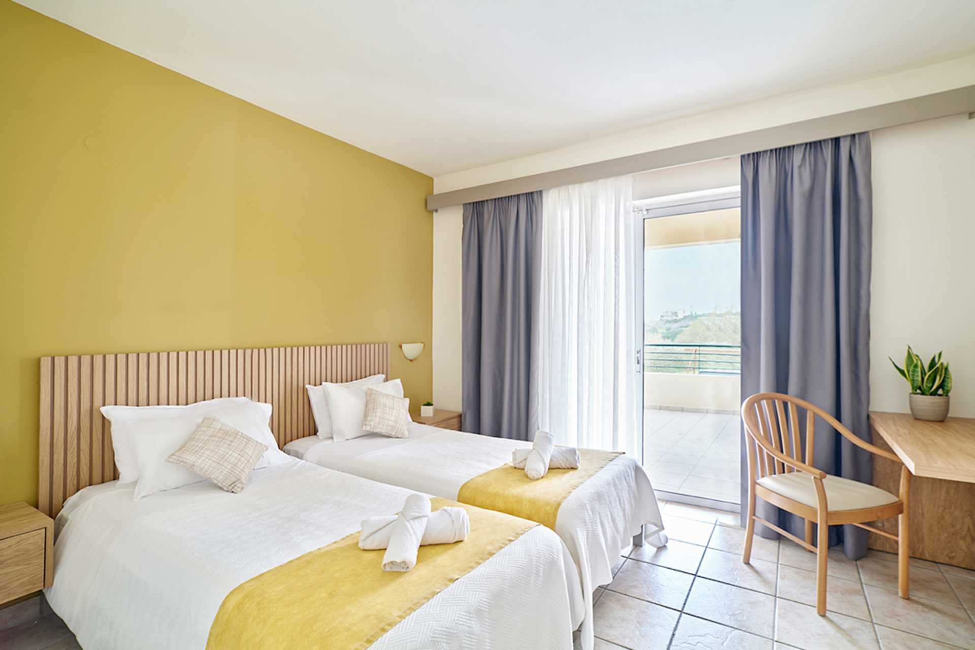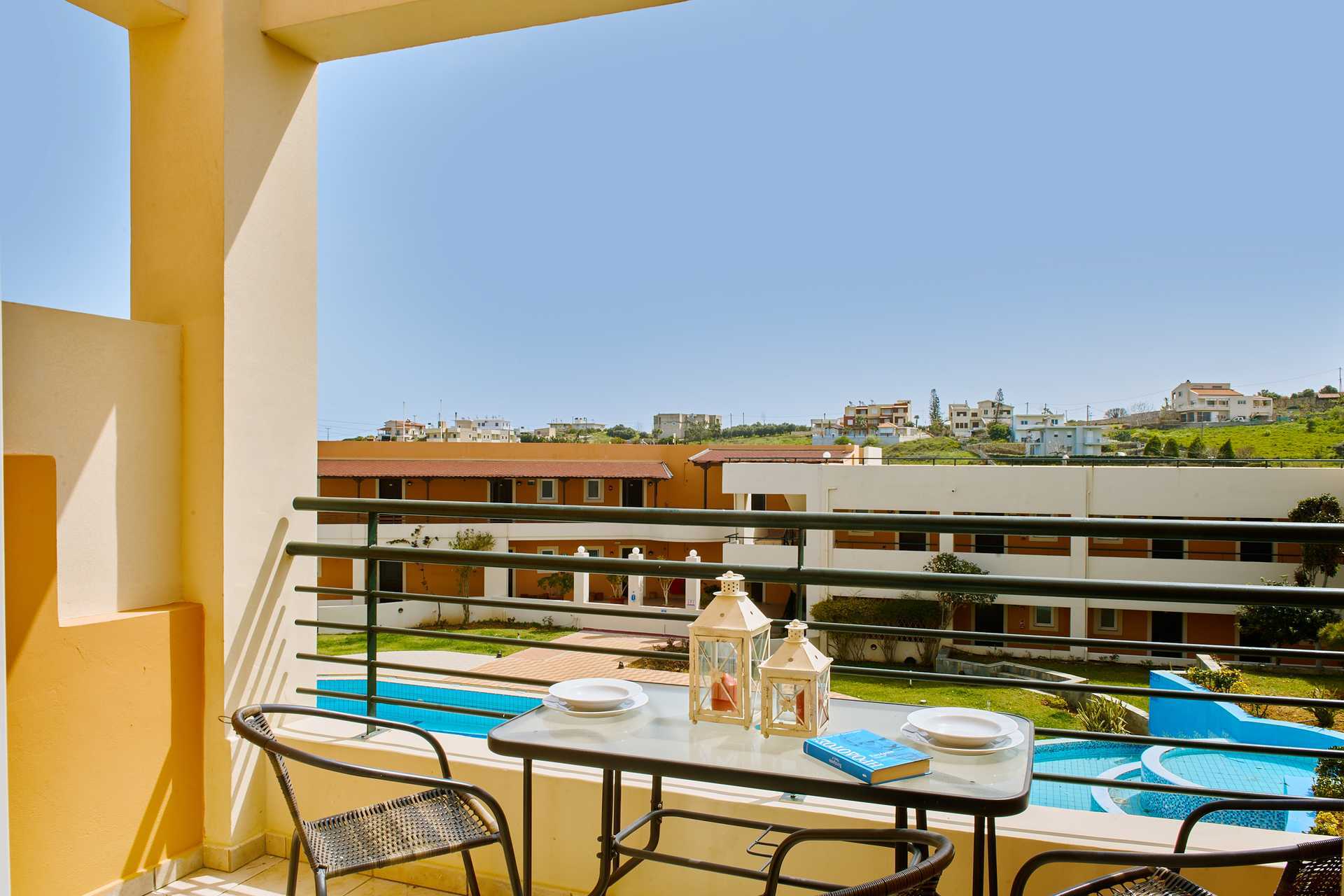 Trerumslägenhet med balkong och poolutsikt. Två sovrum och ett kombinerat vardagsrum/minikök. Två enkelsängar i varje sovrum. Möjlighet till extrabädd i bäddsoffa eller i hopfällbar säng. Vissa lägenheter har nivåskillnader med några trappsteg. Minikök med kokplattor, kylskåp, kaffebryggare, mikrovågsugn, vattenkokare, brödrost och enkel köksutrustning. Wifi, luftkonditionering och deponering ingår. Tv med internationella kanaler. Hårtork. Badrum med badkar eller dusch samt wc. Städning 6 ggr/vecka.