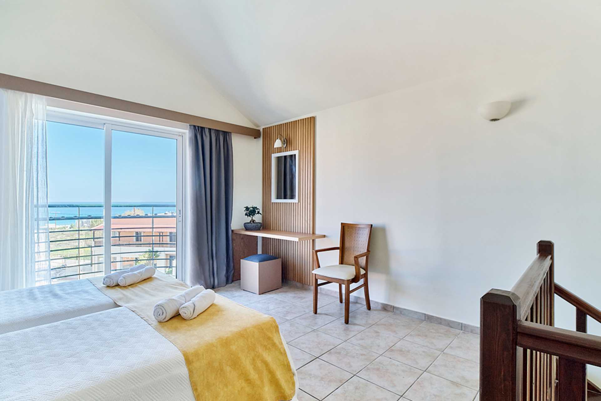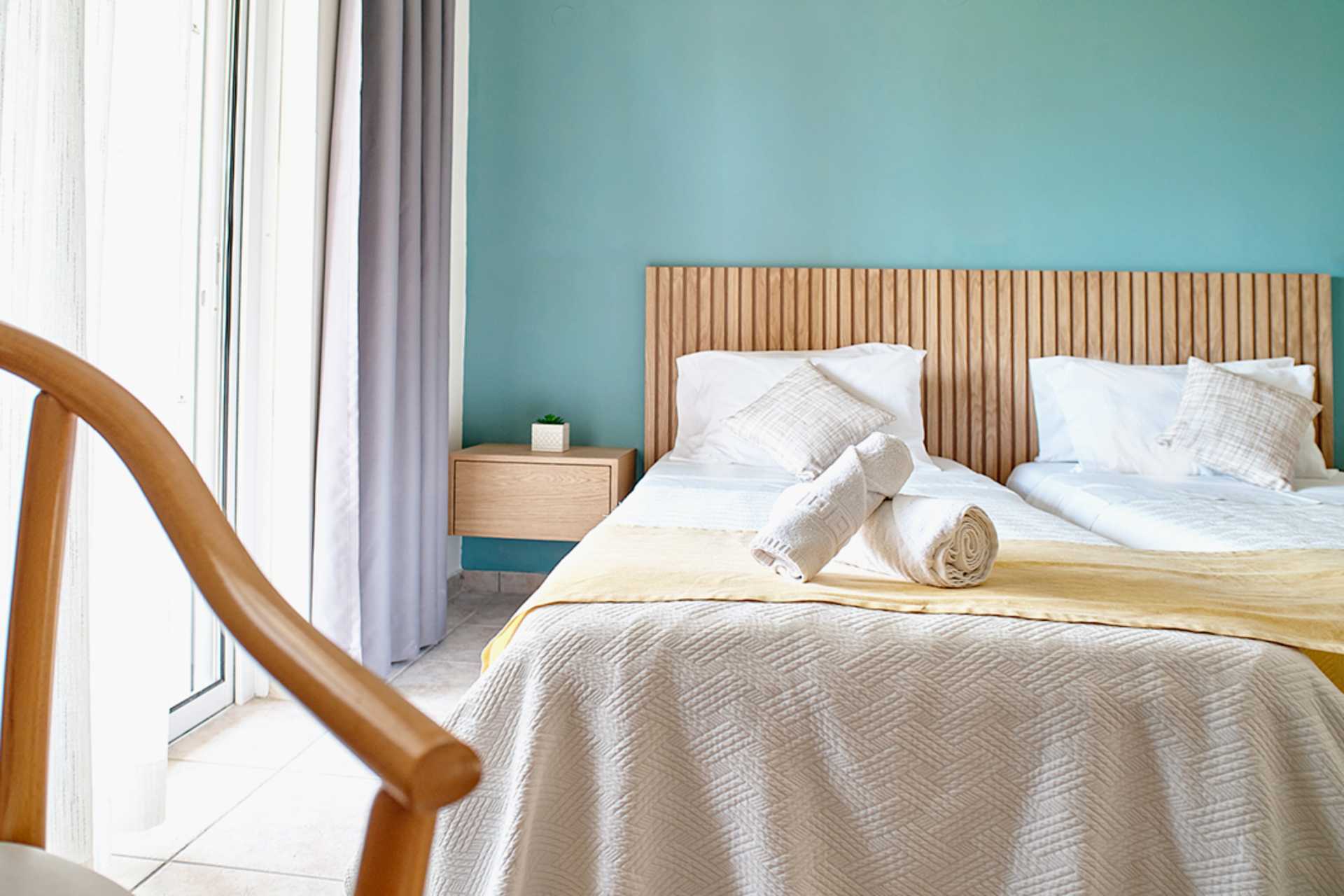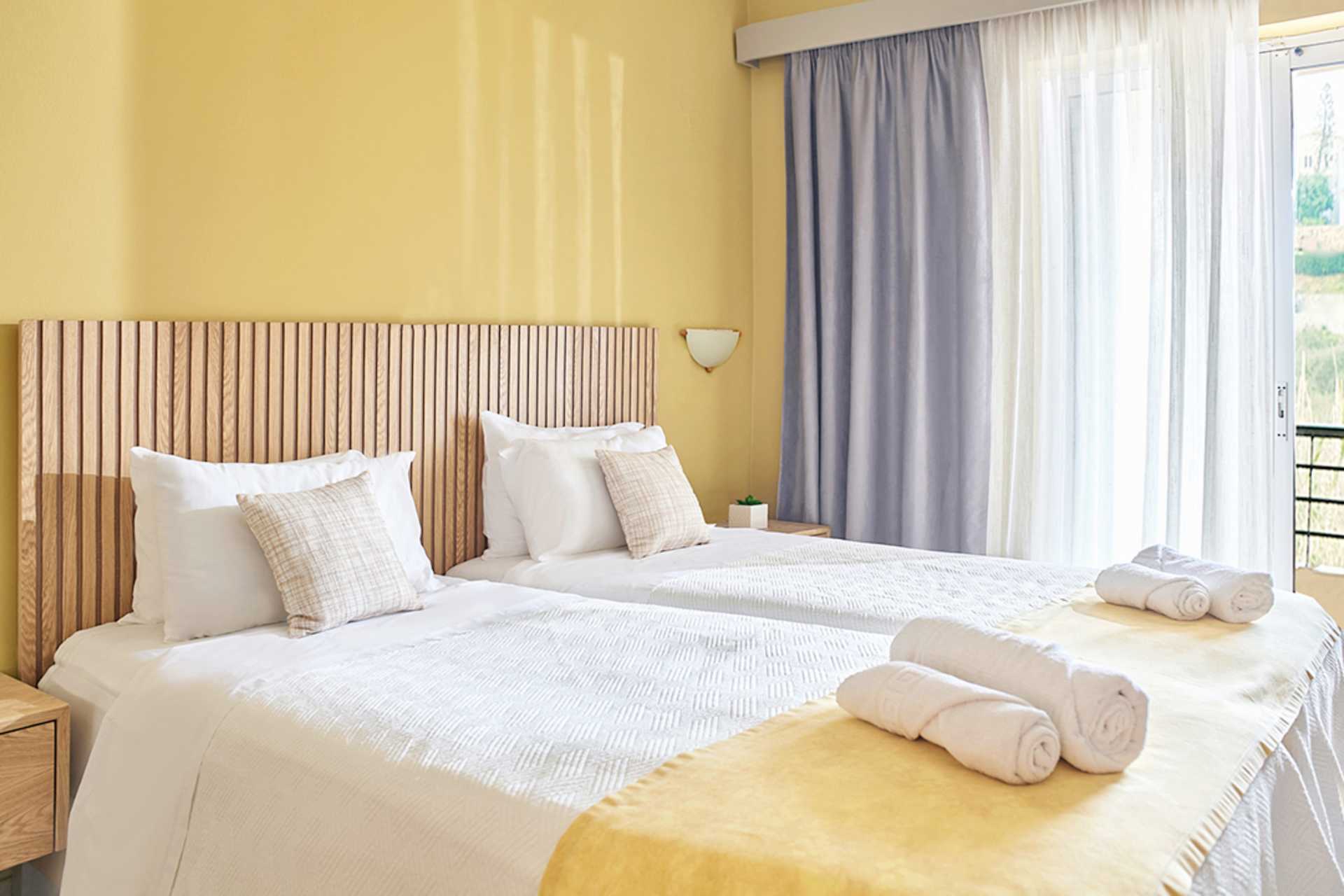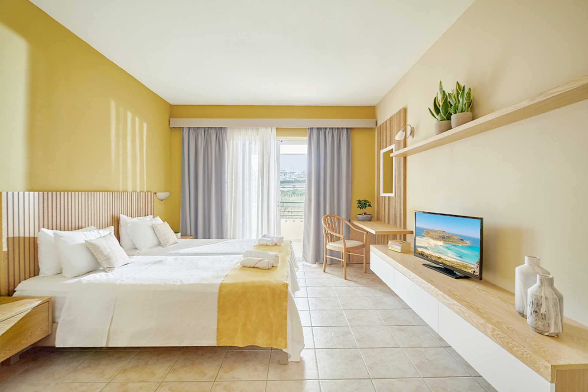 Trerumslägenhet med balkong och poolutsikt. Två sovrum och ett kombinerat vardagsrum/minikök. Två enkelsängar i varje sovrum. Möjlighet till extrabädd i bäddsoffa eller i hopfällbar säng. Vissa lägenheter har nivåskillnader med några trappsteg. Minikök med kokplattor, kylskåp, kaffebryggare, mikrovågsugn, vattenkokare, brödrost och enkel köksutrustning. Wifi, luftkonditionering och deponering ingår. Tv med internationella kanaler. Hårtork. Badrum med badkar eller dusch samt wc. Städning 6 ggr/vecka.