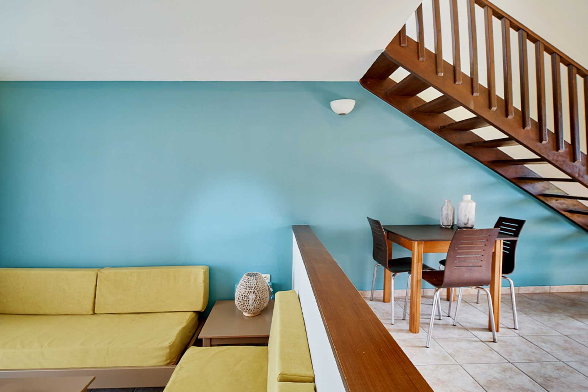 Tvårumslägenhet i etage med balkong och poolutsikt. I entréplan finns ett vardagsrum med två bäddsoffor kombinerat med ett minikök samt ett badrum med hårtork, badkar eller dusch och wc samt en balkong. En trappa upp finns ett sovloft med två enkelsängar, ett badrum med hårtork, badkar eller dusch samt wc och en balkong. Öppen planlösning mellan våningarna. Wifi, luftkonditionering och deponering ingår. Minikök med kokplattor, kylskåp, kaffebryggare, mikrovågsugn, vattenkokare, brödrost och enkel köksutrustning. Tv med internationella kanaler. Städning 6 ggr/vecka.