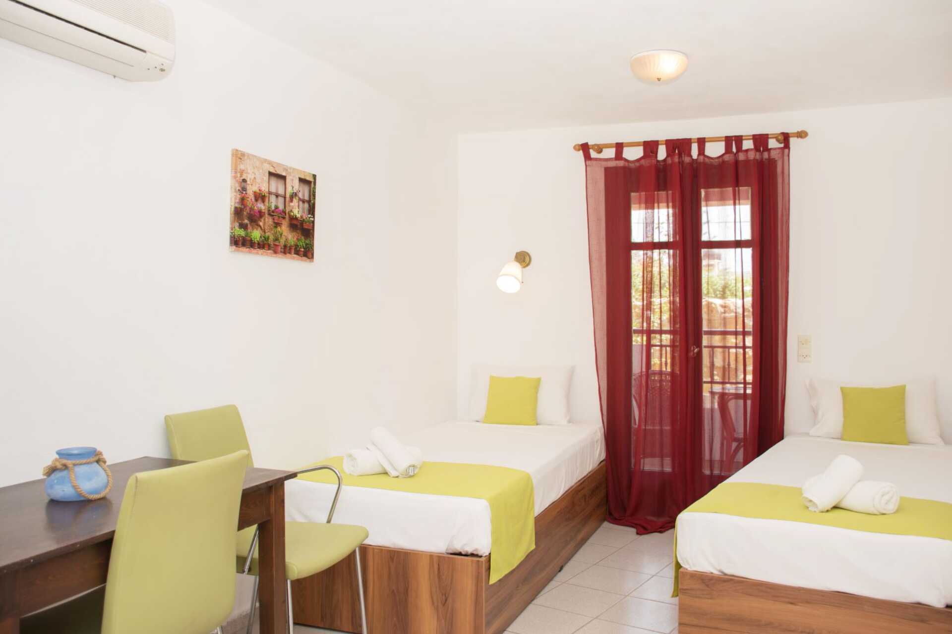 Enrumslägenhet med balkong eller terrass. Sovrum kombinerat med minikök. En dubbelsäng eller två enkelsängar. Minikök med kokplattor, kylskåp, vattenkokare och enkel köksutrustning. Wifi ingår. Luftkonditionering och deponering mot avgift. Tv med lokala kanaler. Hårtork. Badrum med dusch och wc. Städning 2 ggr/vecka.