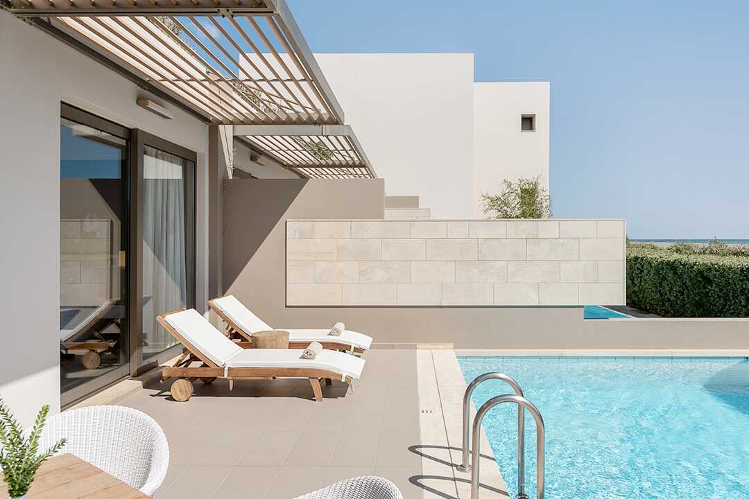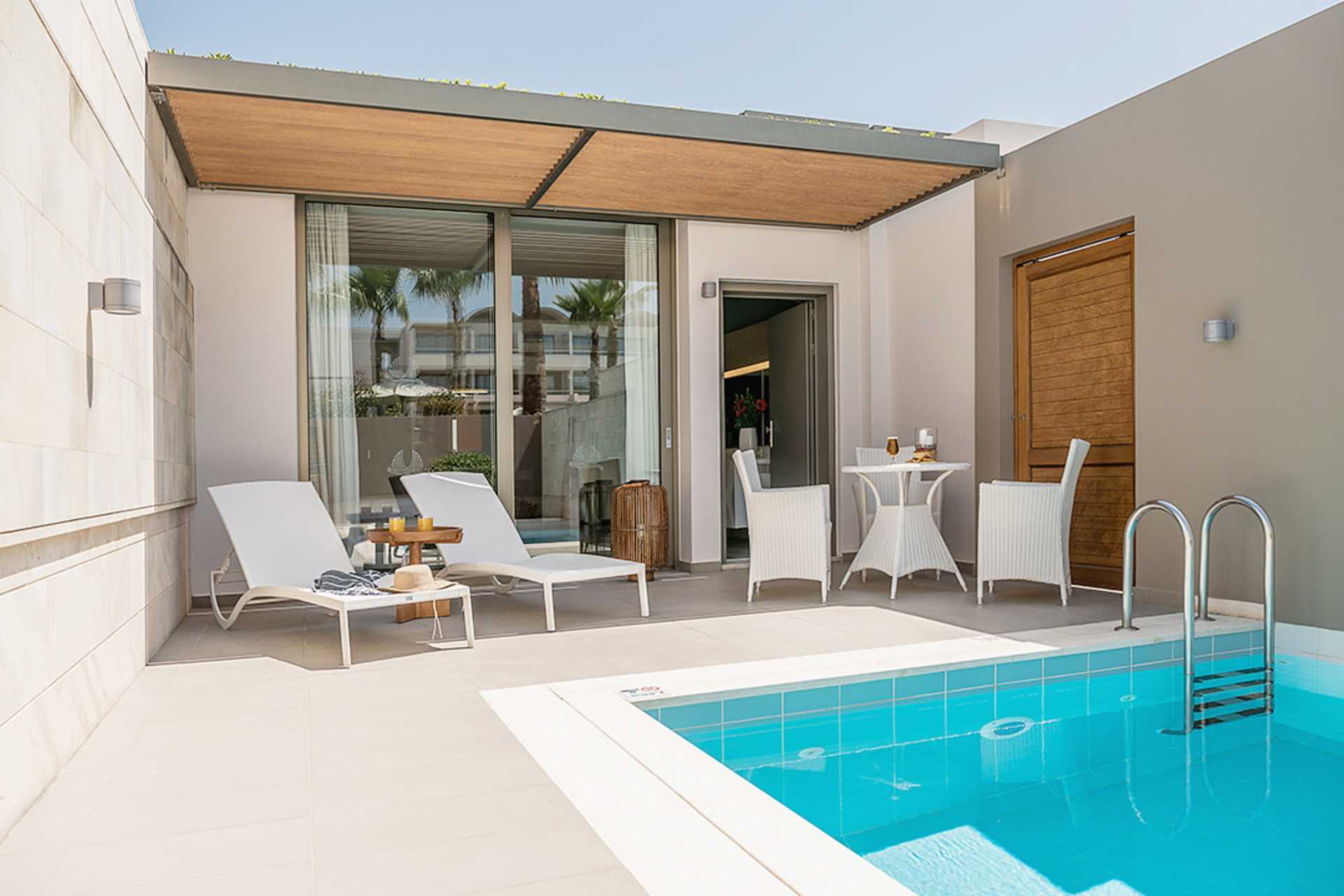Dubbelrum med privat pool på markterrassen. Stege ner i poolen. På terrassen finns solstolar samt bord och stolar. En dubbelsäng eller två enkelsängar. Wifi, luftkonditionering och deponering ingår. Minibar mot avgift. Vattenkokare samt kaffe och te. Tv med internationella kanaler. Hårtork. Badrockar och tofflor. Badrum med badkar, separat dusch samt wc. Städning 7 ggr/vecka. Barn under två år räknas in i max antal personer i rummet.