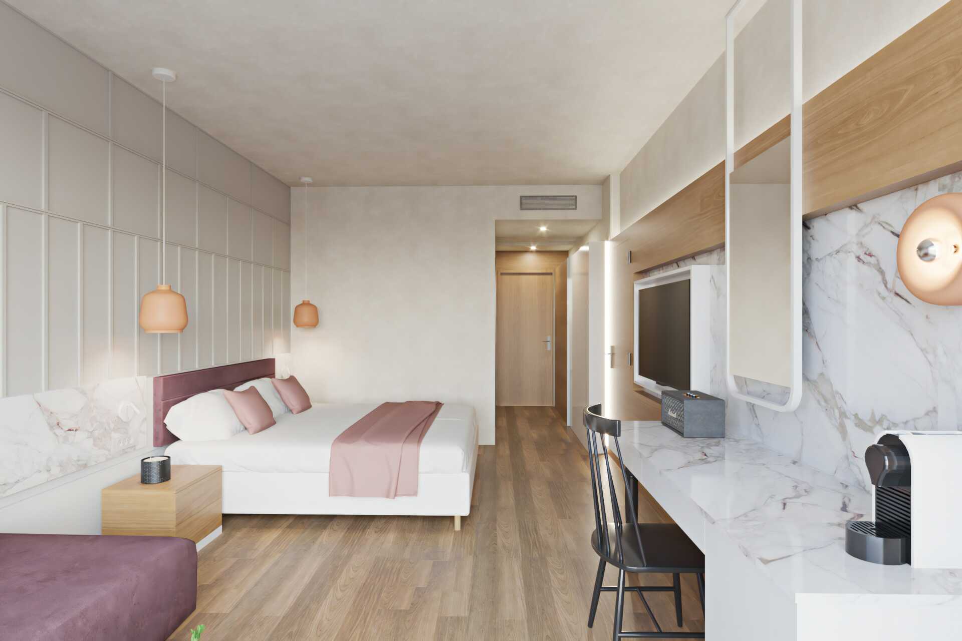 Dubbelrum med balkong eller terrass. En dubbelsäng eller två enkelsängar. Möjlighet till extrabädd i bäddsoffa. Kuddmeny. Wifi, luftkonditionering och deponering ingår. Minibar. Vattenkokare samt kaffe och te. Tv med internationella kanaler. Badrockar och tofflor. Hårtork. Badrum med dusch och wc. Städning 7 ggr/vecka.