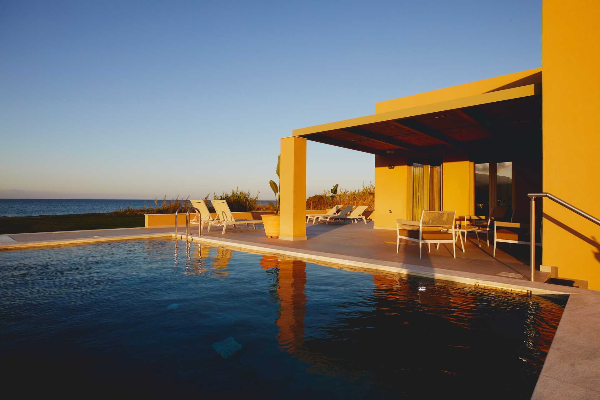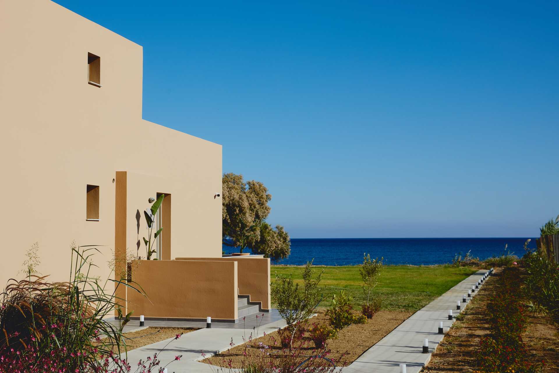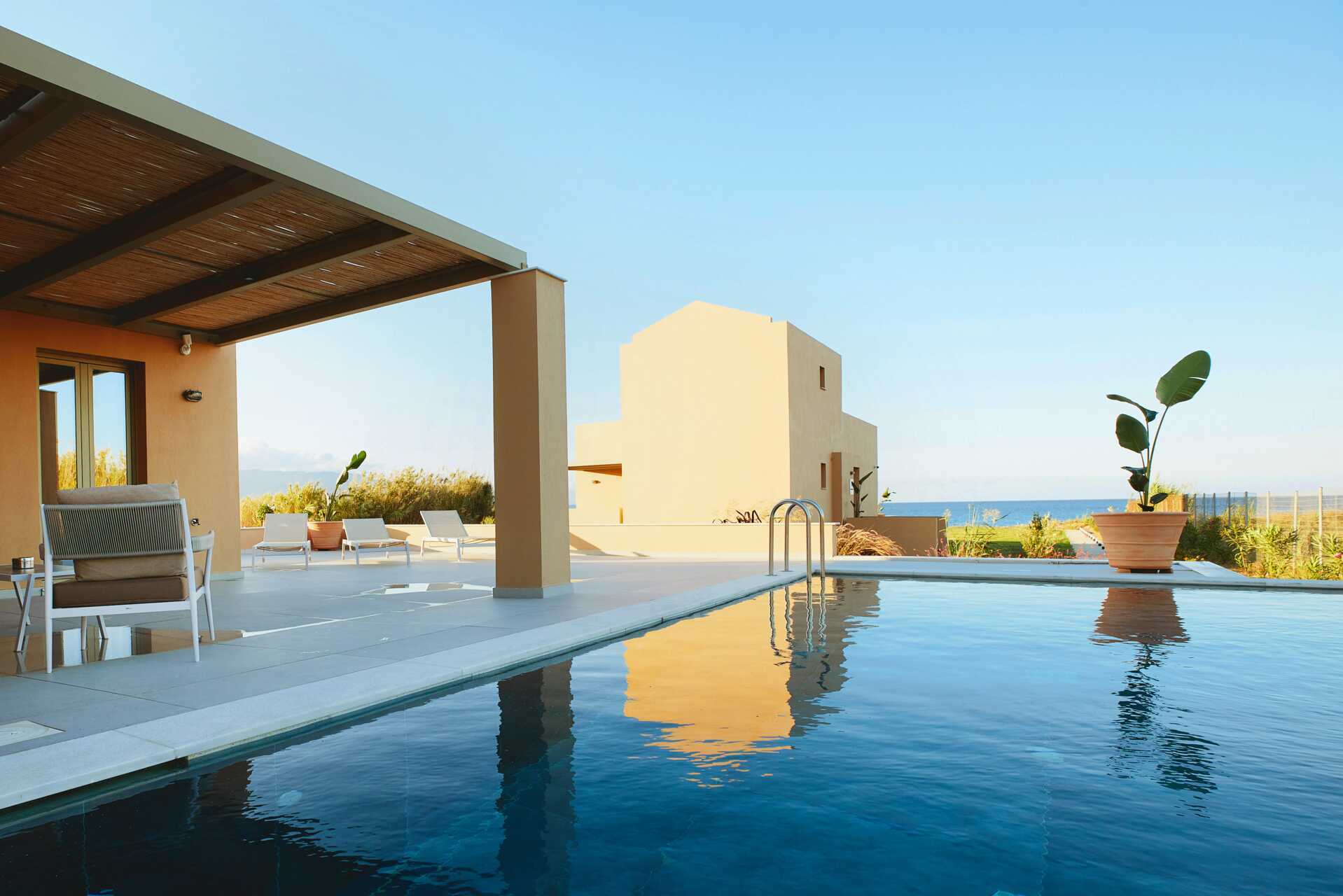Trerumsvilla med balkong och terrass mot havet. På terrassen finns en pool på 30 kvadratmeter (djup 140 cm) med solstolar och parasoller samt poolhanddukar. Två pergolas där du kan njuta av vila och en middag i skuggan. Hotellet kallar villan för Giannoulis Ele Mare. Wifi, luftkonditionering i alla rum och deponering ingår. Tvättmaskin och torktumlare. Strykjärn och strykbräda. Städning 6 ggr/vecka. Städ- och diskutrustning samt disk- och rengöringsmedel.