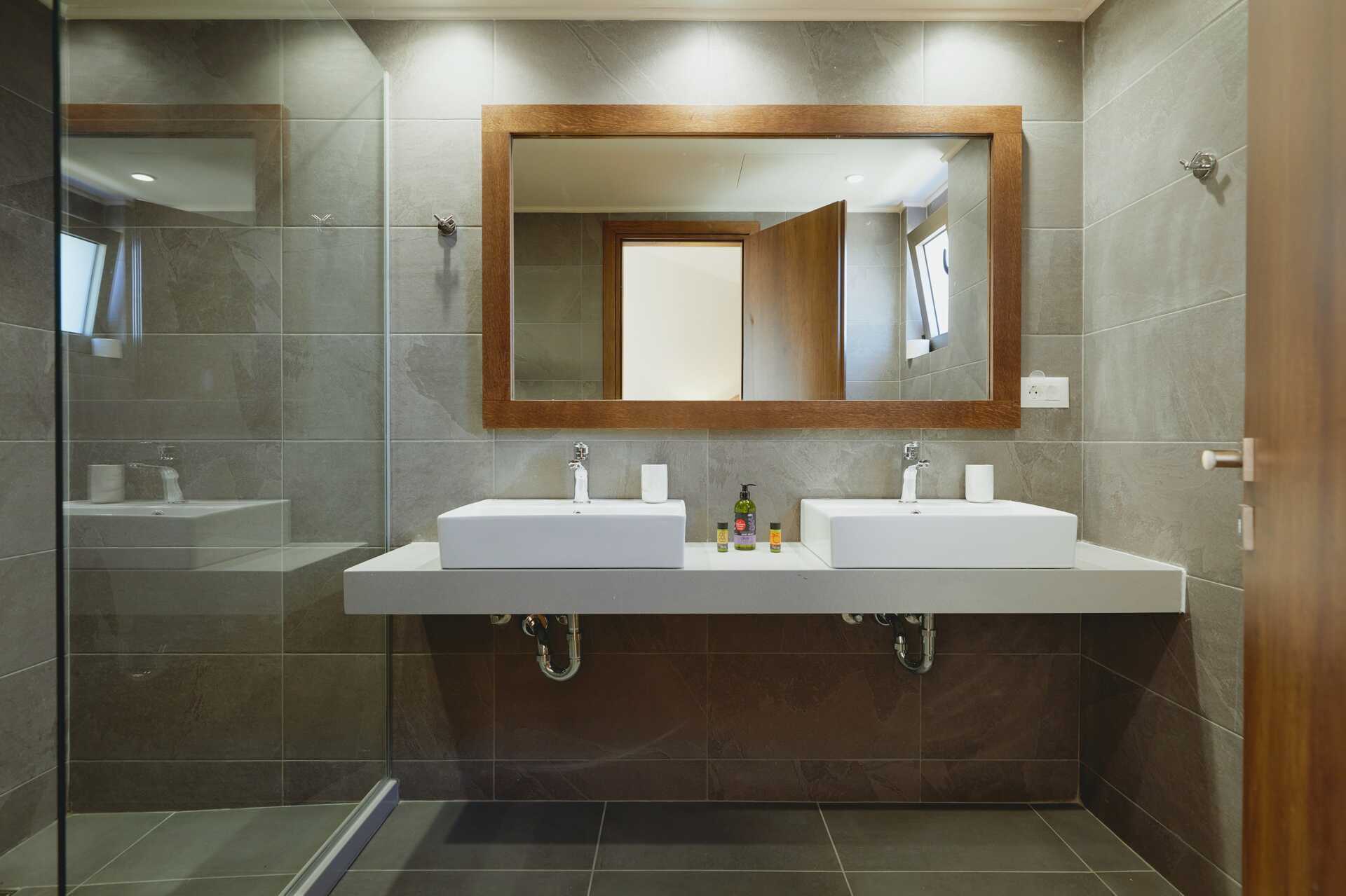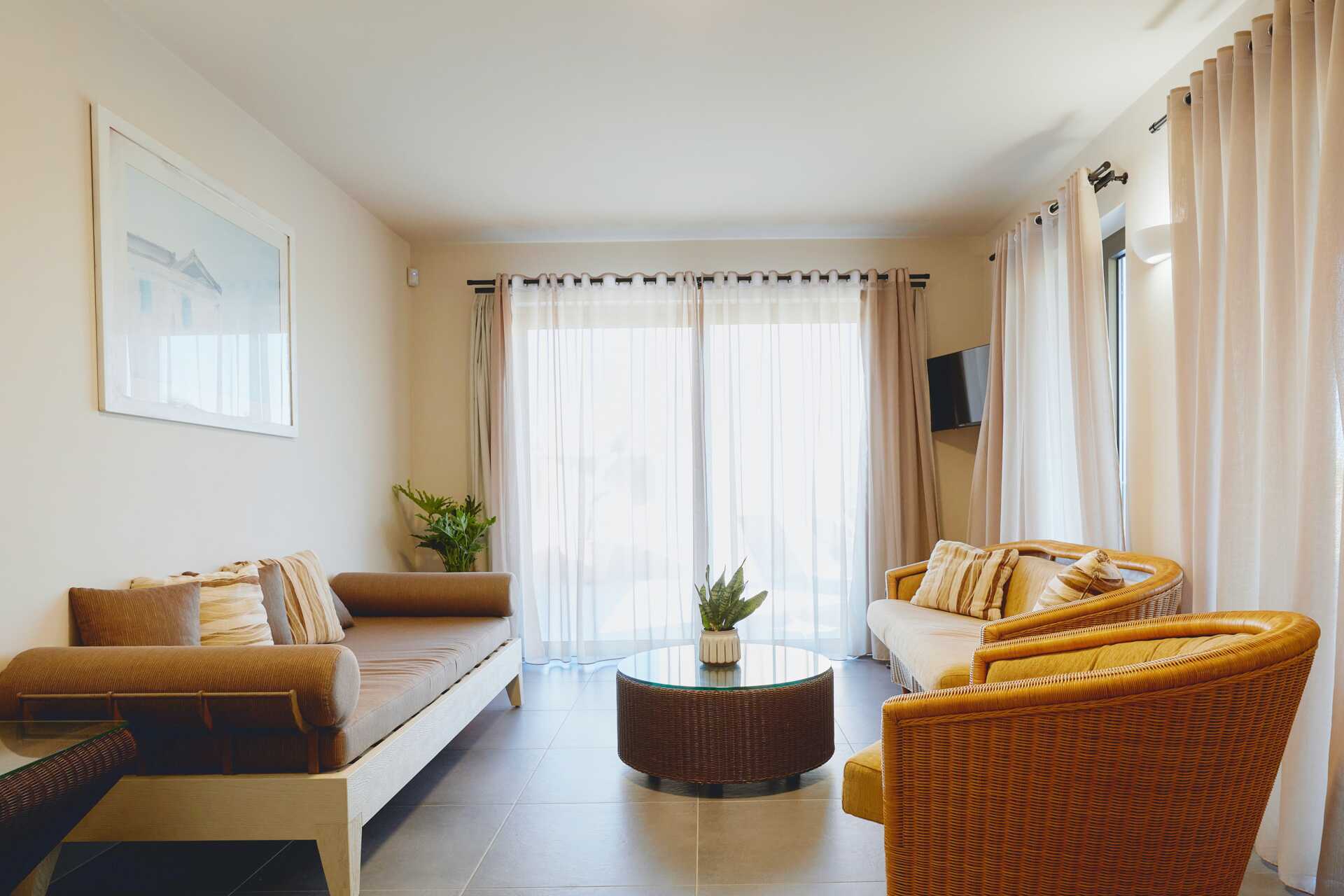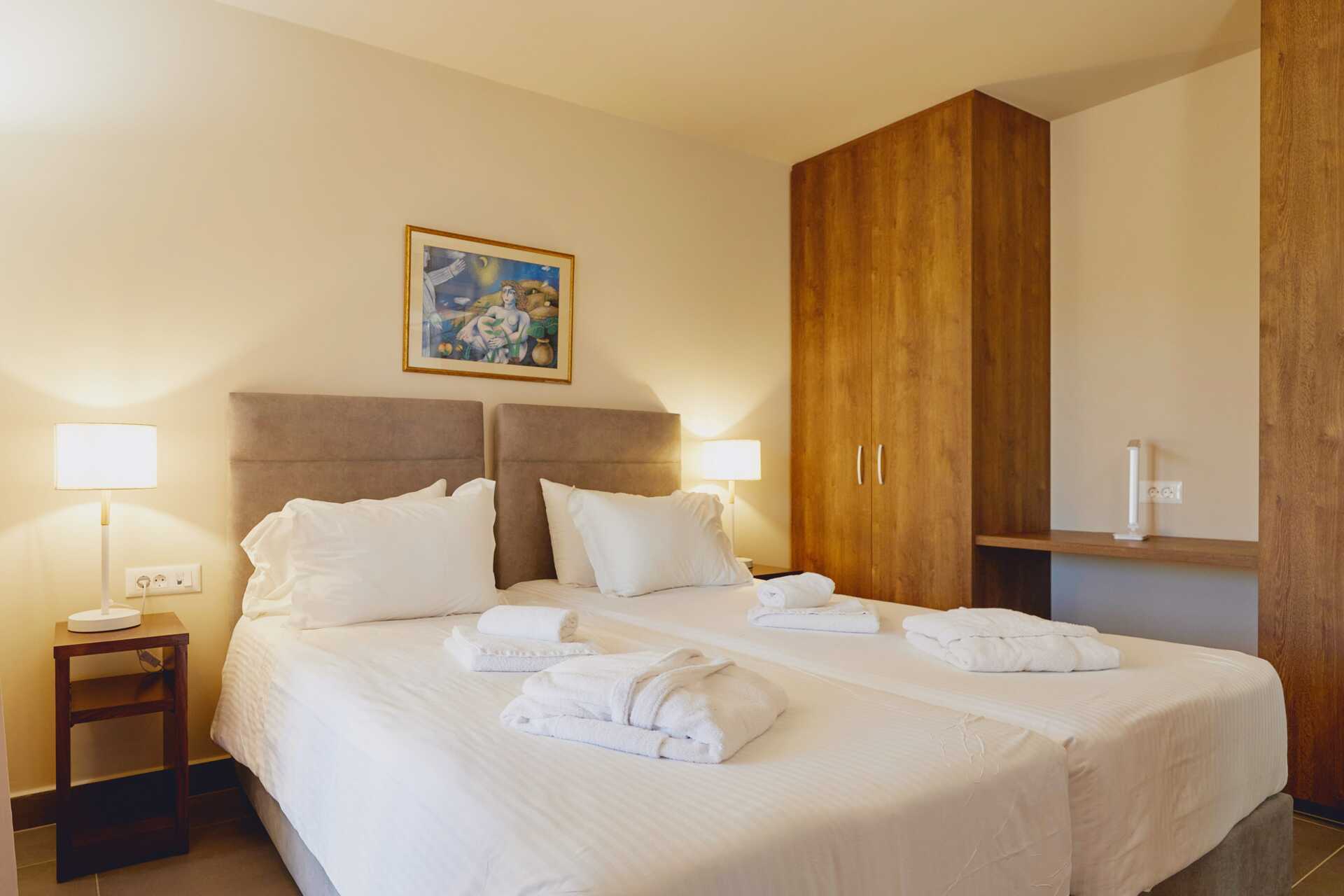 Trerumsvilla med balkong eller terrass med havsutsikt. På terrassen finns en pool på 30 kvadratmeter (djup 140 cm) med solstolar och parasoller samt poolhanddukar. Två pergolas där du kan njuta av vila och en middag i skuggan. Hotellet kallar villan för Giannoulis Ele Sole. Wifi, luftkonditionering i alla rum och deponering ingår. Tvättmaskin och torktumlare. Strykjärn och strykbräda. Städning 6 ggr/vecka. Städ- och diskutrustning samt disk- och rengöringsmedel.