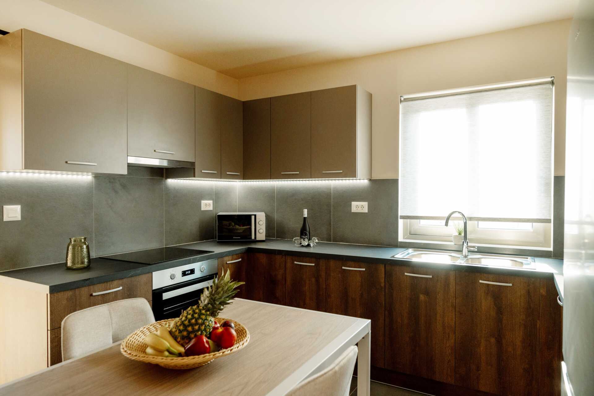 På entréplan finns ett kombinerat stort vardagsrum med ett fullt utrustat kök, en matplats, ett sovrum med två enkelsängar med bäddmadrasser och en tv med internationella kanaler, ett badrum med hårtork, badrockar och tofflor samt dusch och wc. I köket ingår kokplattor, ugn, kylskåp, frys, mikrovågsugn, smörgåsgrill, mixer, kaffebryggare, vattenkokare, kaffemaskin och köksutrustning. I vardagsrummet hittar du soffor och en tv med internationella kanaler. En trappa upp finns ett sovrum med en dubbelsäng med en bäddmadrass, en tv med internationella kanaler samt ett badrum med hårtork, badrockar och tofflor samt dusch och wc.