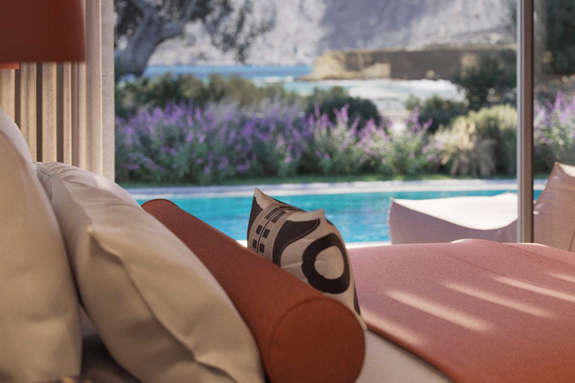 Deluxerum med delad pool på uteplatsen. En dubbelsäng. Wifi, deponering och luftkonditionering ingår. Litet kylskåp. Vattenkokare samt kaffe och te. Tv med internationella kanaler. Badrockar och tofflor. Hårtork. Badrum med dusch och wc. Städning 7 ggr/vecka.