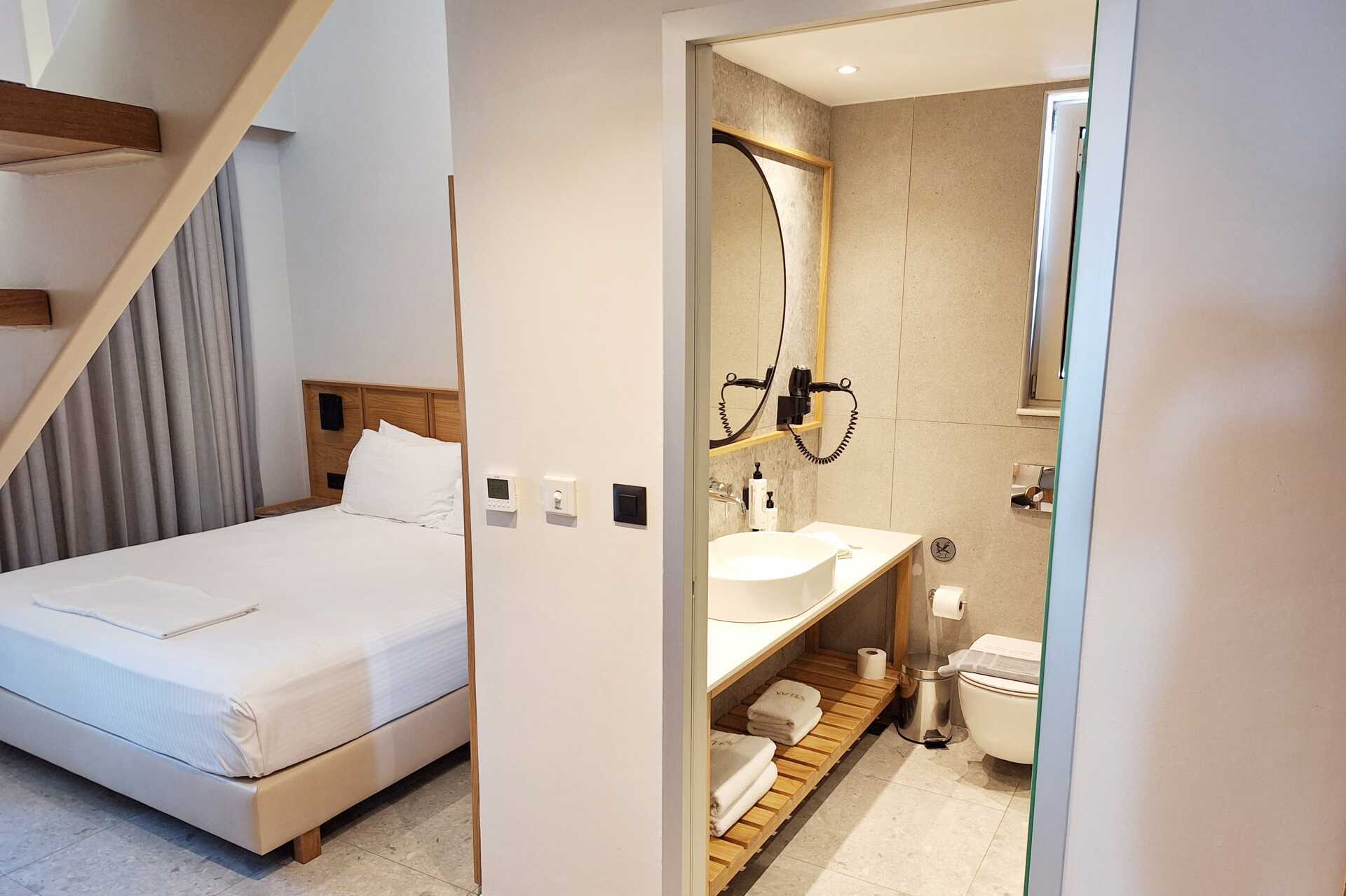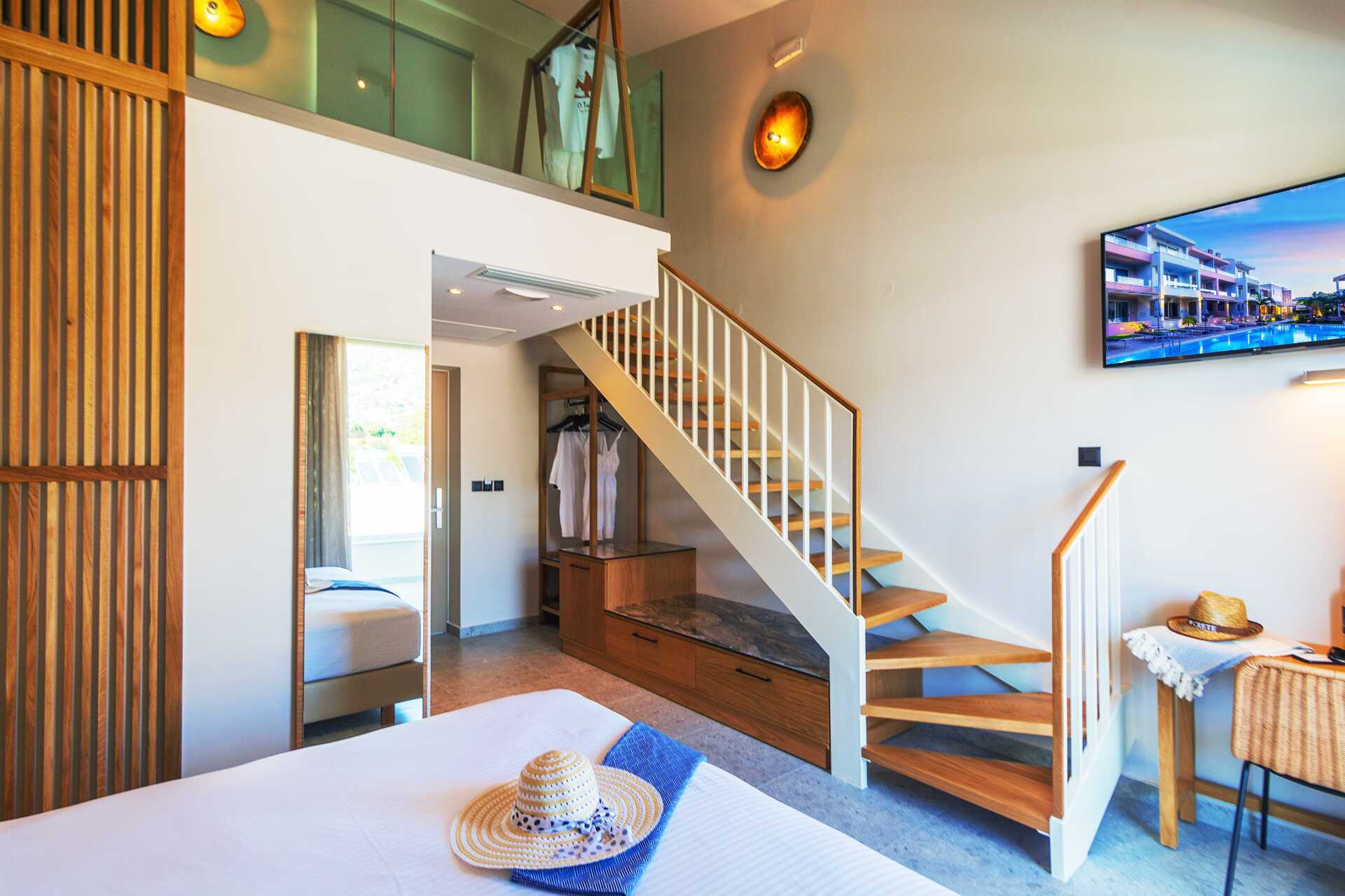 Dubbelrum i etage med balkong eller terrass. På entréplan finns en dubbelsäng och ett badrum med hårtork, dusch och wc. En trappa upp finns ett sovloft med en enkelsäng. Wifi, luftkonditionering och deponering ingår. Kylskåp. Vattenkokare. Tv med internationella kanaler. Hårtork. Städning 6 ggr/vecka.