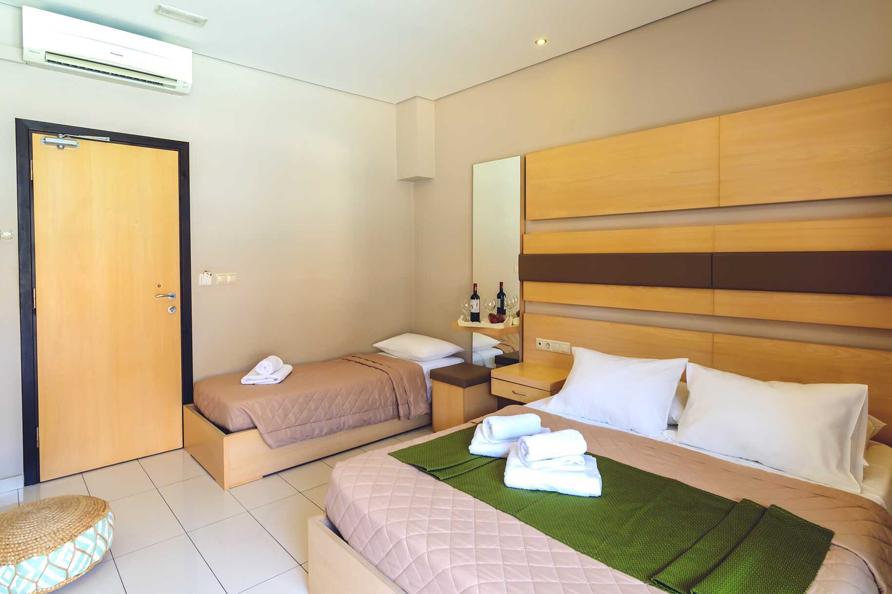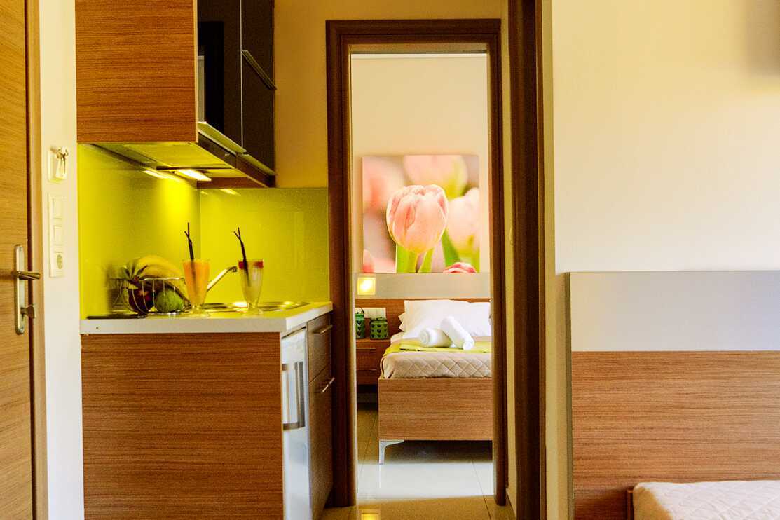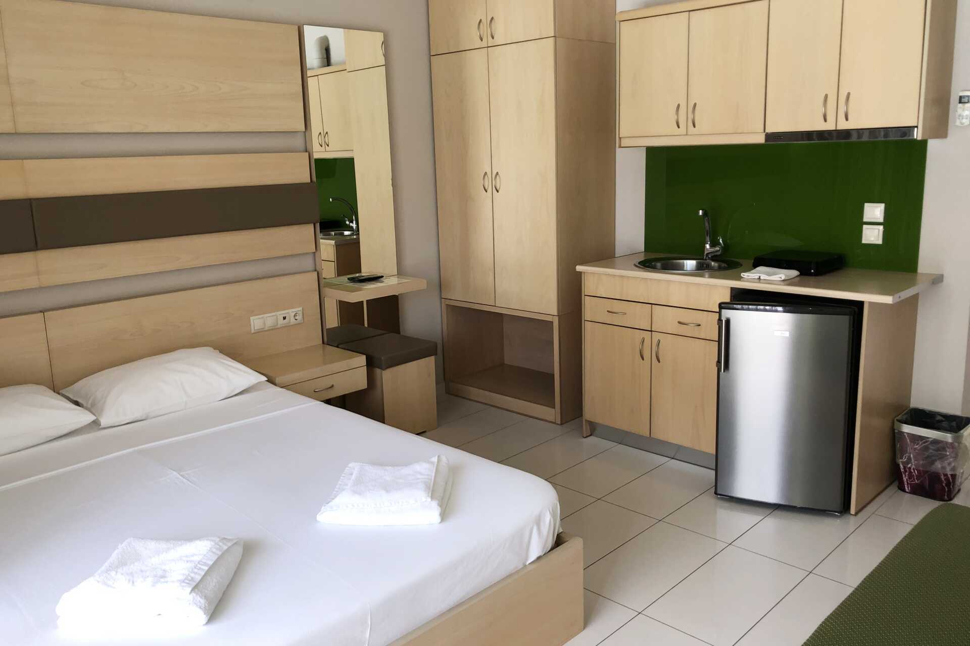 Enrumslägenhet superior med balkong eller terrass. Sovrum kombinerat med minikök. En dubbelsäng. Möjlighet till extrabädd i bäddsoffa. Minikök med kokplattor, kylskåp, vattenkokare och enkel köksutrustning. Wifi, luftkonditionering och deponering ingår. Tv med internationella kanaler. Hårtork. Badrum med dusch och wc. Städning 6 ggr/vecka.