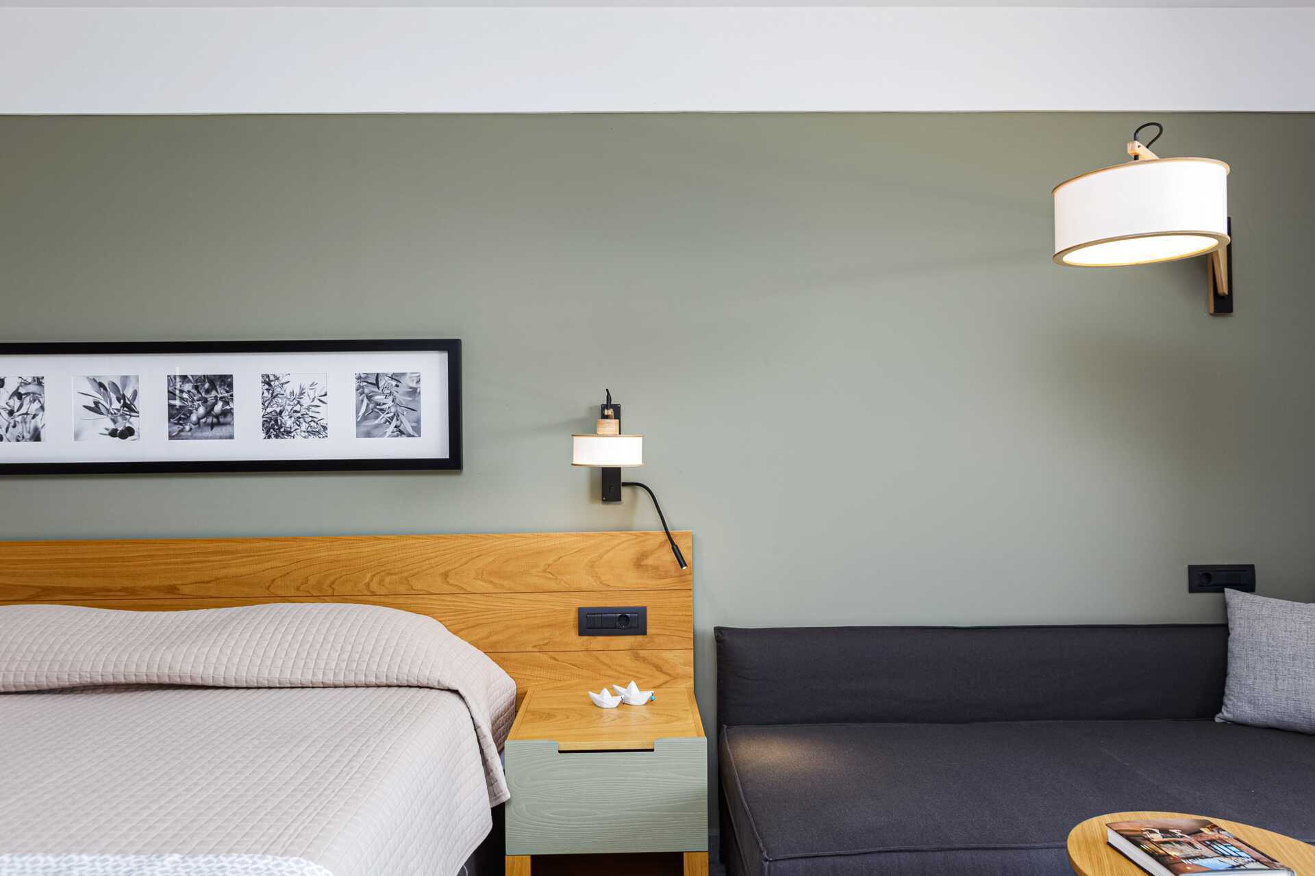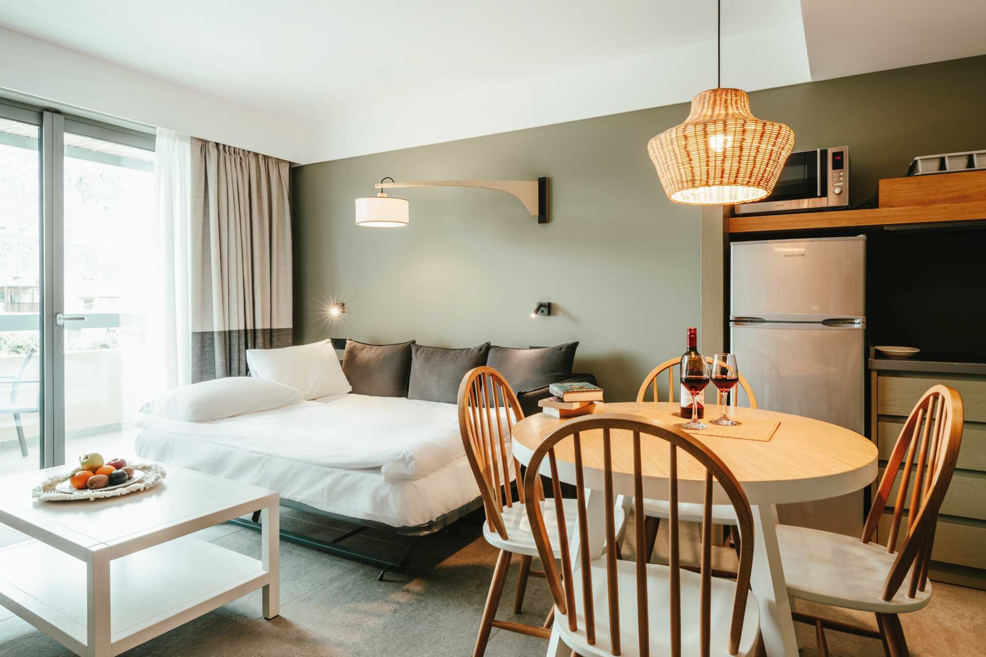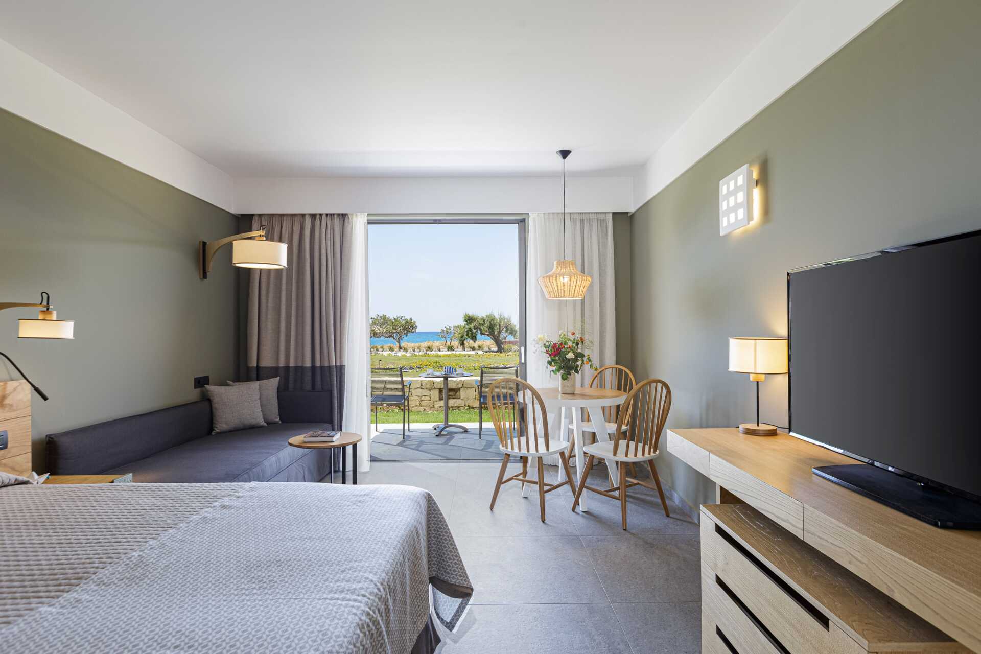 Enrumslägenhet med balkong eller markterrass. Vissa balkonger har havsutsikt eller poolutsikt och vissa markterrasser har poolutsikt eller begränsad havsutsikt. Sovrum med kombinerat minikök. En dubbelsäng eller två enkelsängar. Möjlighet till två extrabäddar i en bäddsoffa med utdragbar säng. Minikök med kylskåp, kokplattor, brödrost, mikrovågsugn, vattenkokare och enkel köksutrustning. Wifi, luftkonditionering och deponering ingår. Tv med internationella kanaler. Hårtork. Badrum med dusch och wc. Städning 7 ggr/vecka.