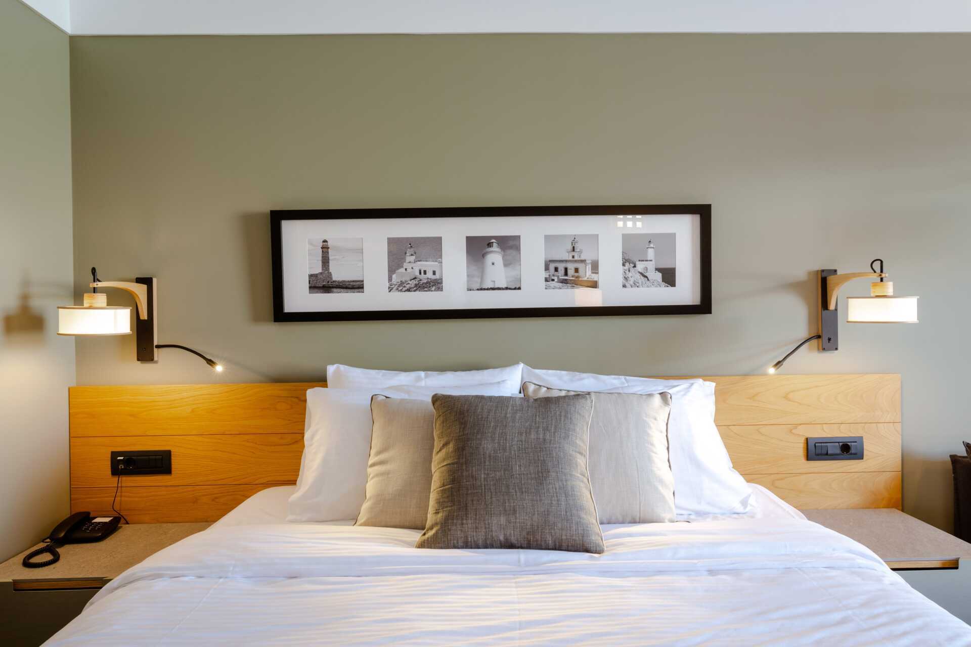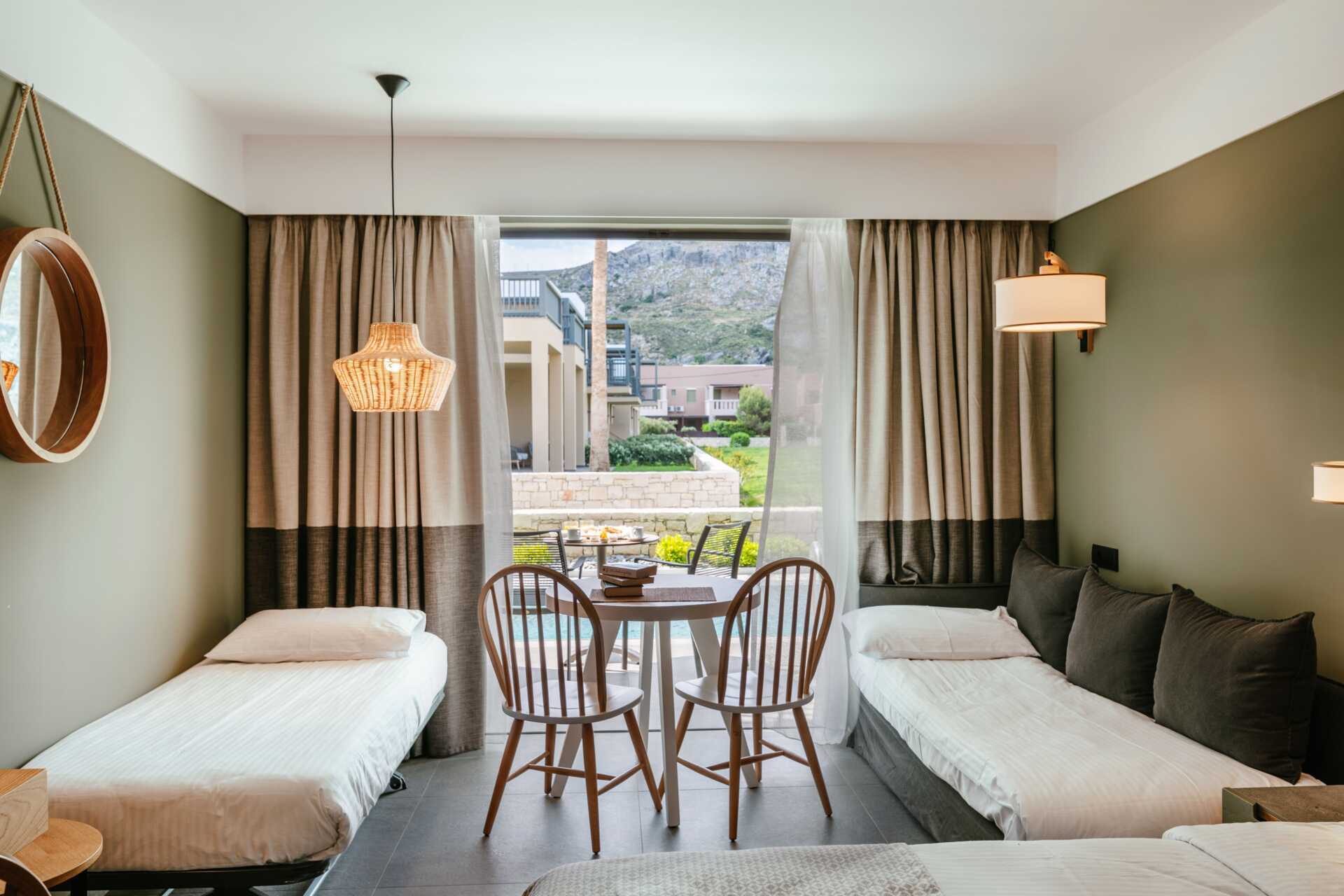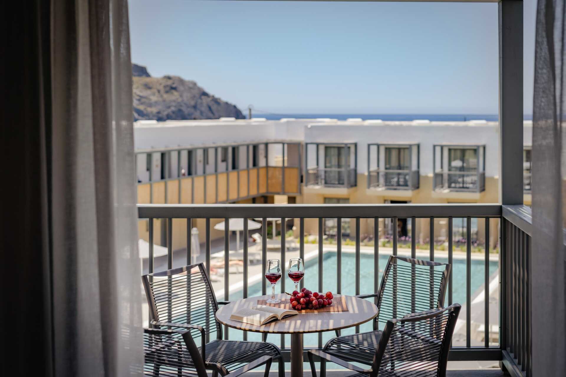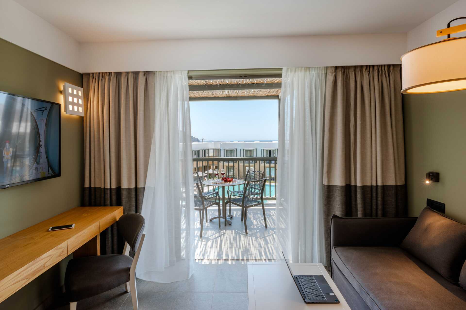 Dubbelrum med balkong eller markterrass. Vissa balkonger har poolutsikt och vissa markterrasser har poolutsikt eller begränsad havsutsikt. En dubbelsäng eller enkelsängar. Möjlighet till extrabädd i bäddsoffa. Litet kylskåp. Wifi, luftkonditionering och deponering ingår. Tv med internationella kanaler. Hårtork. Badrum med dusch och wc. Städning 7 ggr/vecka.
