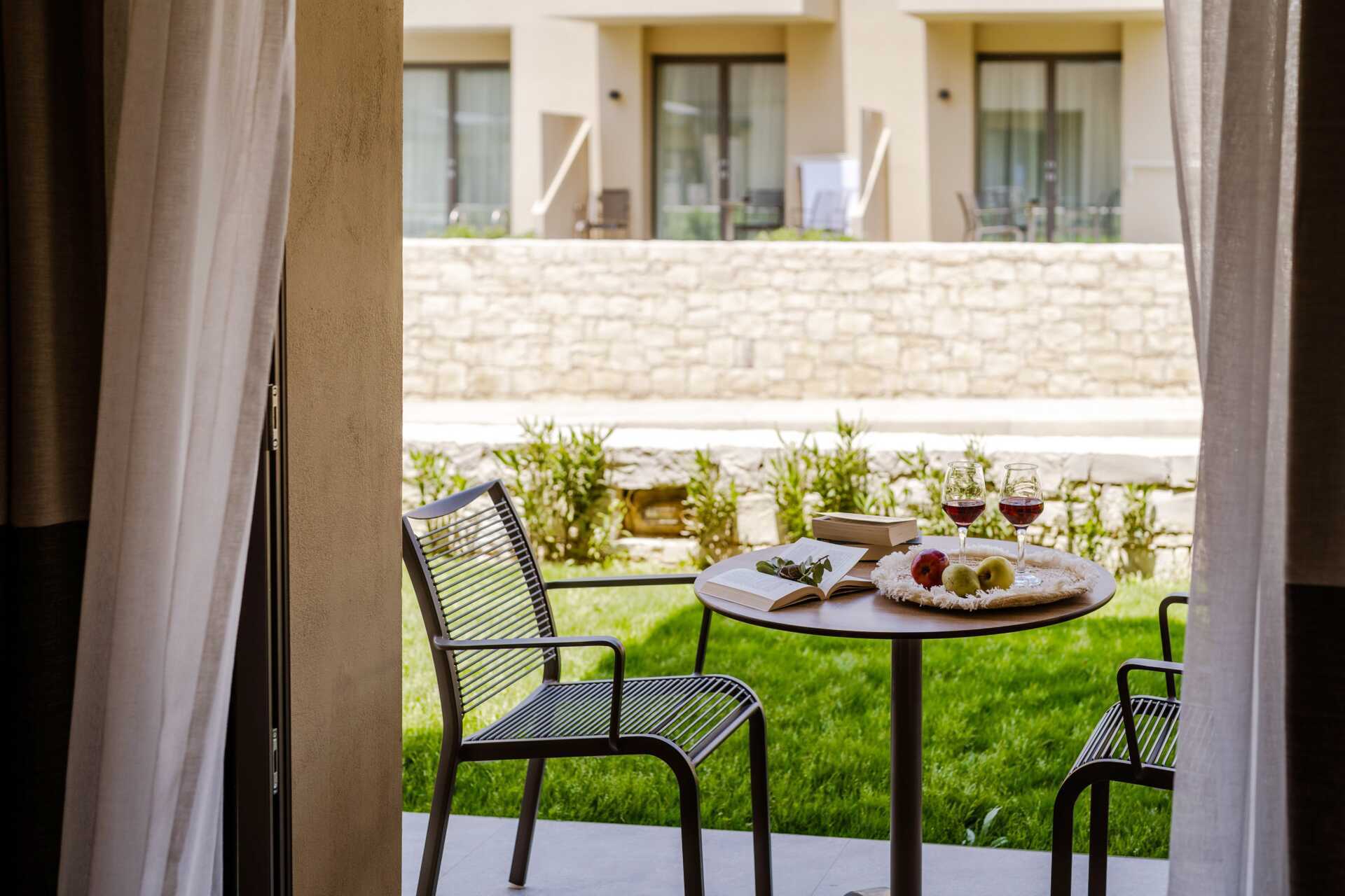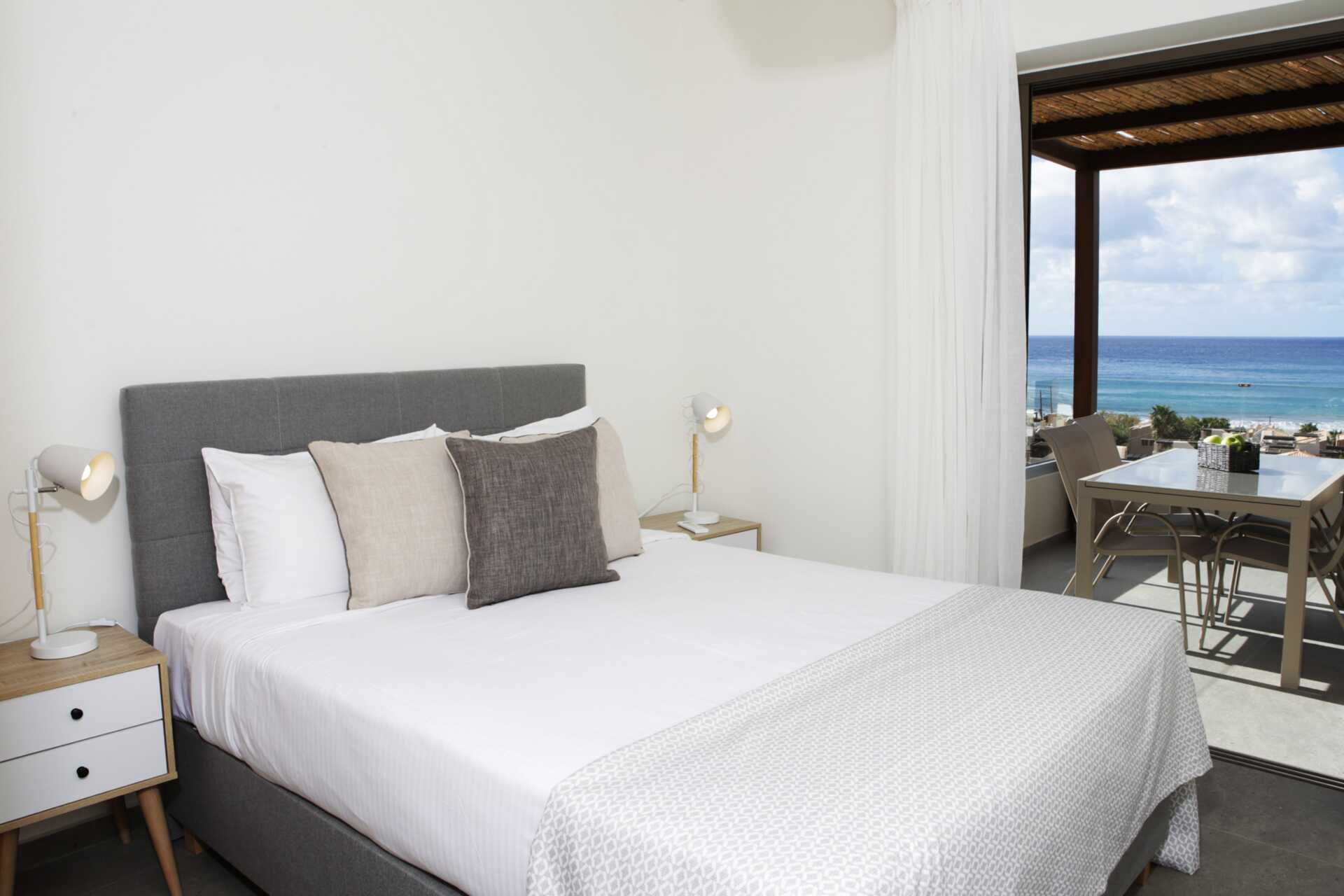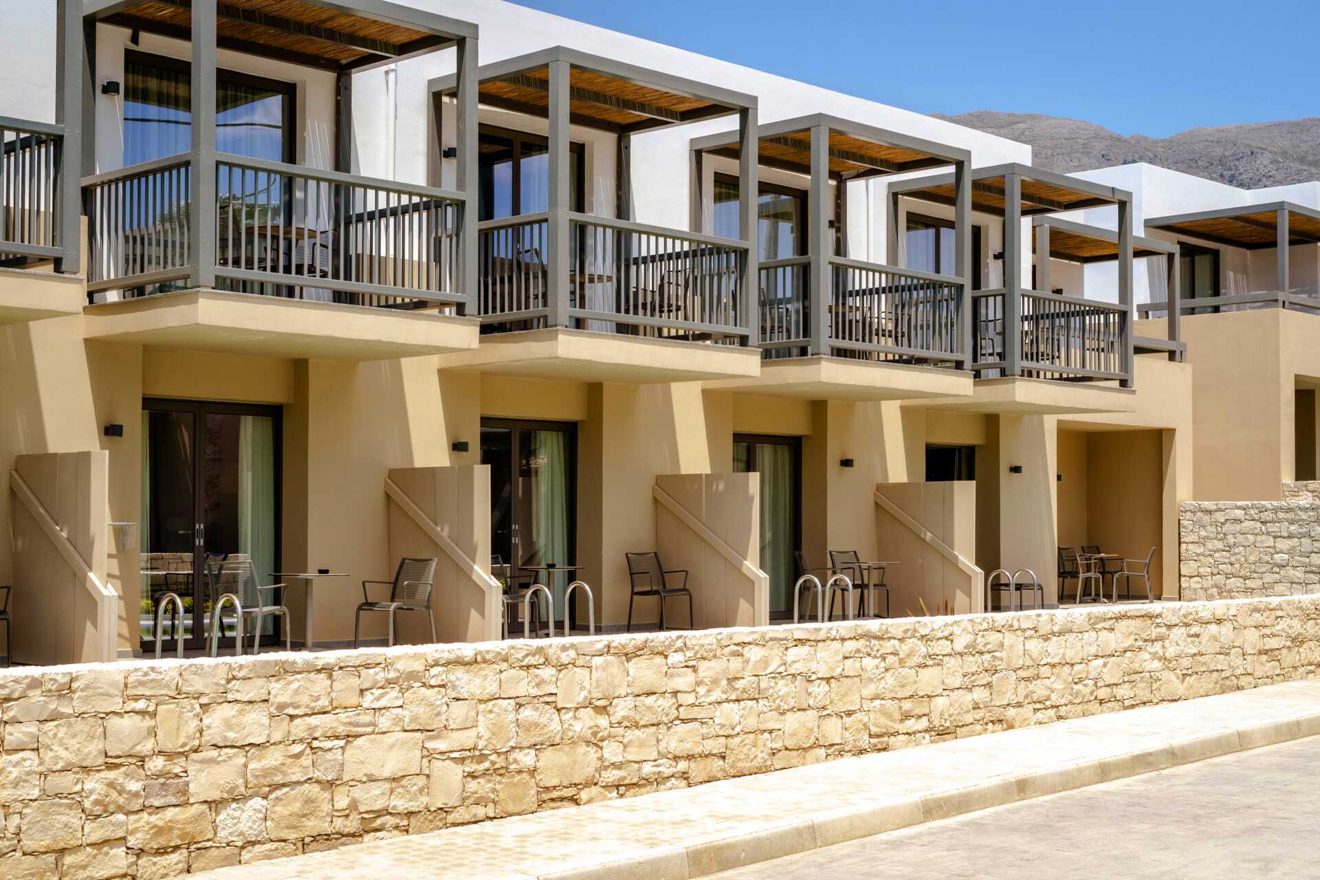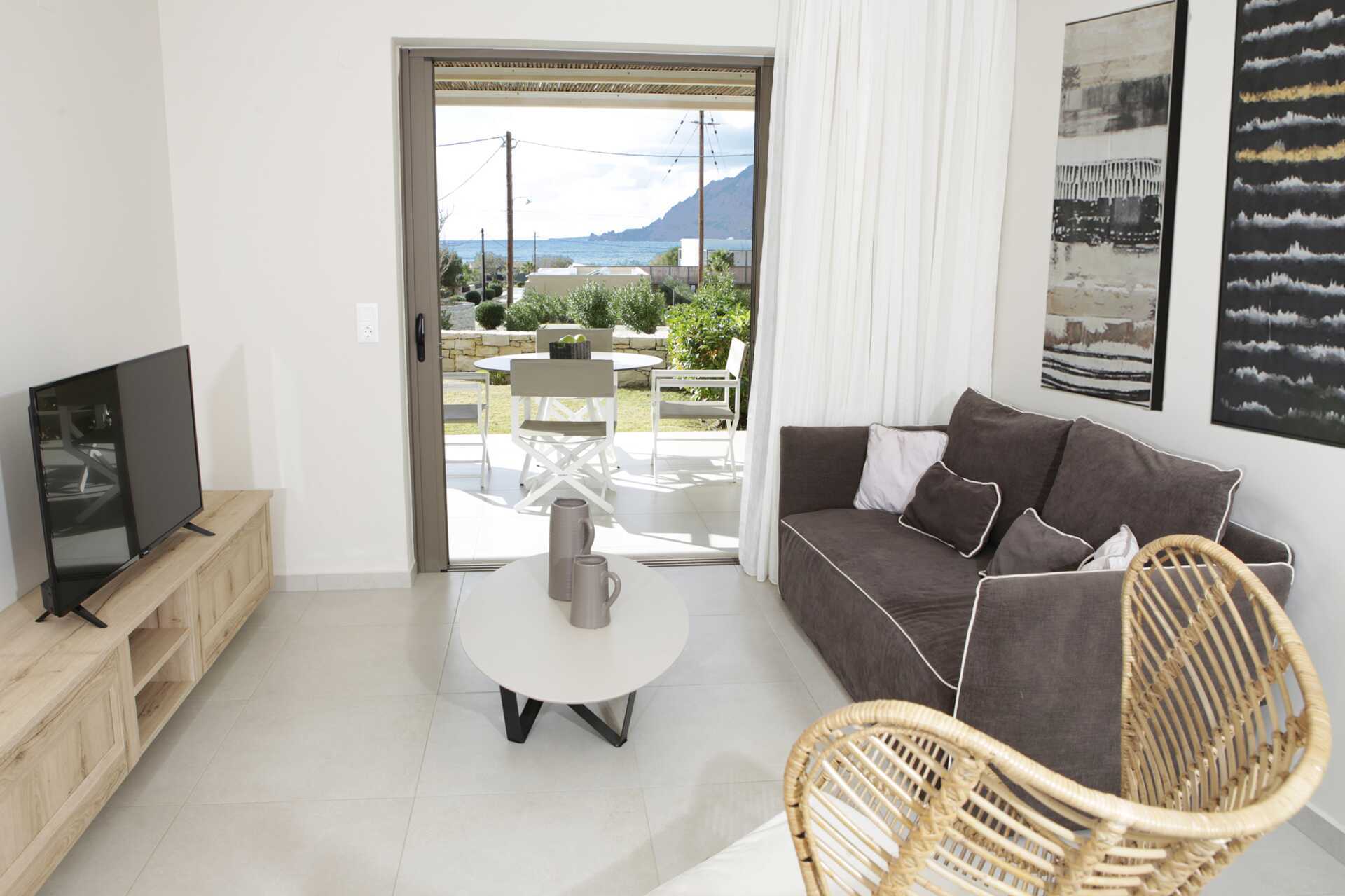 Tvårumslägenhet Premium med markterrass, varav vissa med begränsad havsutsikt. Två solstolar på uteplatsen samt matplats. Sovrum och kombinerat vardagsrum med minikök. En dubbelsäng. Möjlighet till extrabäddar i två bäddsoffor. Minikök med kylskåp och frys, kokplattor, ugn, brödrost, smörgåsgrill, juicepress, vattenkokare, enkel köksutrustning samt Nespresso kaffemaskin med daglig påfyllning av kaffe och te. Wifi, luftkonditionering och deponering ingår. Tv med internationella kanaler. Strykjärn och strykbräda. Hårtork. Badrum med dusch och wc. Städning 7 ggr/vecka.