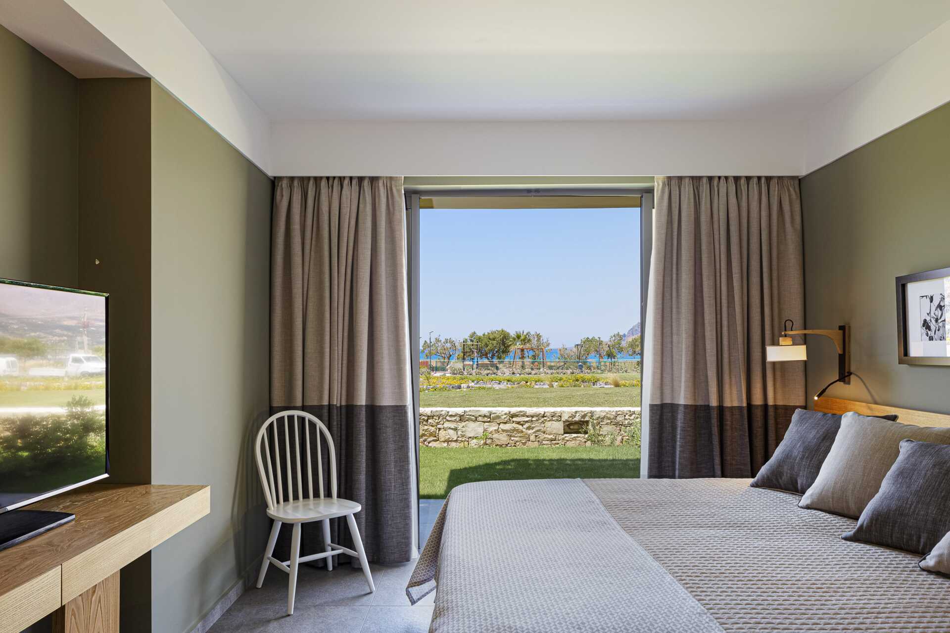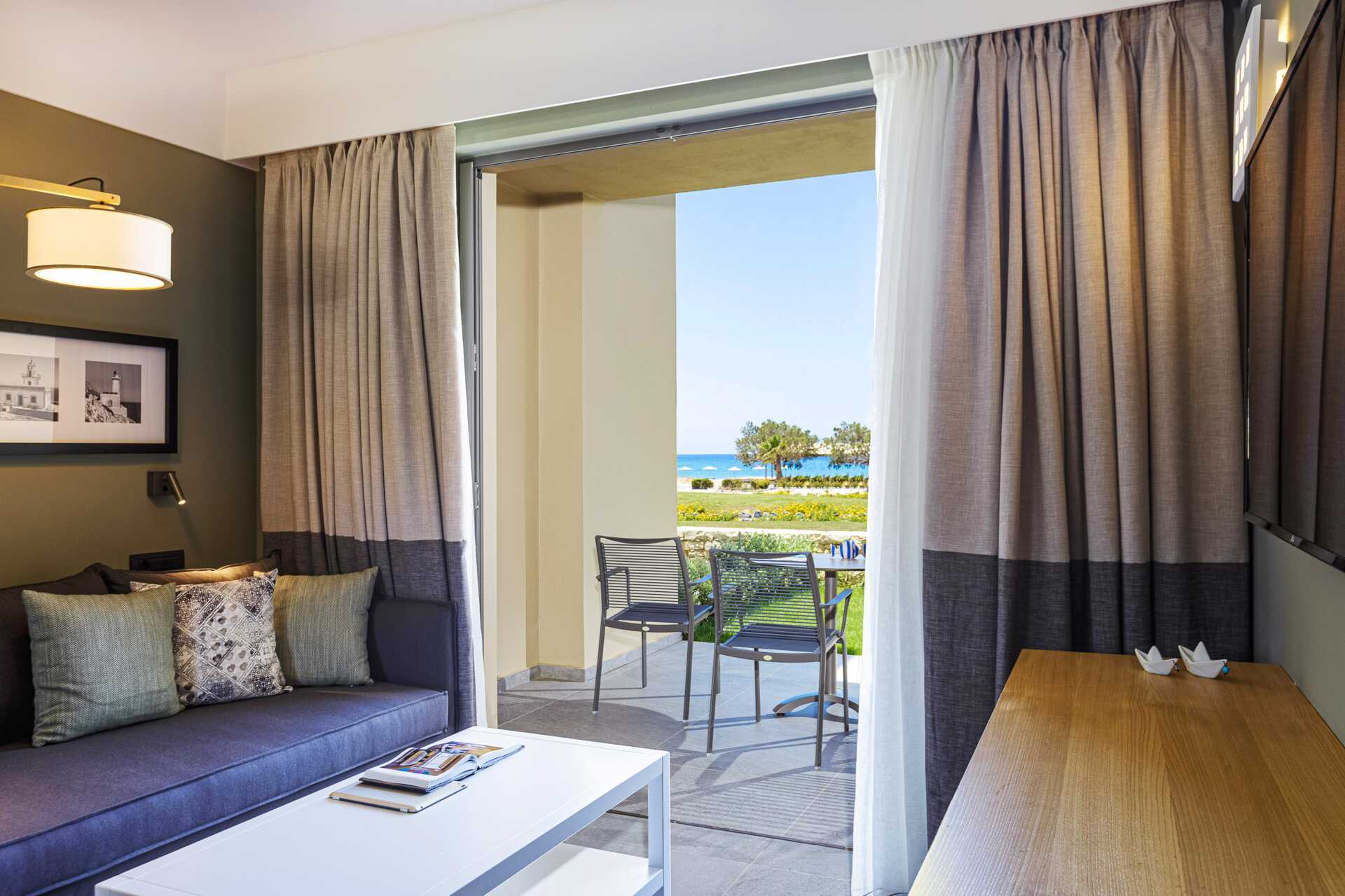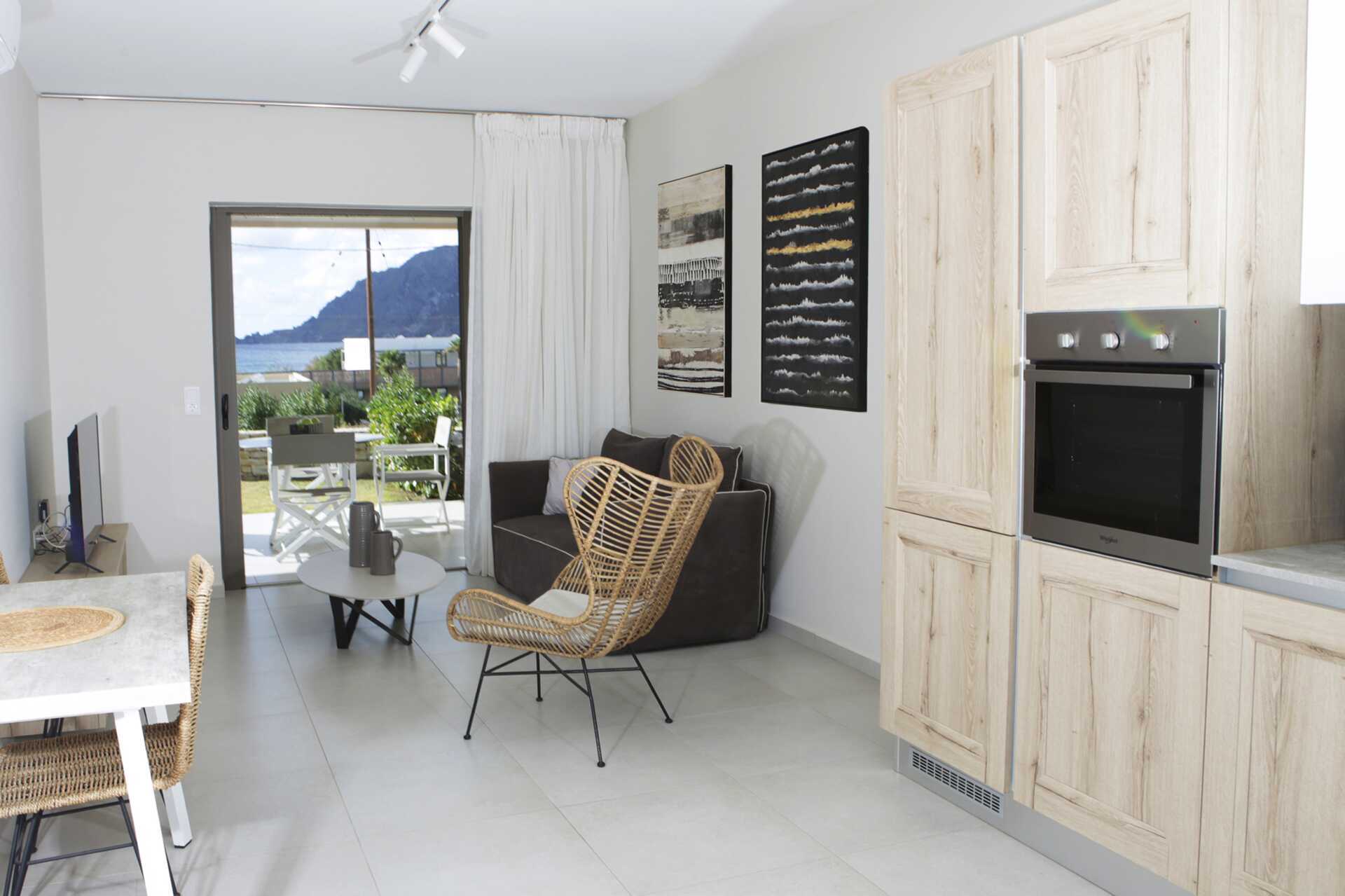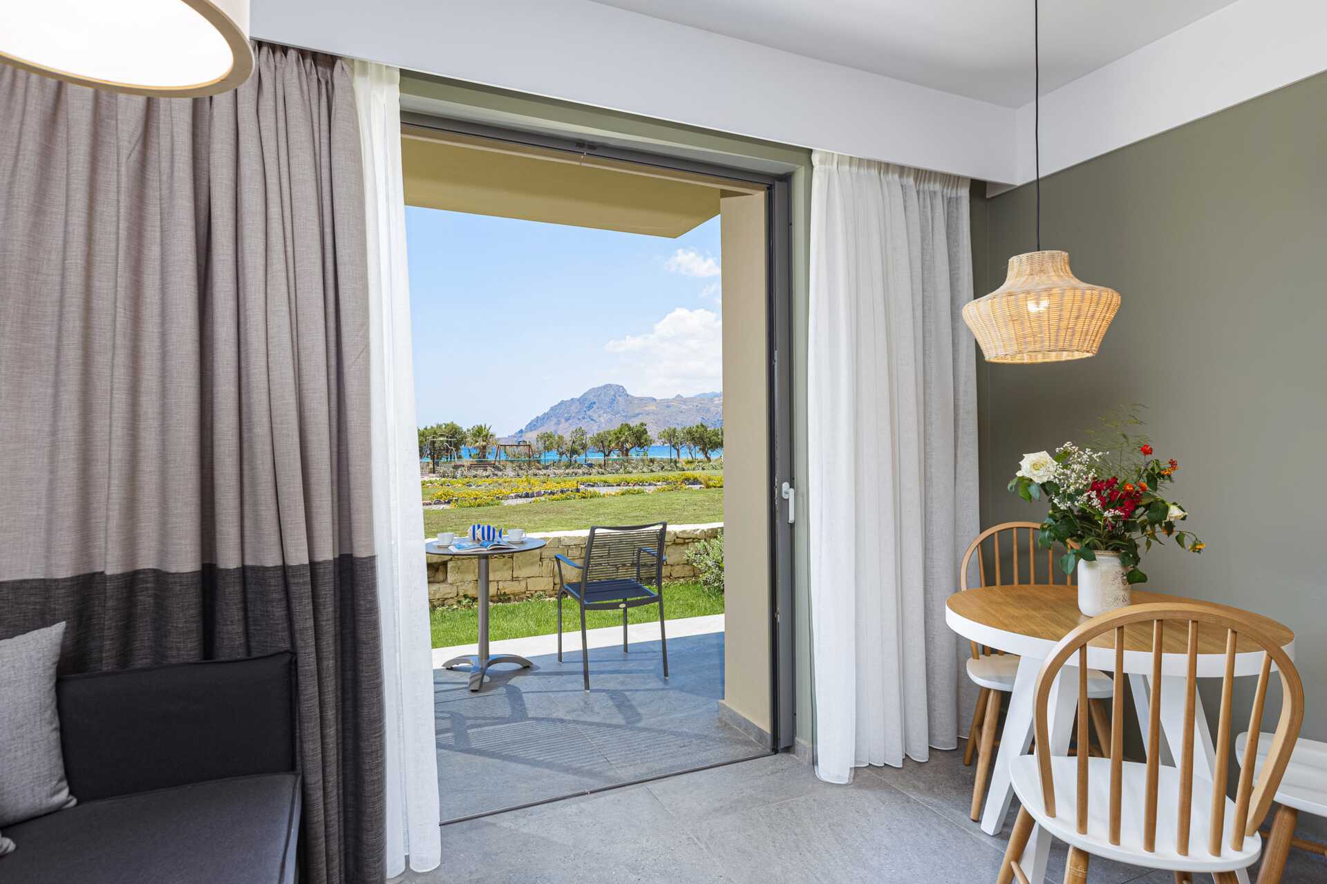 Tvårumslägenhet Premium med markterrass, varav vissa med begränsad havsutsikt. Två solstolar på uteplatsen samt matplats. Sovrum och kombinerat vardagsrum med minikök. En dubbelsäng. Möjlighet till extrabäddar i två bäddsoffor. Minikök med kylskåp och frys, kokplattor, ugn, brödrost, smörgåsgrill, juicepress, vattenkokare, enkel köksutrustning samt Nespresso kaffemaskin med daglig påfyllning av kaffe och te. Wifi, luftkonditionering och deponering ingår. Tv med internationella kanaler. Strykjärn och strykbräda. Hårtork. Badrum med dusch och wc. Städning 7 ggr/vecka.