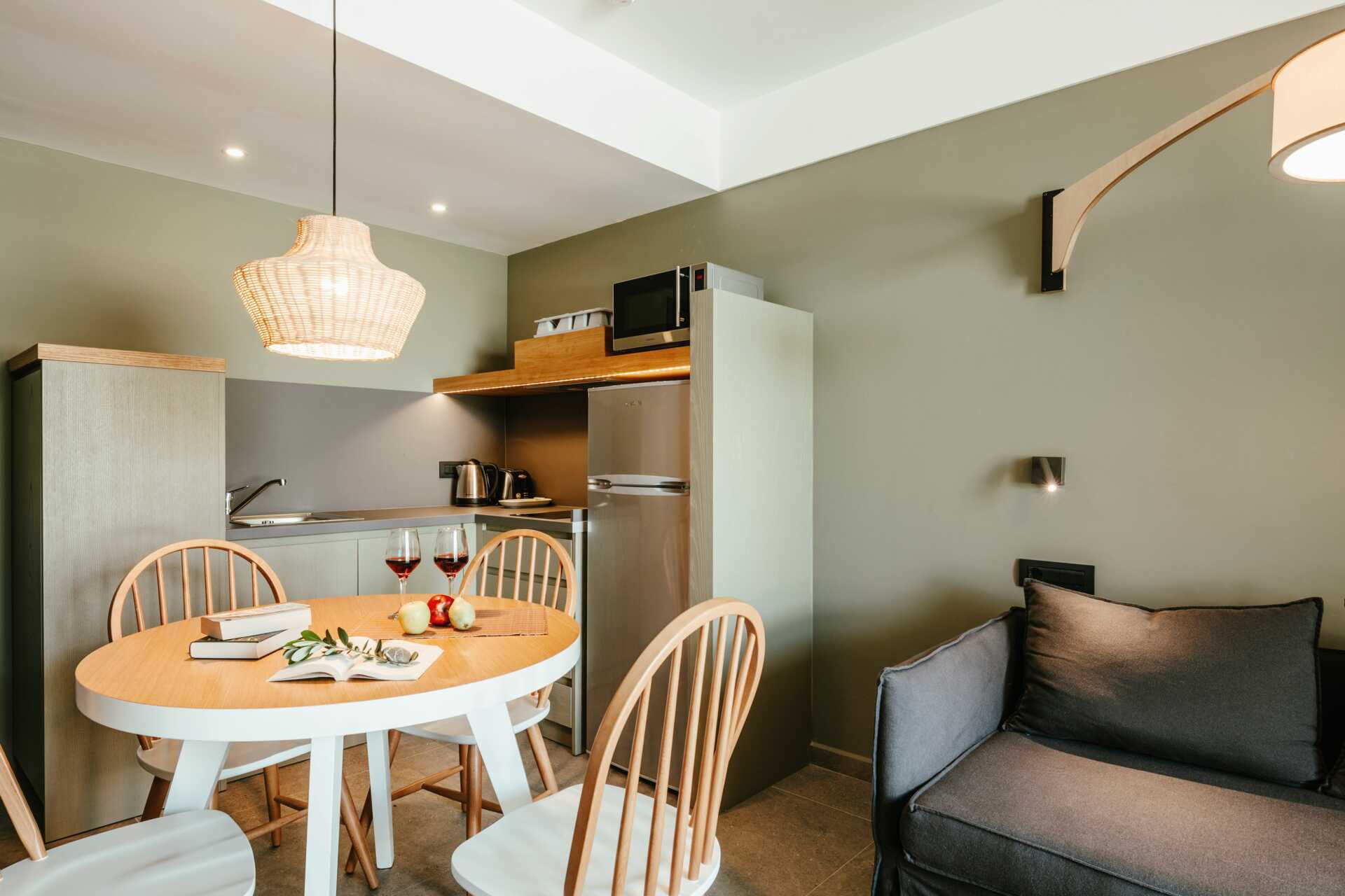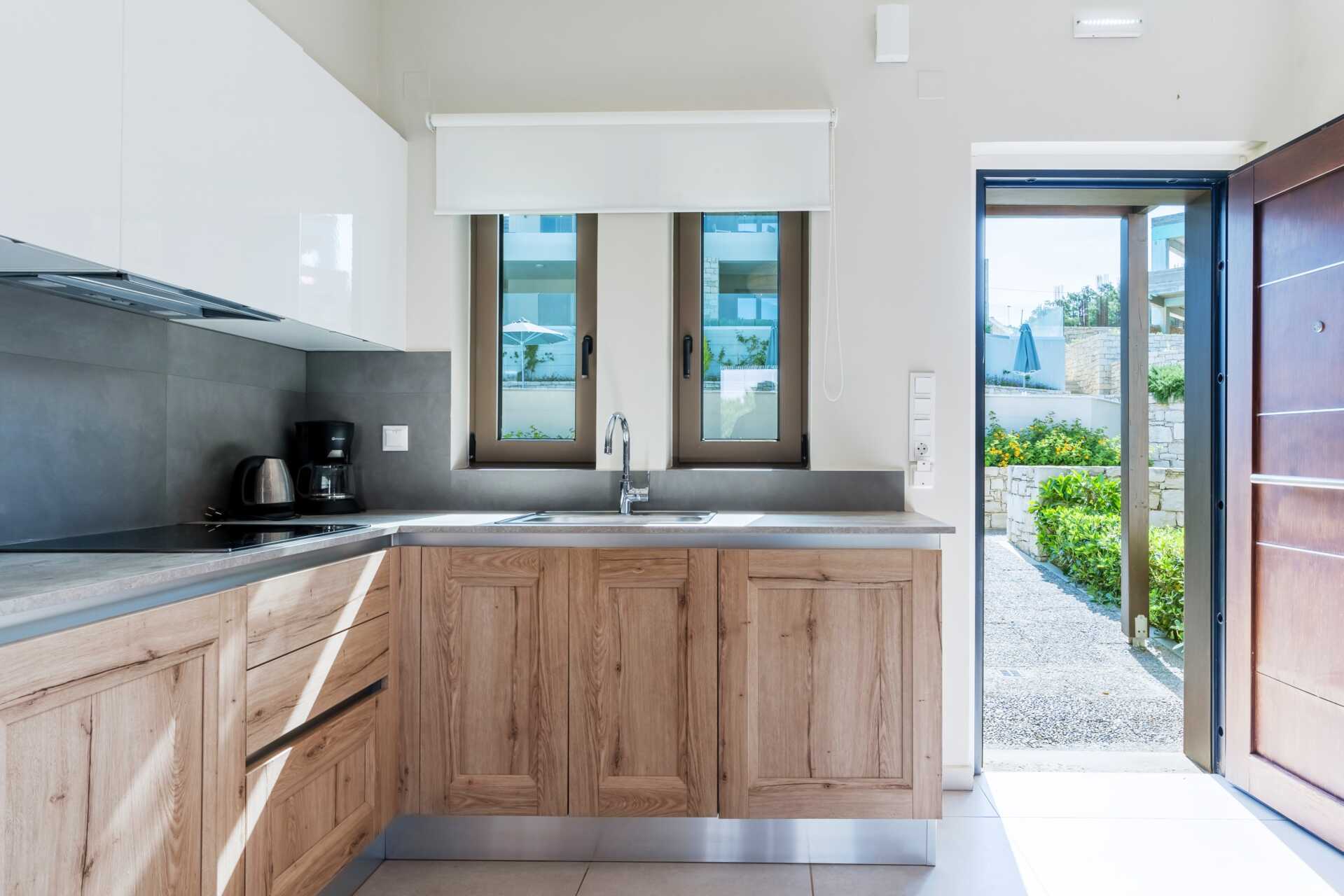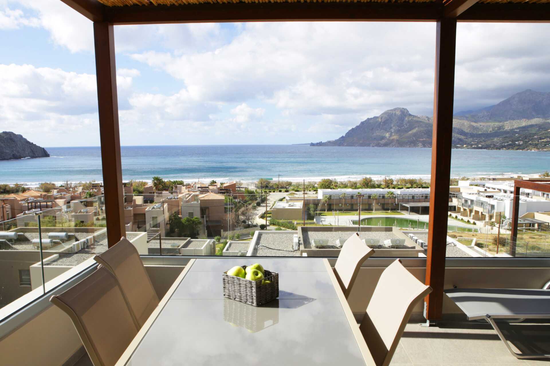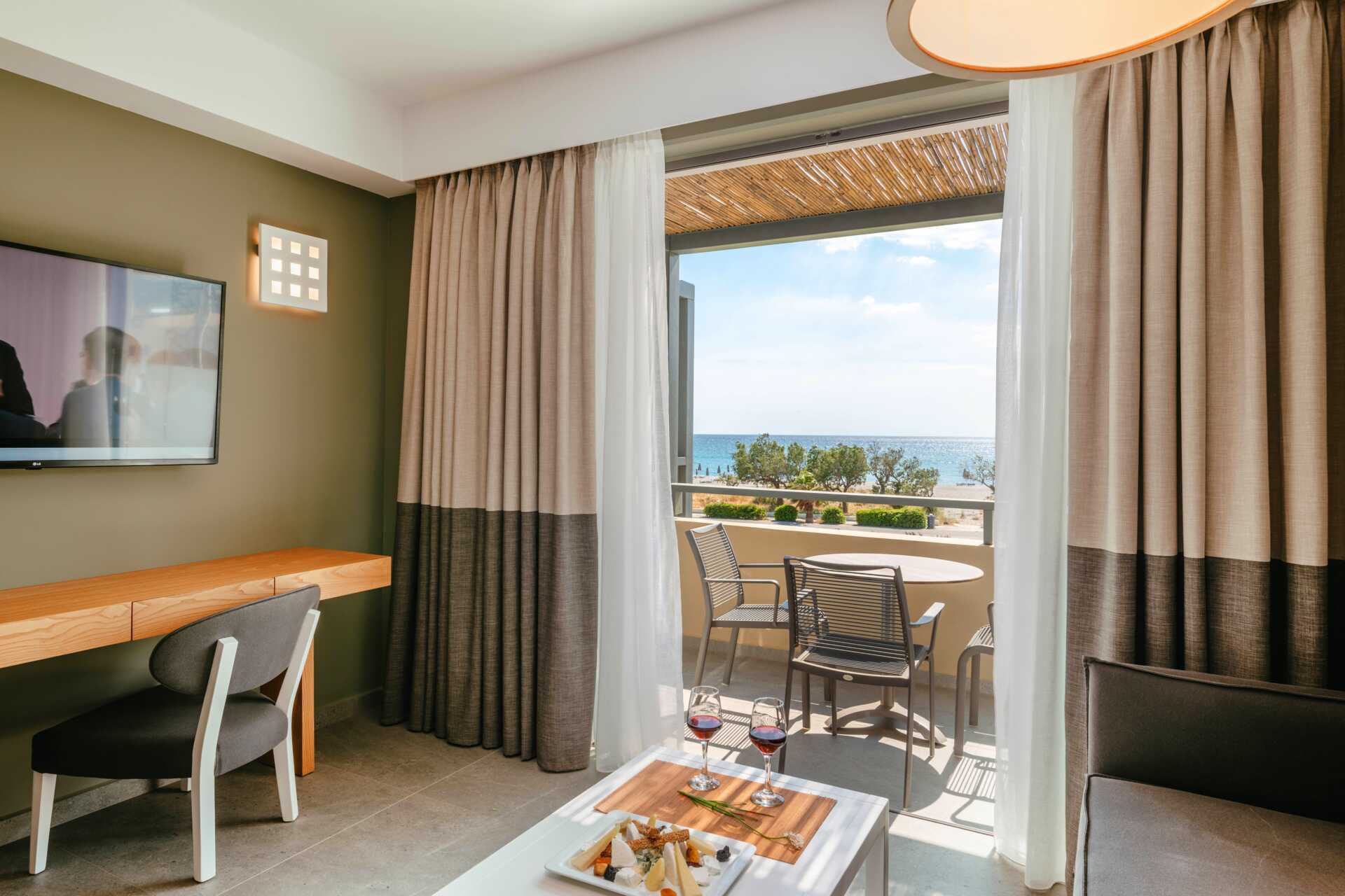 Tvårumslägenhet Premium med markterrass, varav vissa med begränsad havsutsikt. Två solstolar på uteplatsen samt matplats. Sovrum och kombinerat vardagsrum med minikök. En dubbelsäng. Möjlighet till extrabäddar i två bäddsoffor. Minikök med kylskåp och frys, kokplattor, ugn, brödrost, smörgåsgrill, juicepress, vattenkokare, enkel köksutrustning samt Nespresso kaffemaskin med daglig påfyllning av kaffe och te. Wifi, luftkonditionering och deponering ingår. Tv med internationella kanaler. Strykjärn och strykbräda. Hårtork. Badrum med dusch och wc. Städning 7 ggr/vecka.