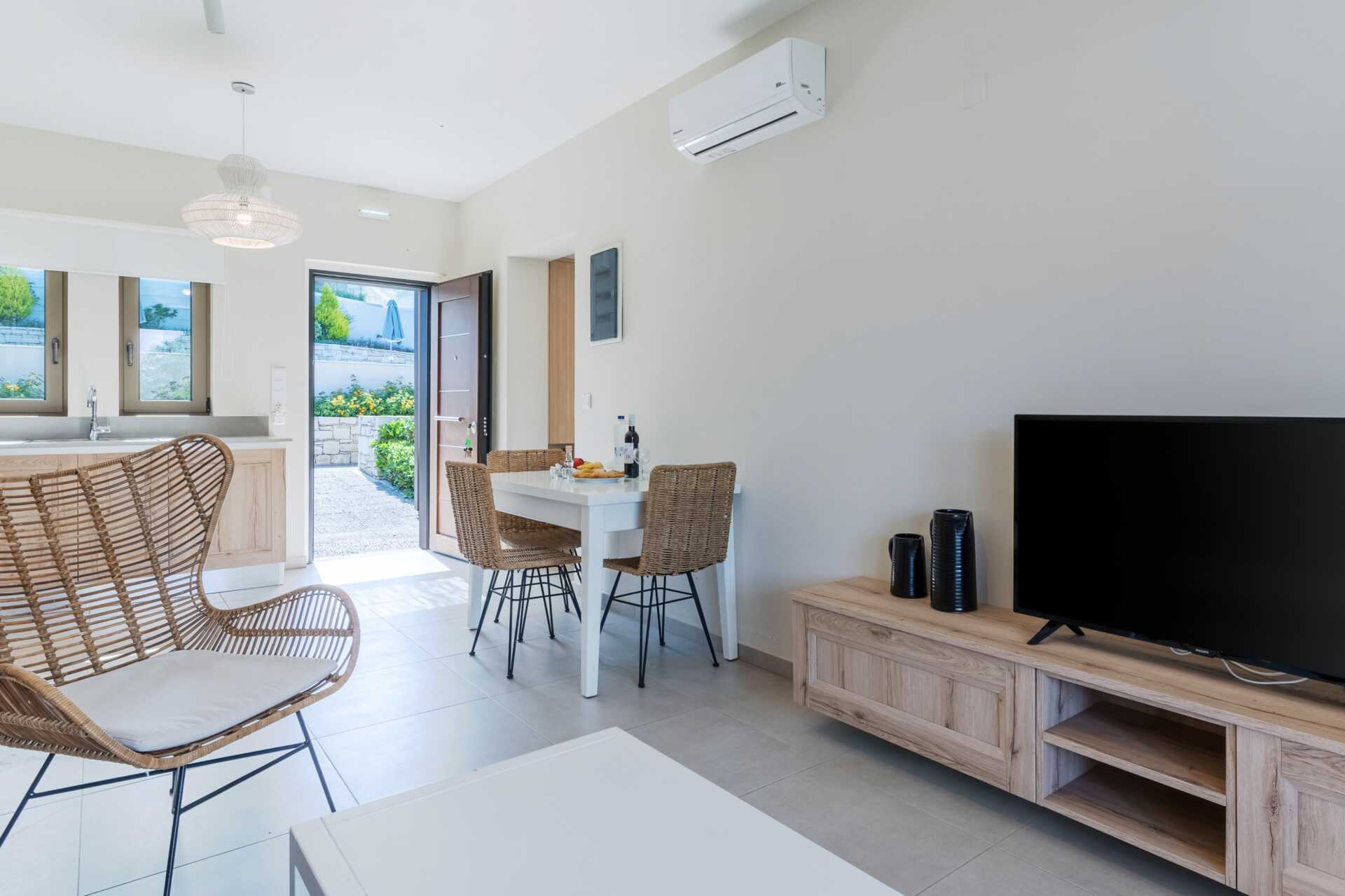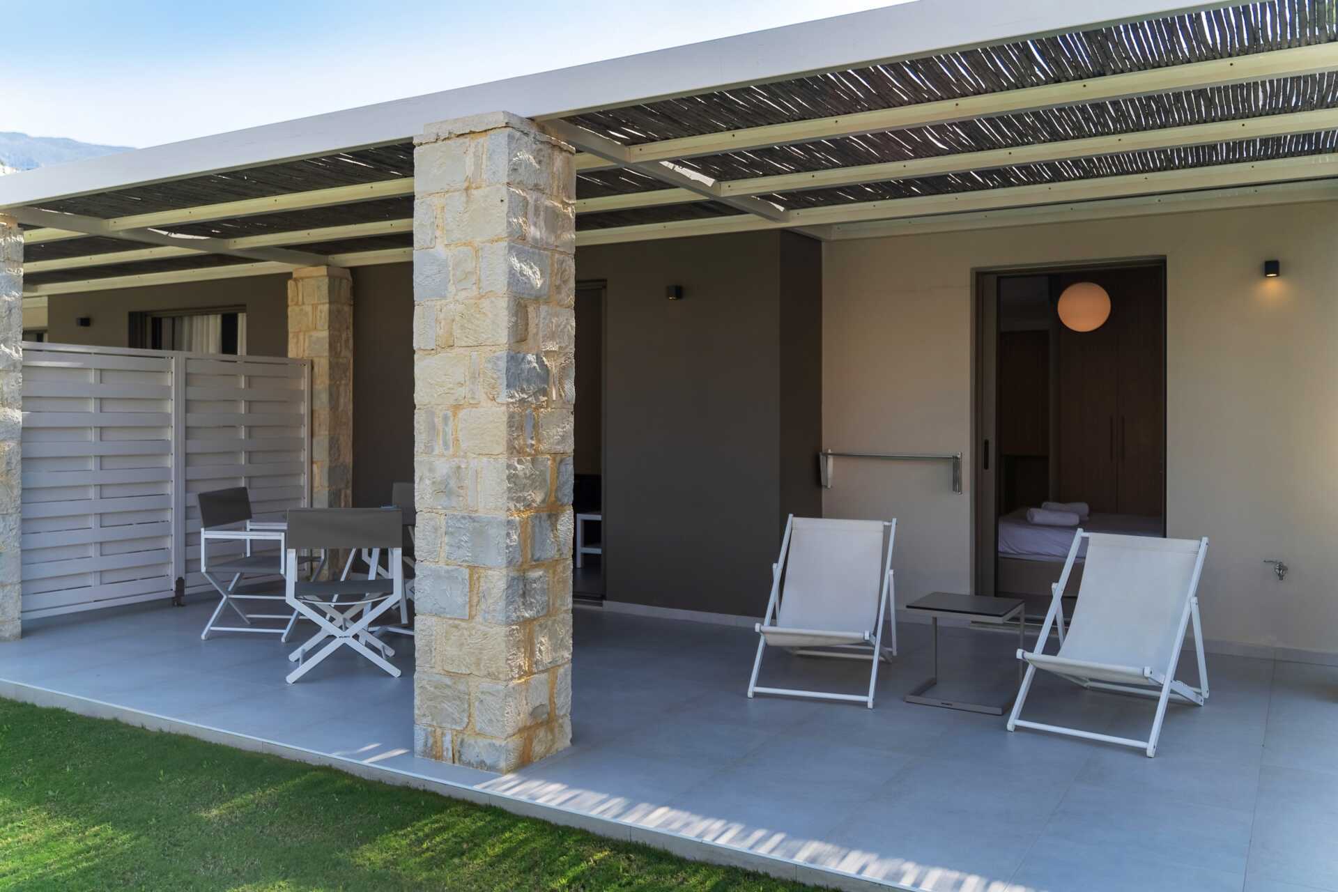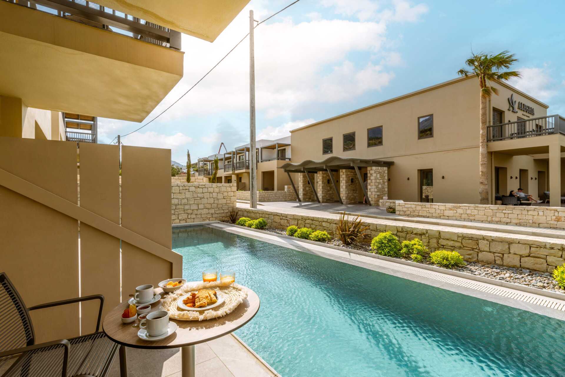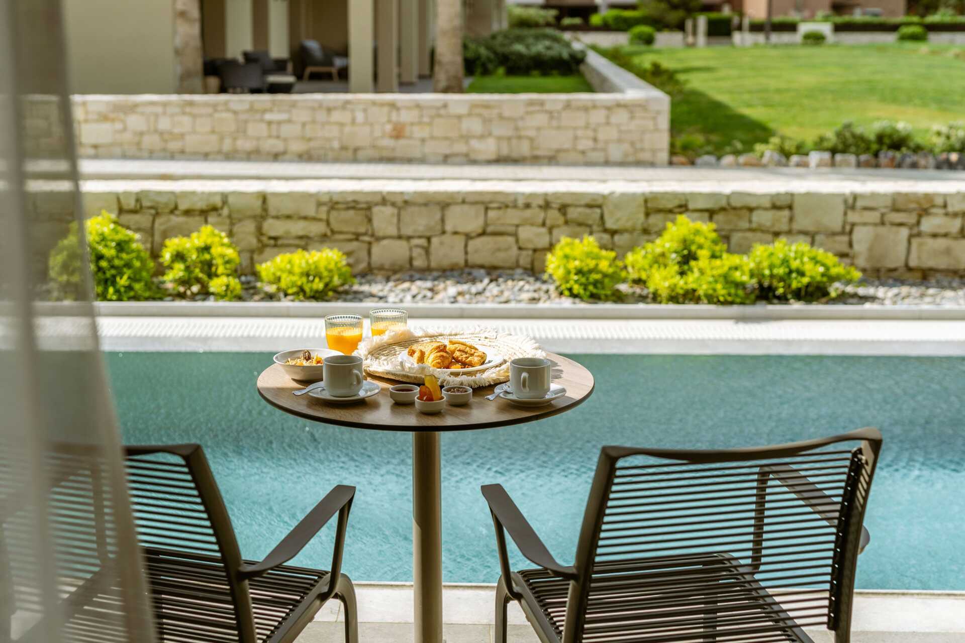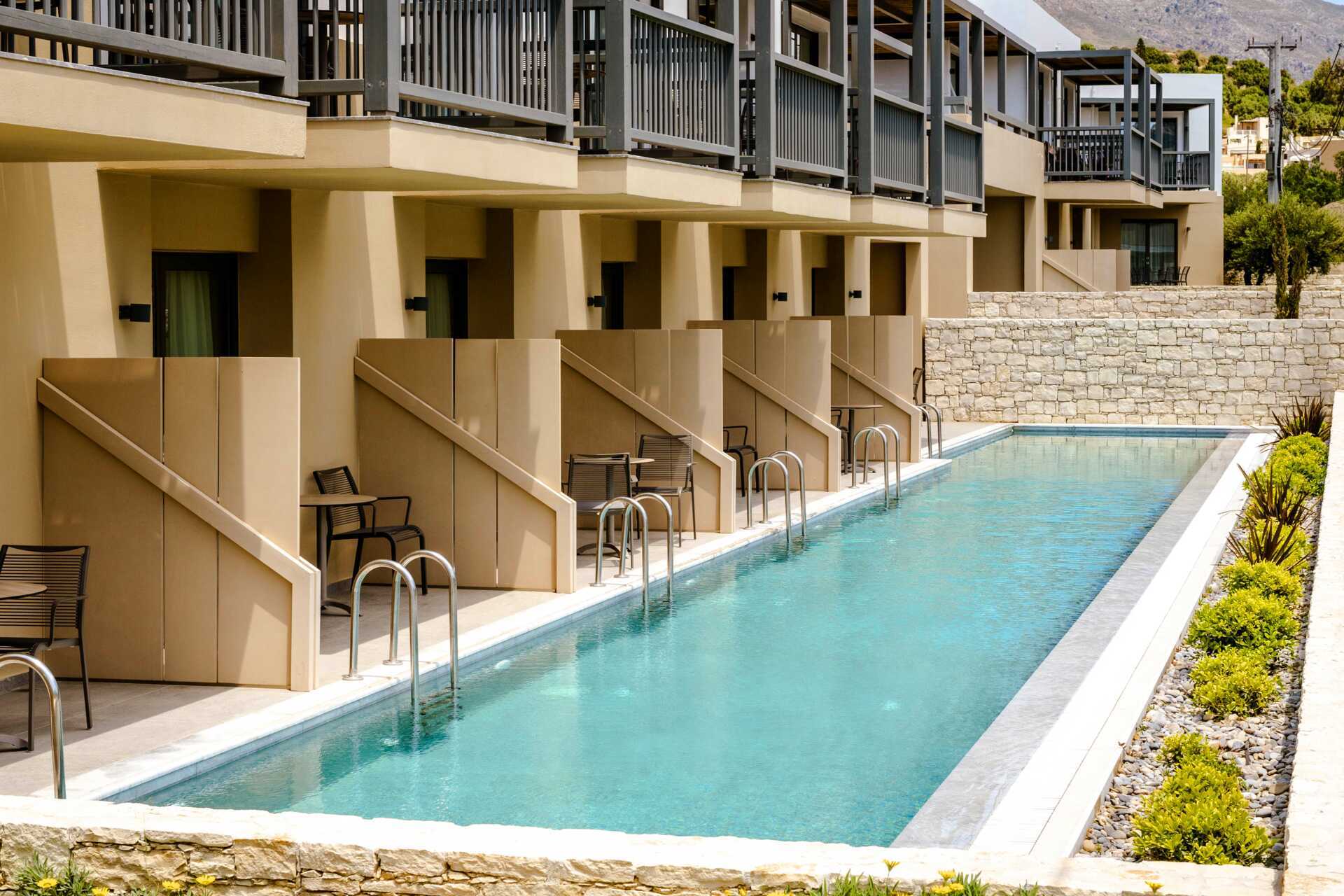 Tvårumslägenhet med uteplats och privat pool. På uteplatsen finns bord och stolar samt lite bekvämare vilstolar. Stege ner i poolen. Rummet öppnar upp direkt mot den privata poolen. Ett sovrum och ett kombinerat vardagsrum med minikök. En dubbelsäng eller två enkelsängar. Möjlighet till två extrabäddar i en bäddsoffa med utdragbar säng. Minikök med kylskåp med frysfack, kokplattor, brödrost, mikrovågsugn, vattenkokare och enkel köksutrustning. Wifi, luftkonditionering och deponering ingår. Tv med internationella kanaler. Hårtork. Badrum med separat dusch och separat wc. Städning 7 ggr/vecka.