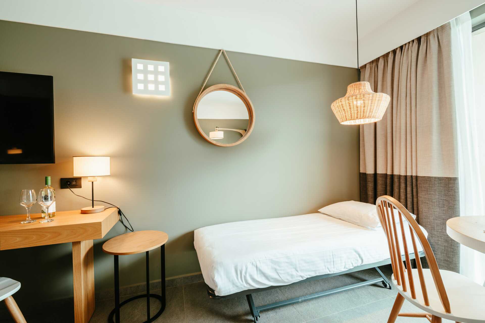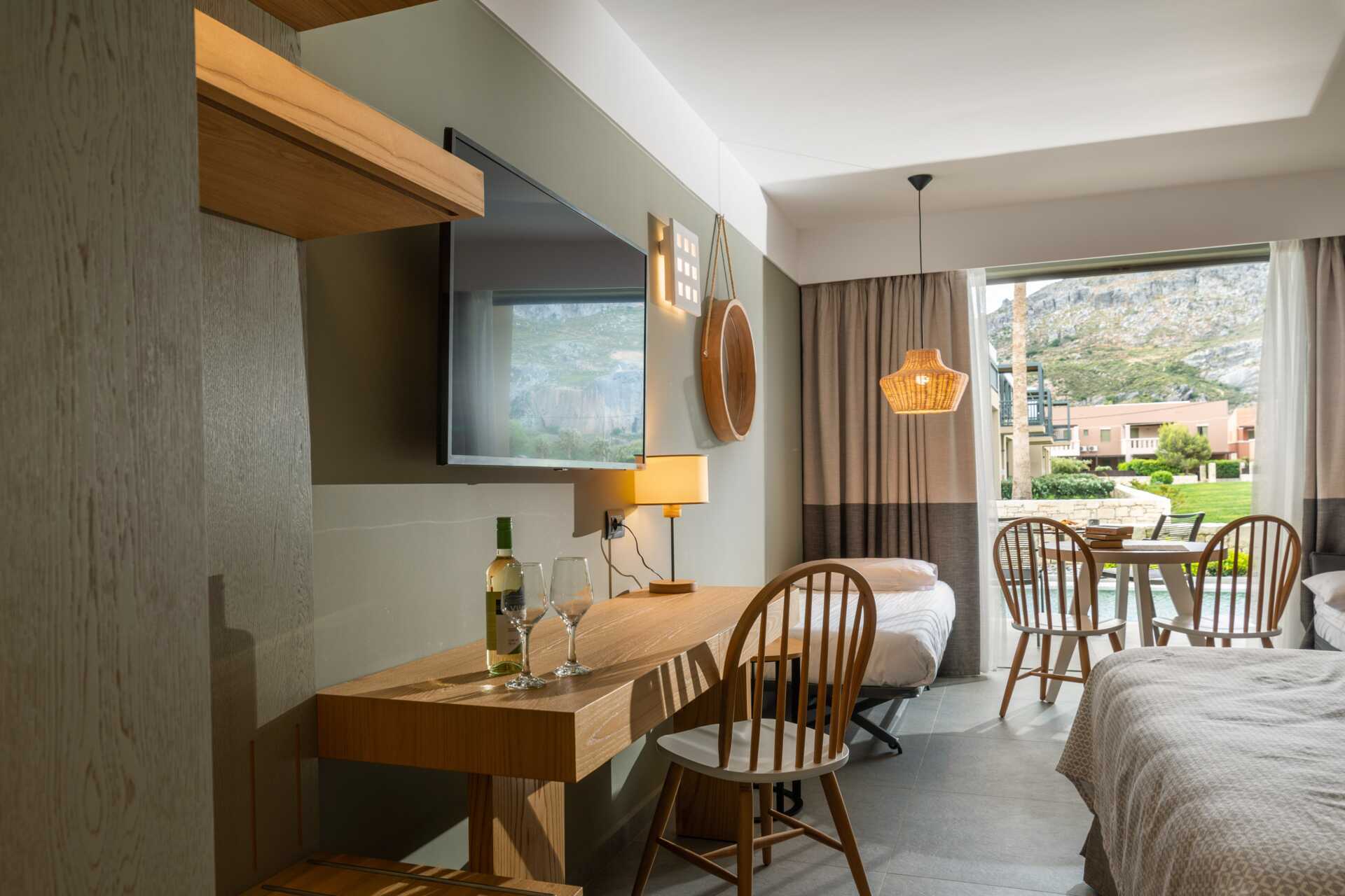 Tillgänglighetsanpassat dubbelrum med markterrass och poolutsikt. En dubbelsäng eller två enkelsängar. Möjlighet till extrabädd i bäddsoffa. Litet kylskåp. Wifi, luftkonditionering och deponering ingår. Tv med internationell kanaler. Hårtork. Badrum med dusch och wc. Städning 7 ggr/vecka.