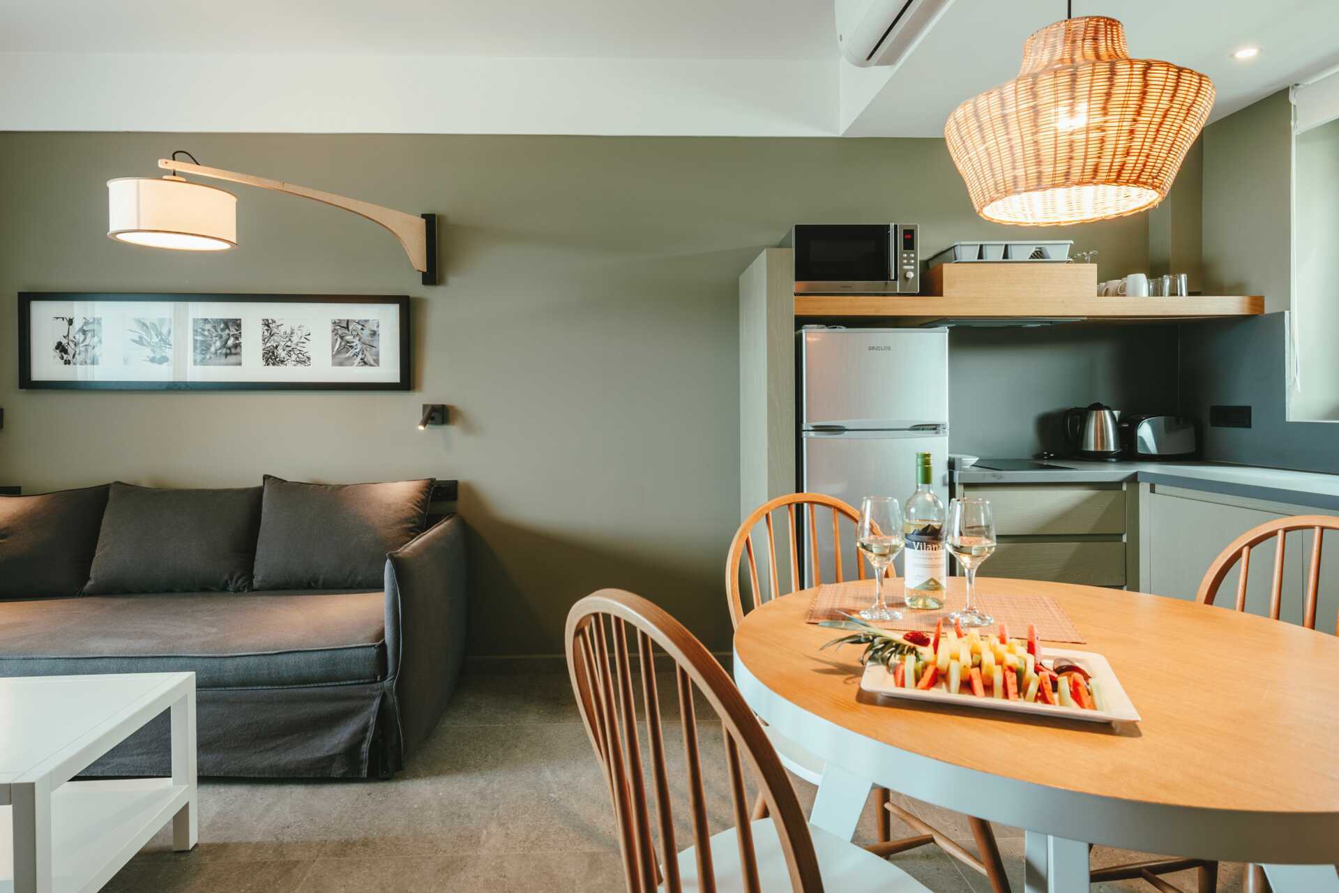 Tvårumslägenhet med balkong eller markterrass. Vissa balkonger har havsutsikt eller poolutsikt, och vissa markterrasser har begränsad havsutsikt eller poolutsikt. Ett sovrum och ett kombinerat vardagsrum med minikök. En dubbelsäng eller två enkelsängar. Möjlighet till två extrabäddar i en bäddsoffa med utdragbar säng. Minikök med kylskåp med frysfack, kokplattor, brödrost, mikrovågsugn, vattenkokare och enkel köksutrustning. Wifi, luftkonditionering och deponering ingår. Tv med internationella kanaler. Hårtork. Badrum med dusch och wc. Städning 7 ggr/vecka.