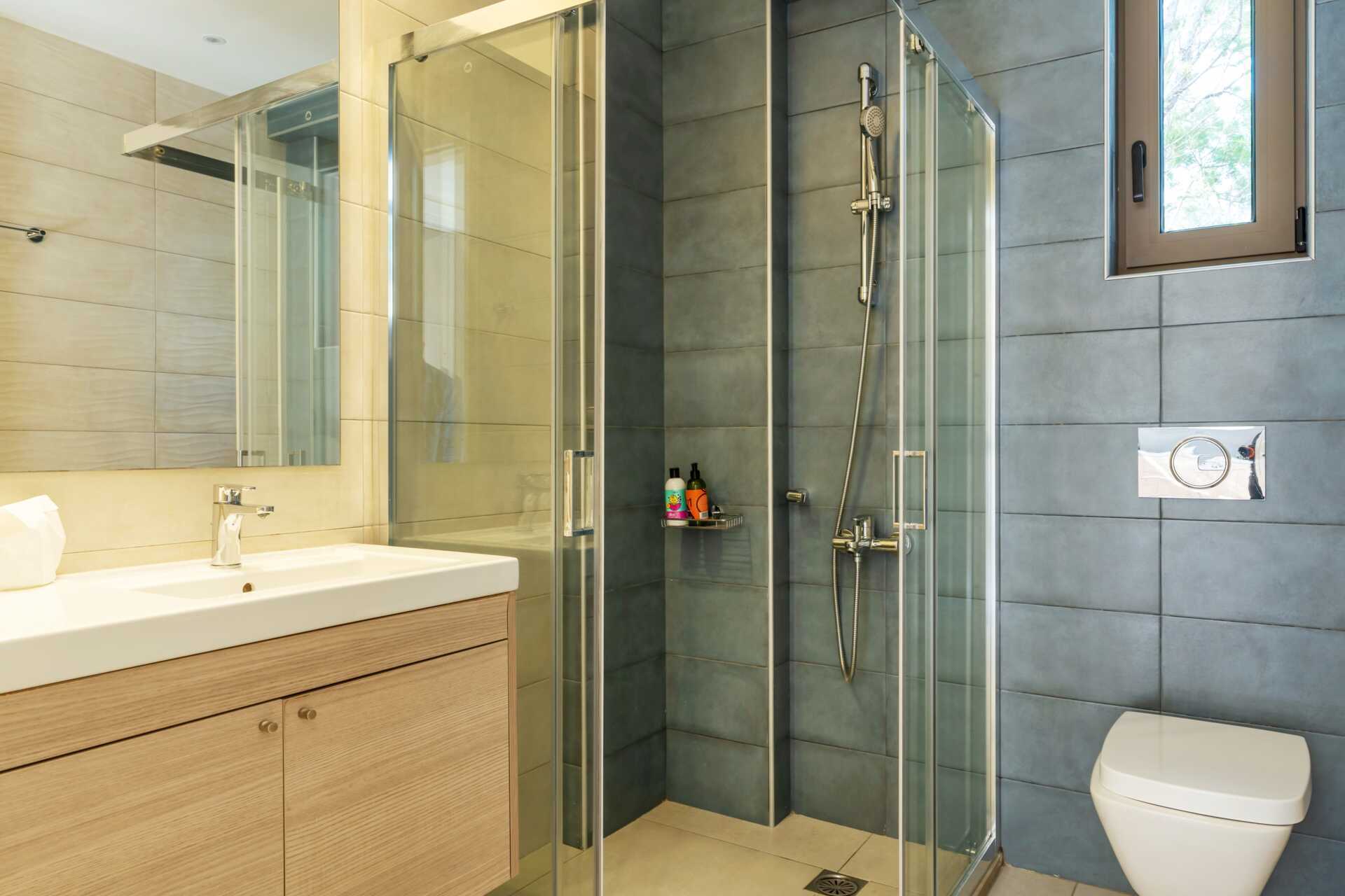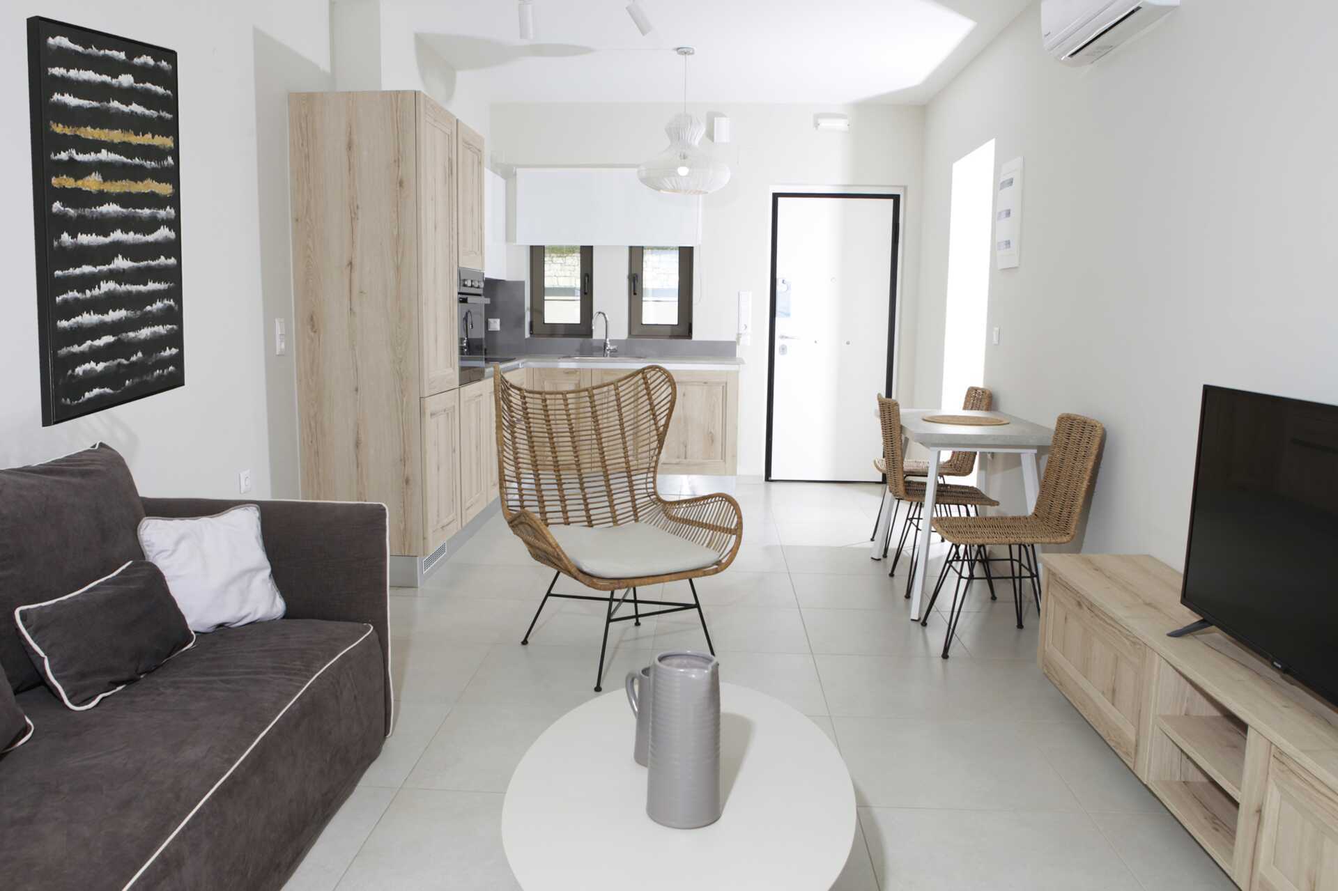 Trerumslägenheterna är en tvårumslägenhet och en enrumslägenhet med förbindelsedörr. Balkong eller markterrass. Markterrasserna har begränsad havsutsikt, vissa balkonger har havsutsikt. En dubbelsäng eller två enkelsängar i varje sovrum. Möjlighet till extrabädd i bäddsoffa. Wifi, luftkonditionering och deponering ingår. Minikök med kylskåp, kokplattor, brödrost, mikrovågsugn, vattenkokare och enkel köksutrustning. Tv med internationella kanaler. Hårtork. Två badrum med dusch och wc. Städning 7 ggr/vecka.