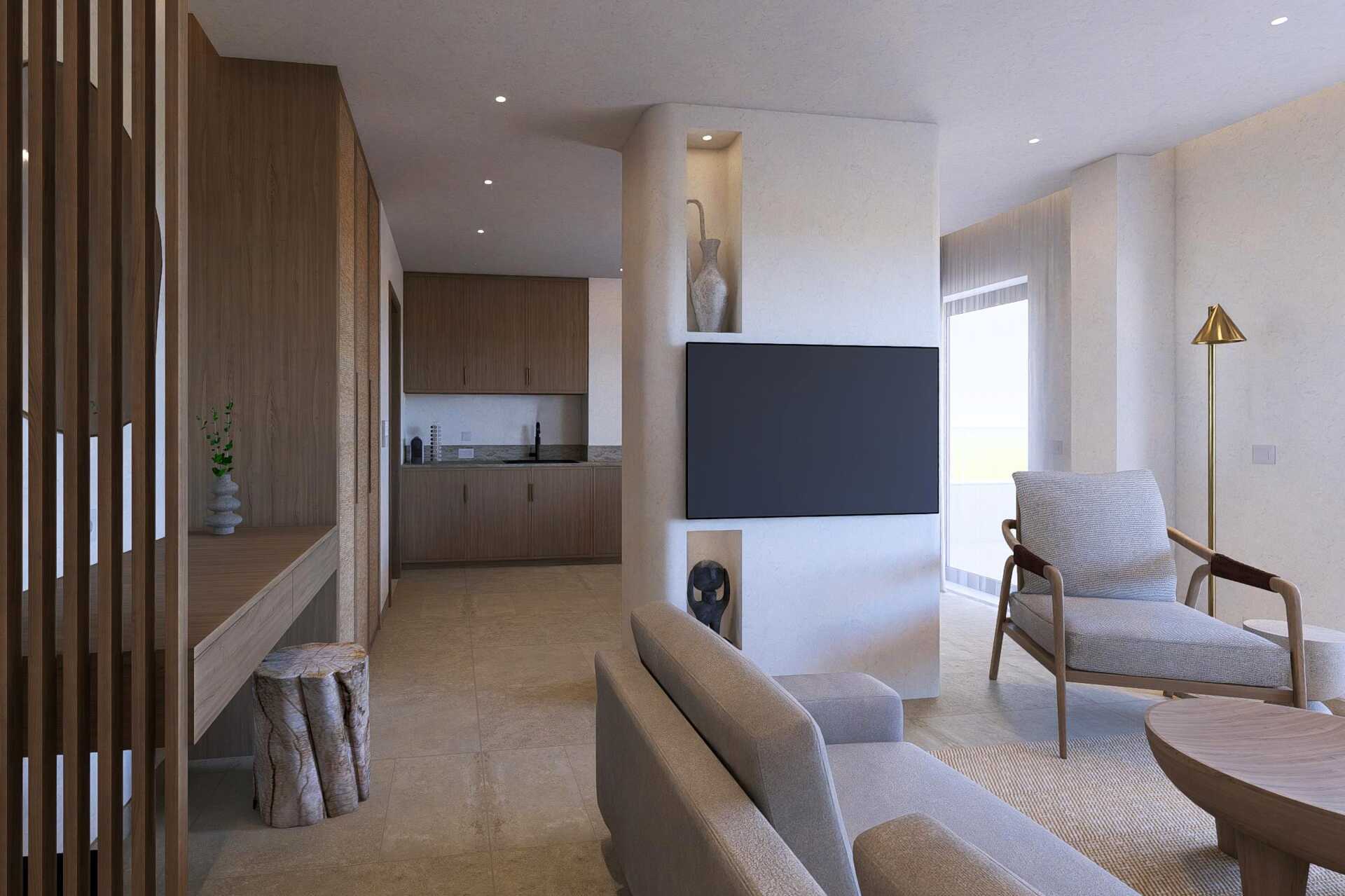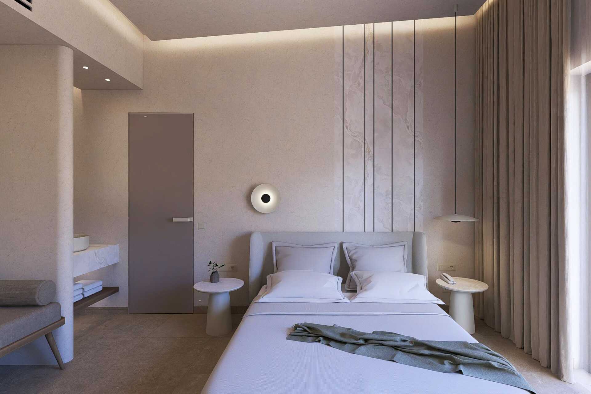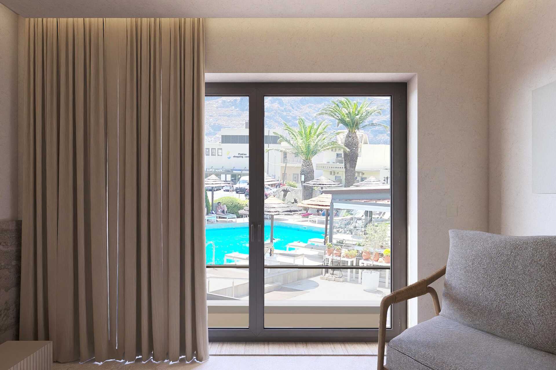 Tvårumssvit med privat pool som vetter mot havet. Solstolar på uteplatsen. Två sovrum och ett vardagsrum. En dubbelsäng i varje sovrum och möjlighet till extrabädd i bäddsoffor i vardagsrummet. Kuddmeny. Wifi, luftkonditionering och deponering ingår. Kylskåp. Vattenkokare samt kaffe och te. Takfläkt. Tv med internationella kanaler. Badrockar och tofflor. Hårtork. Badrum med dusch och wc. Städning 7 ggr/vecka.