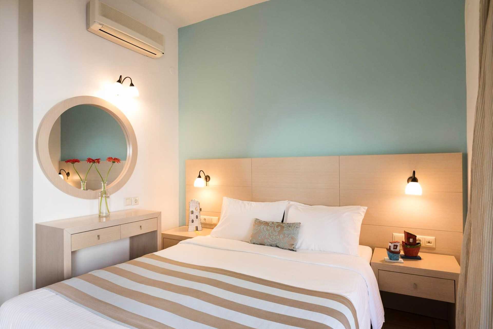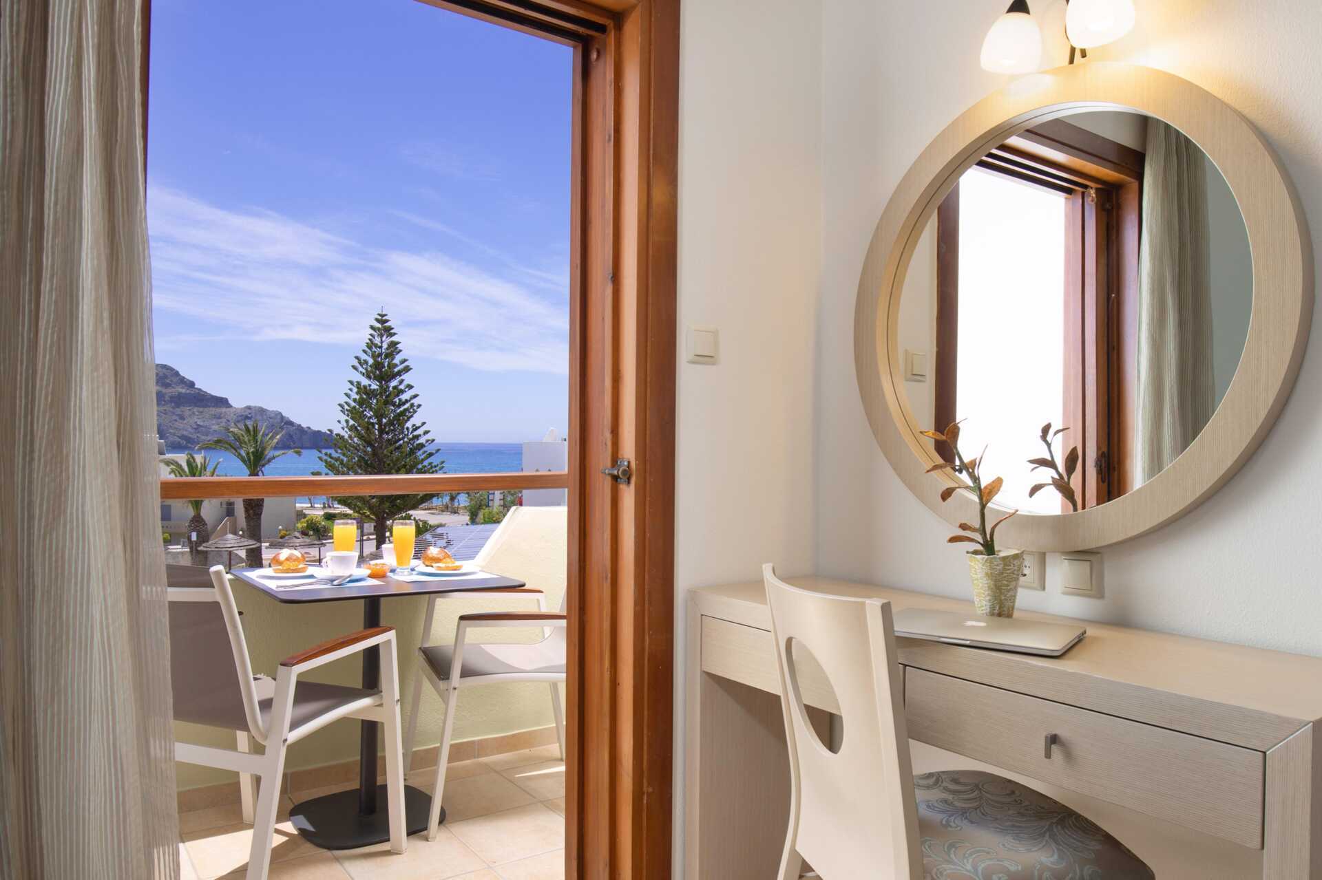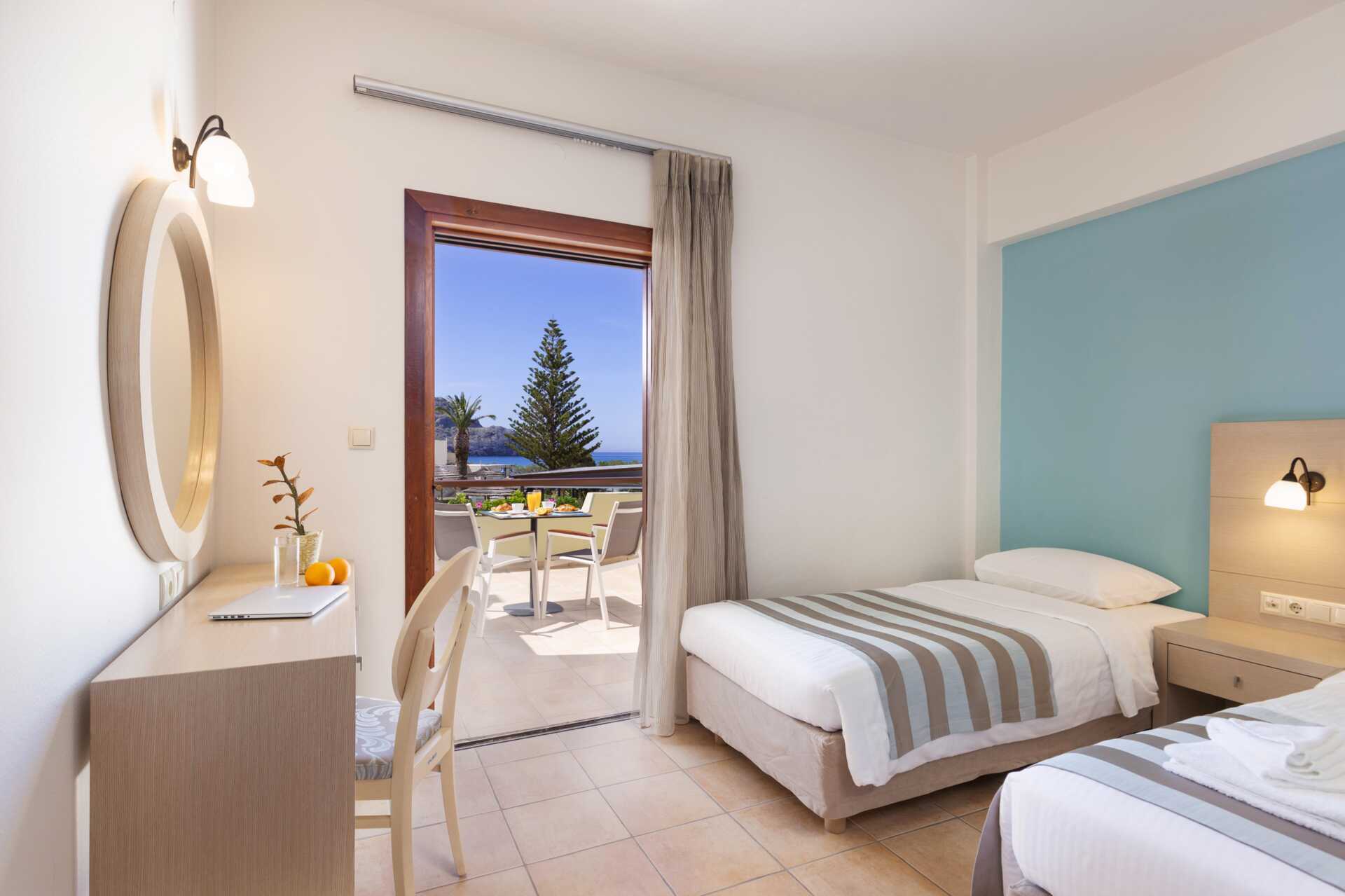 Dubbelrum med balkong, vissa med begränsad havsutsikt. En dubbelsäng eller två enkelsängar. Möjlighet till extrabädd i bäddsoffa. Wifi och luftkonditionering. Deponering mot avgift. Kylskåp. Tv med internationella kanaler. Hårtork. Badrum med badkar och wc. Städning 7 ggr/vecka.