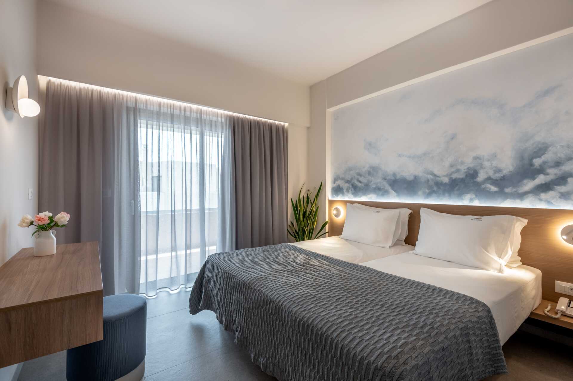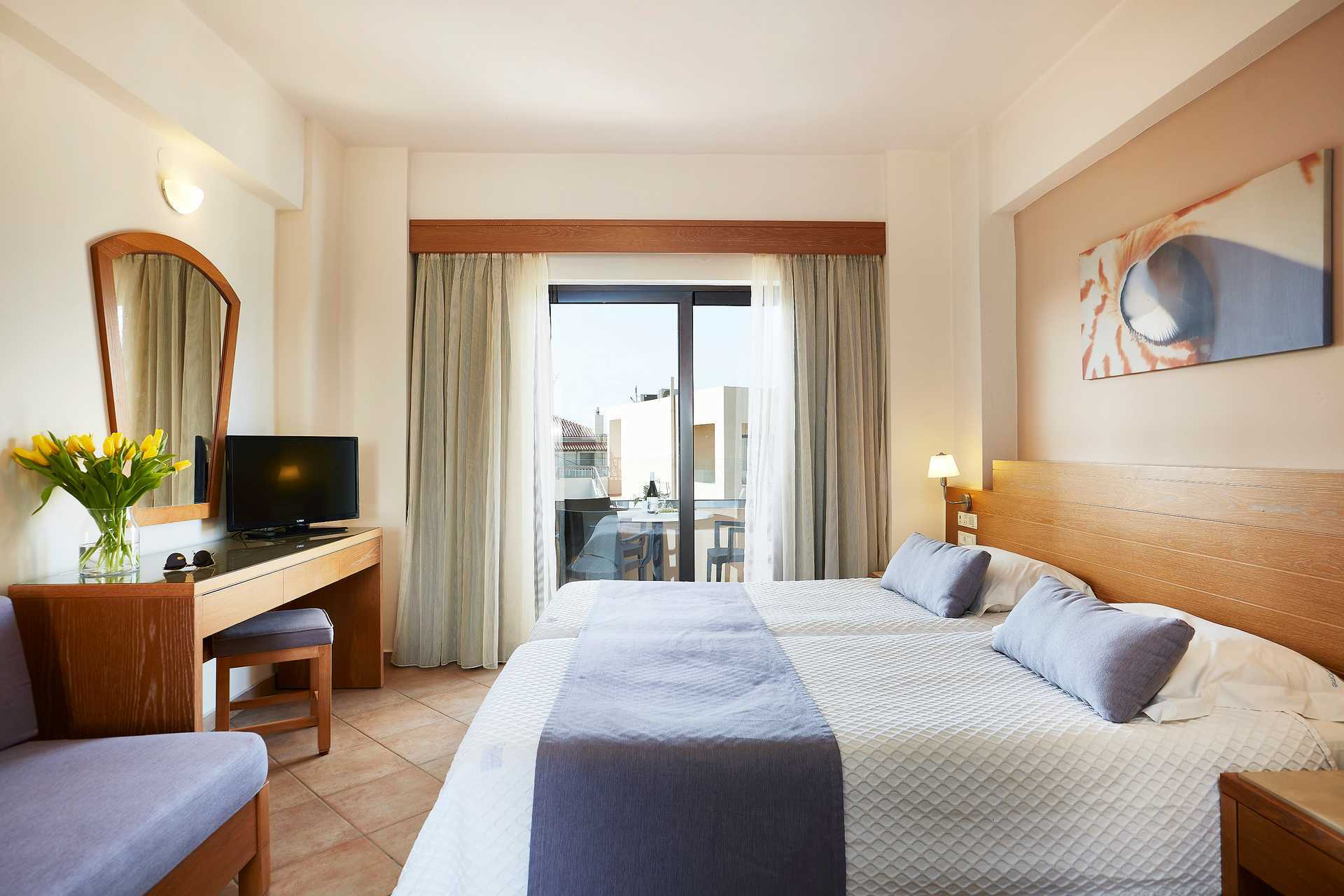 Tvårumslägenhet superior med balkong eller terrass. Lägenheterna renoverades till sommaren 2024. Ett sovrum och ett kombinerat vardagsrum/minikök. En dubbelsäng eller två enkelsängar. Möjlighet till extrabädd i bäddsoffa. Minikök med kokplattor, kylskåp, kaffekokare, vattenkokare och enkel köksutrustning. Wifi ingår. Luftkonditionering och deponering mot avgift. Tv med internationella kanaler. Hårtork. Badrum med dusch och wc. Städning 6 ggr/vecka.