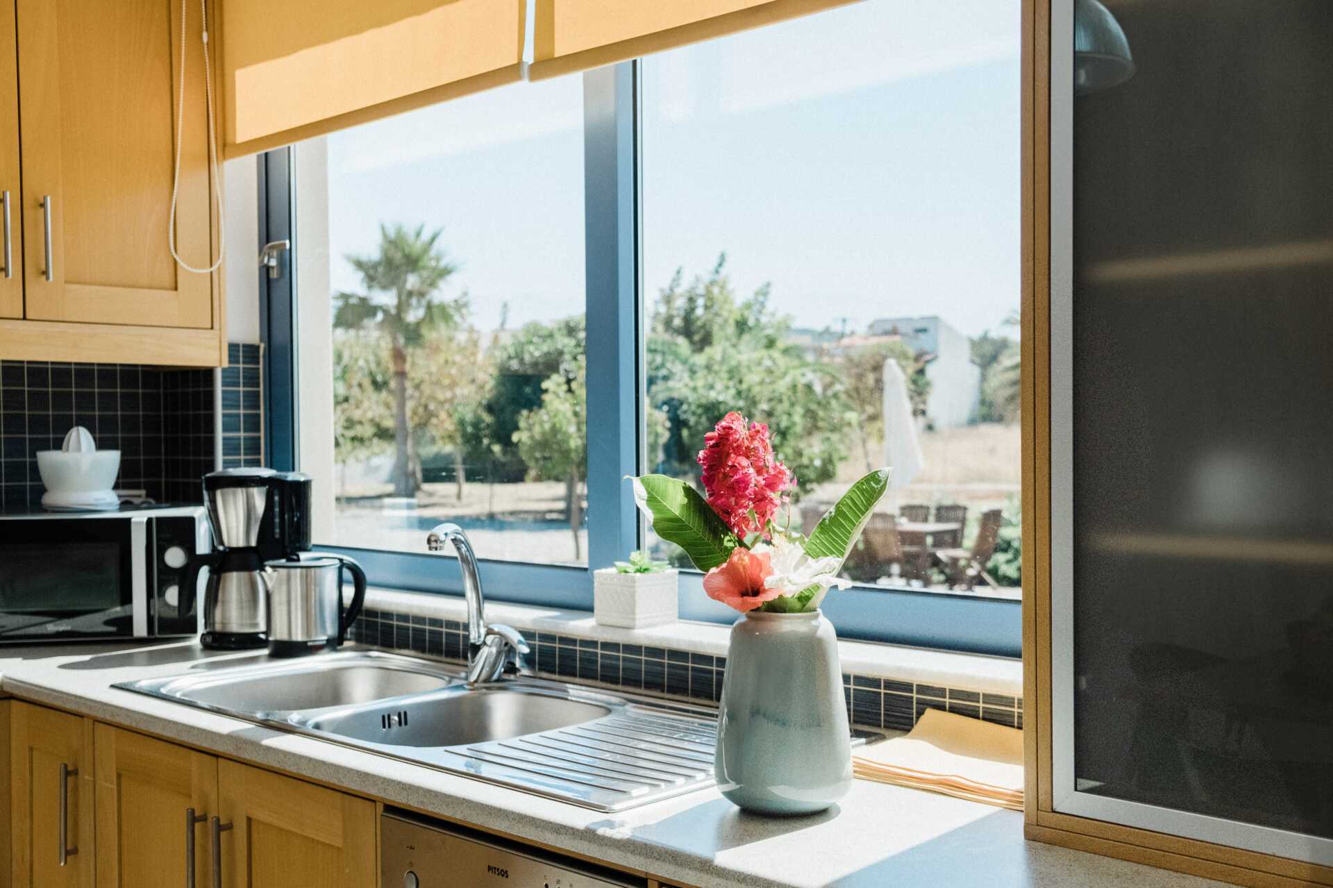 Tvårumslägenhet i enplansvillor med privat pool och begränsad havsutsikt från markterrassen. På terrassen finns matplats och solstolar och varje lägenhet har en balisäng på gräsmattan. Sovrum och kombinerat vardagsrum/minikök. En dubbelsäng. Möjlighet till extrabäddar i bäddbara fåtöljer. Välutrustat kök med spishäll och ugn, kylskåp och frys, diskmaskin, kaffebryggare, juicepress, mikrovågsugn och enkel köksutrustning. Vattenkokare vid förfrågan. Wifi, luftkonditionering och deponering ingår. Tv med internationella kanaler. Hårtork. Badrum med dusch och wc. Städning 6 ggr/vecka.