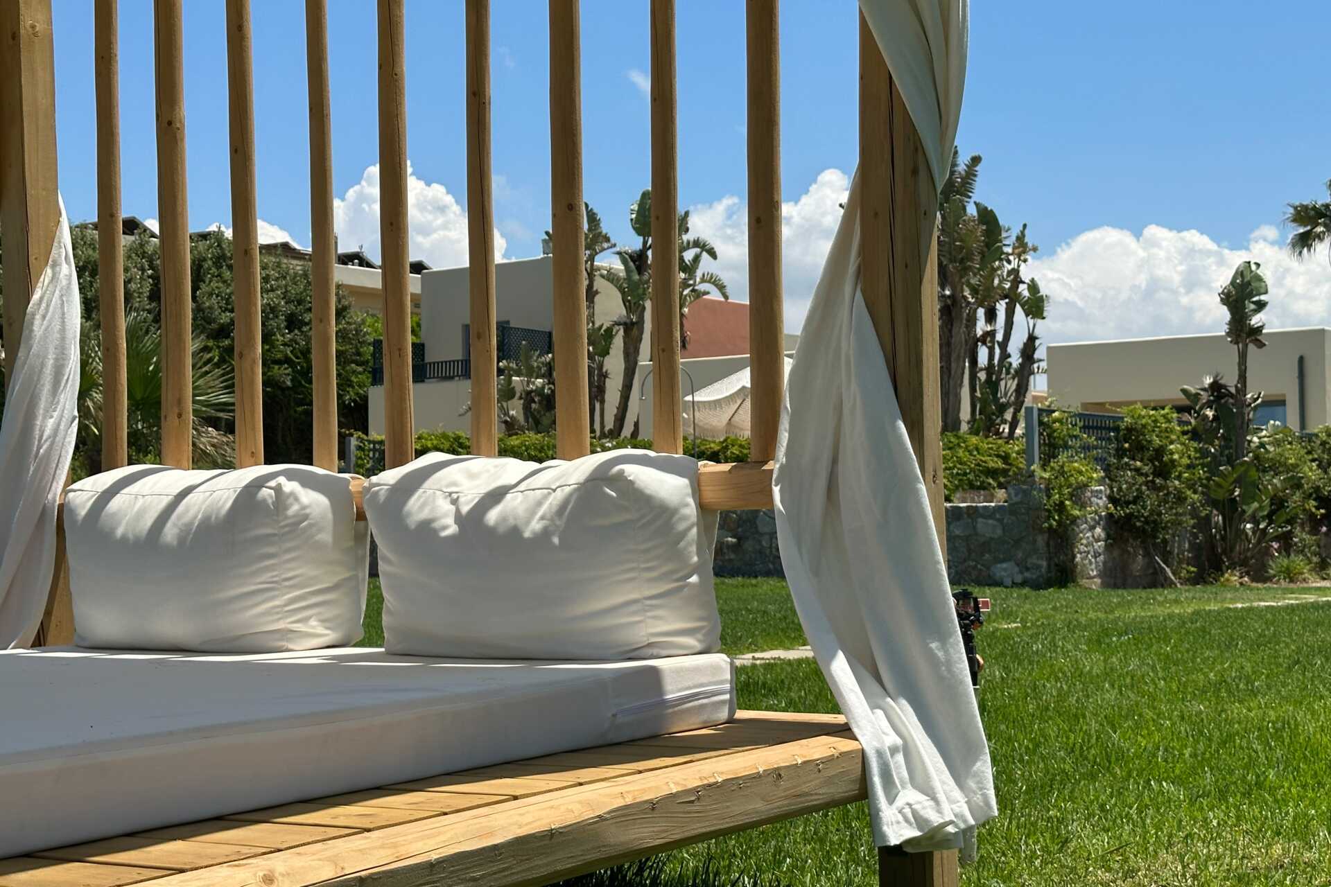 Tvårumslägenhet med markterrass, privat pool och begränsad havsutsikt. På terrassen finns matplats och solstolar och varje lägenhet har varsin balisäng på gräsmattan. Lägenheterna ligger i enplansvillor. Sovrum och kombinerat vardagsrum med minikök. En dubbelsäng. Möjlighet till extrabäddar i bäddbara fåtöljer. Välutrustat kök med spishäll och ugn, kylskåp och frys, diskmaskin, kaffebryggare, juicepress, mikrovågsugn och enkelköksutrustning. Vattenkokare vid förfrågan. Wifi, luftkonditionering och deponering ingår. Tv med internationella kanaler. Hårtork. Badrum med dusch och wc. Städning 6 ggr/vecka.