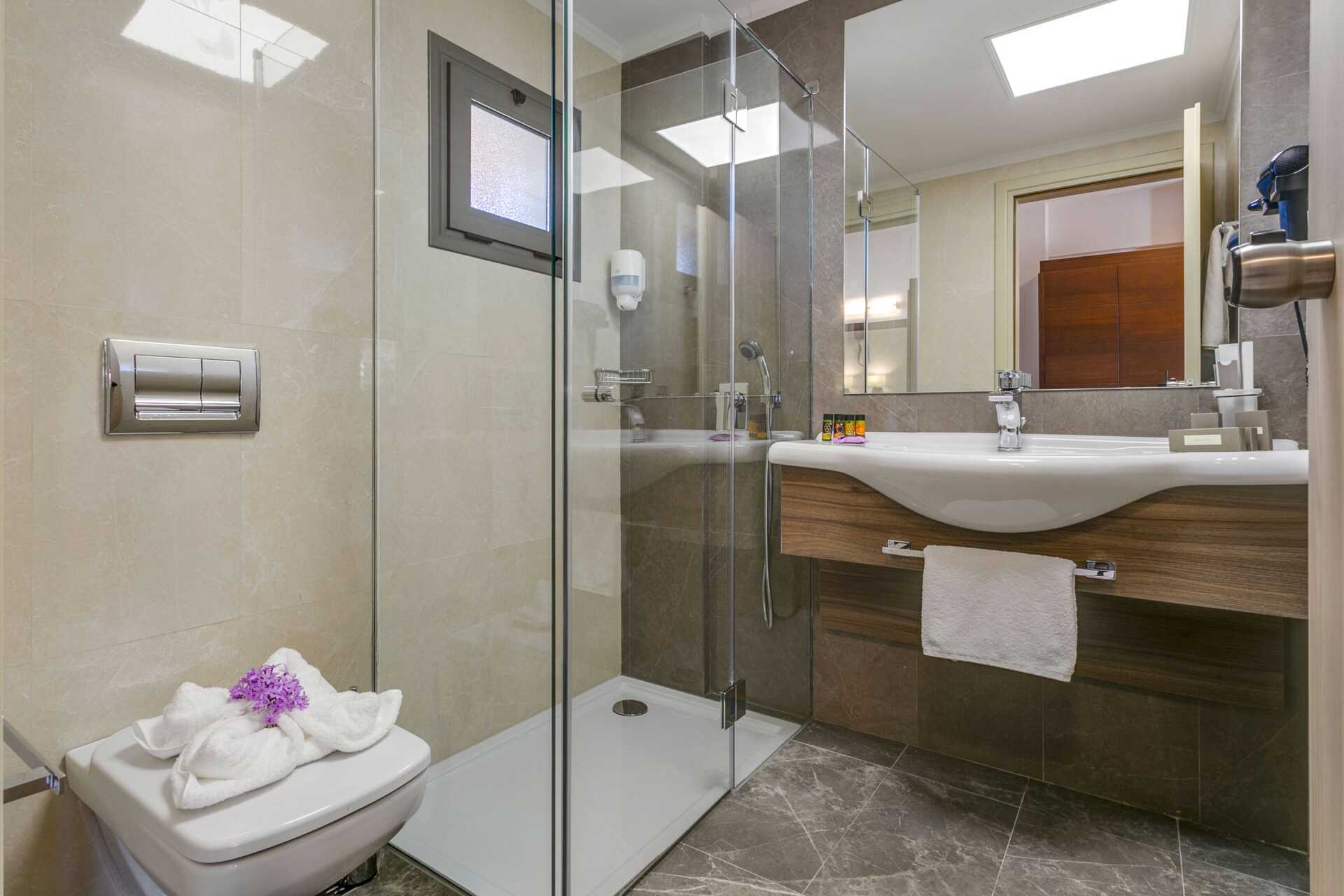 Dubbelrum med balkong. En dubbelsäng eller två enkelsängar. Möjlighet till extrabädd i enkelsäng, i hopfällbar säng eller i bäddsoffa. Wifi och luftkonditionering ingår. Deponering mot avgift. Kylskåp. Vattenkokare. Kaffebryggare. Tv med internationella kanaler. Hårtork. Badrum med dusch och wc. Städning 7 ggr/vecka. Barn under två år räknas in i max antal personer i rummet.