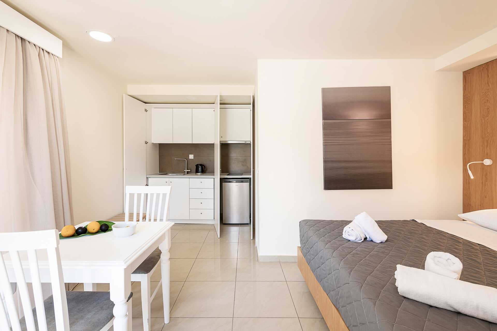 Enrumslägenhet med balkong eller terrass. Kombinerat sovrum med minikök. En dubbelsäng. Möjlighet till extrabädd i bäddsoffa. Minikök med kylskåp, kokplattor och enkel köksutrustning. Wifi, luftkonditionering och deponering ingår. Tv med internationella kanaler. Strykjärn och strykbräda. Badrockar och tofflor. Hårtork. Badrum med badkar eller dusch samt wc. Städning 7 ggr/vecka.