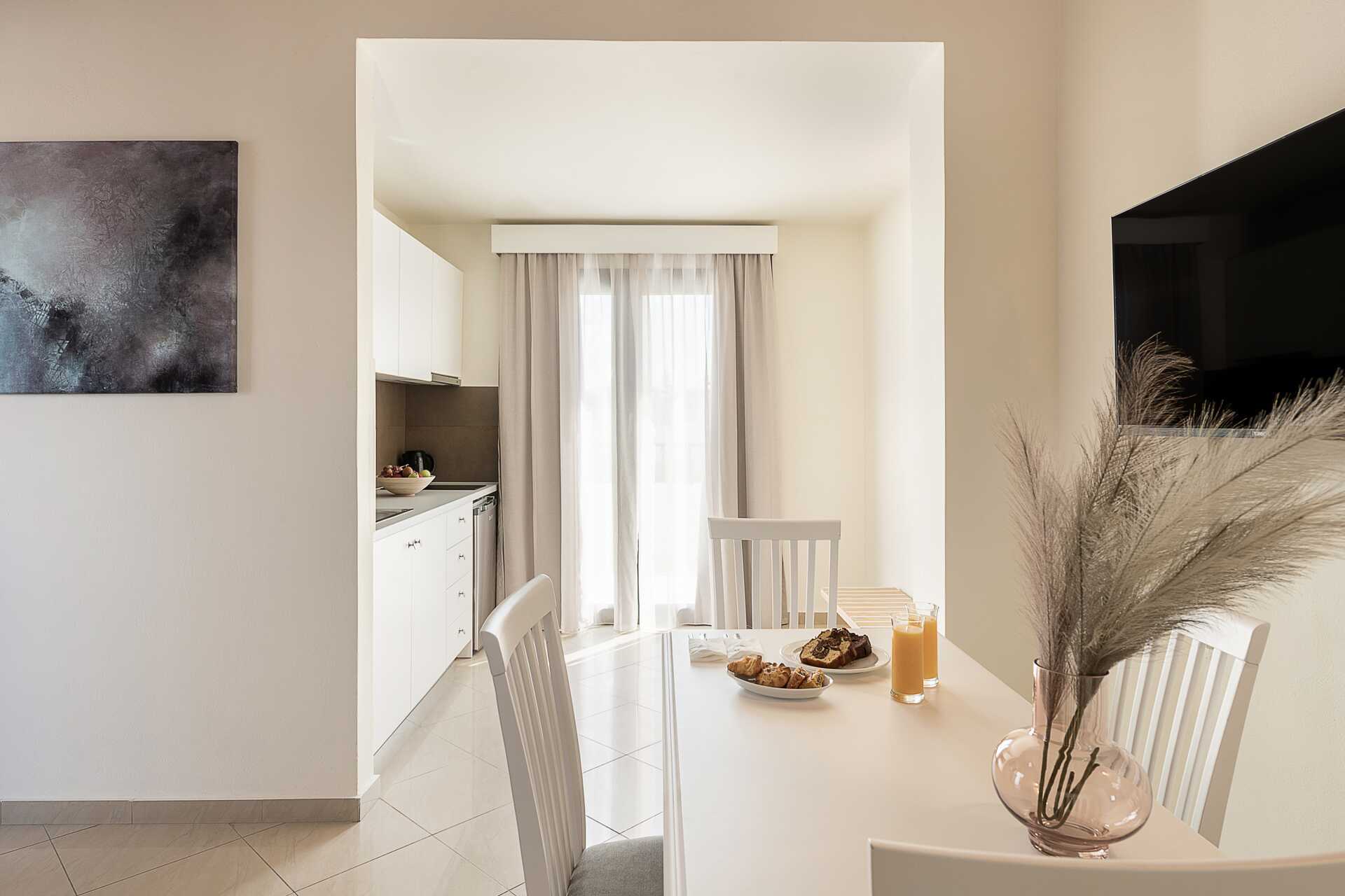 Tvårumslägenhet med balkong eller terrass. Sovrum och kombinerat vardagsrum/minikök. En dubbelsäng. Möjlighet till extrabädd i bäddsoffa. Minikök med kylskåp, kokplattor och enkel köksutrustning. Wifi, luftkonditionering och deponering ingår. Tv med internationella kanaler. Strykjärn och strykbräda. Badrockar och tofflor. Hårtork. Badrum med badkar eller dusch samt wc. Städning 7 ggr/vecka.