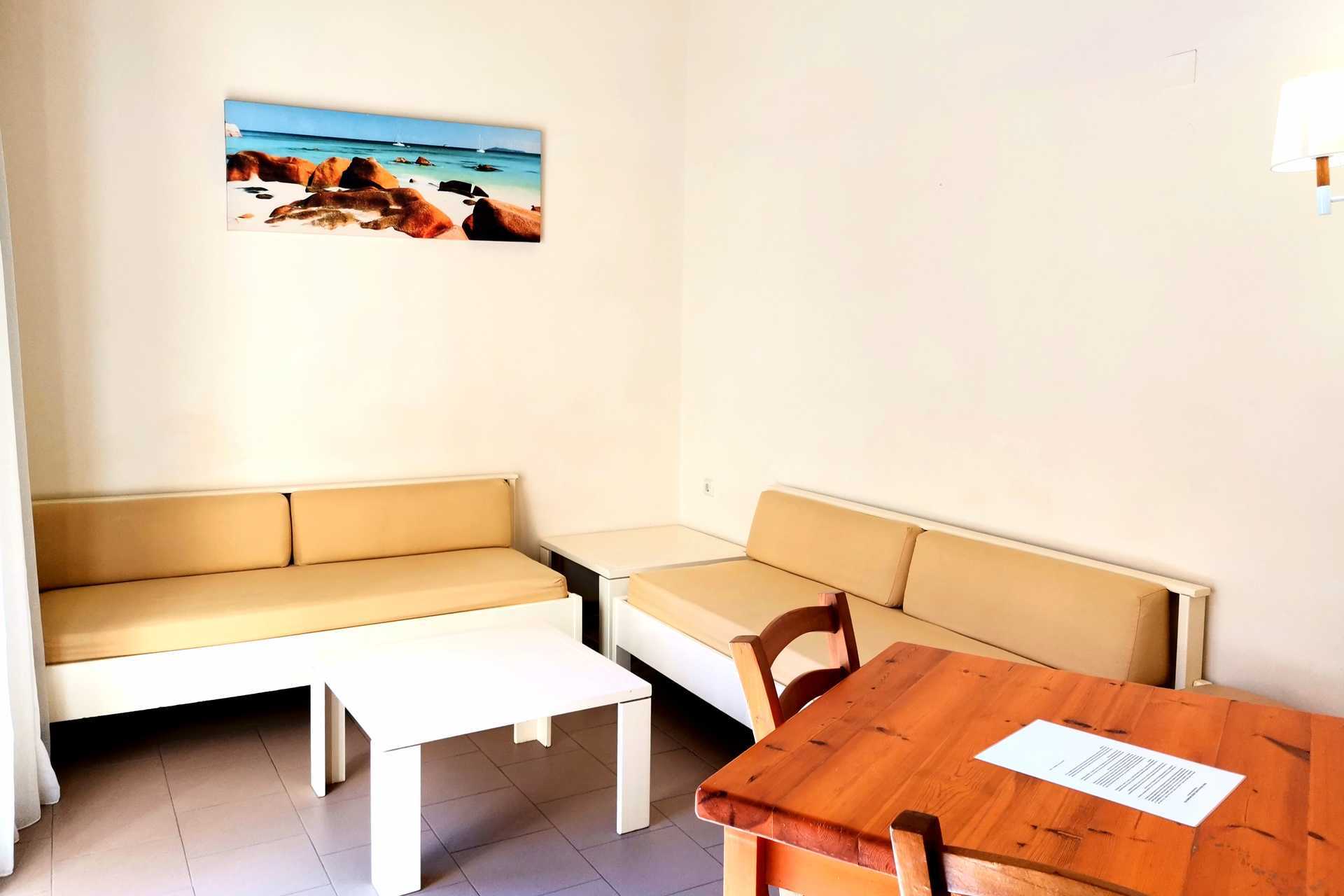Tvårumslägenhet med balkong eller terrass, vissa med begränsad havsutsikt. Sovrum och kombinerat vardagsrum med minikök. Två enkelsängar. Möjlighet till extrabäddar i bäddsoffa. Minikök med kokplattor, vattenkokare, kylskåp och enkel köksutrustning. Wifi, deponering och luftkonditionering - luftkonditionering finns endast i vardagsrummet/köket - ingår. Tv med internationella kanaler. Hårtork. Badrum med badkar eller dusch samt wc. Städning 7 ggr/vecka.