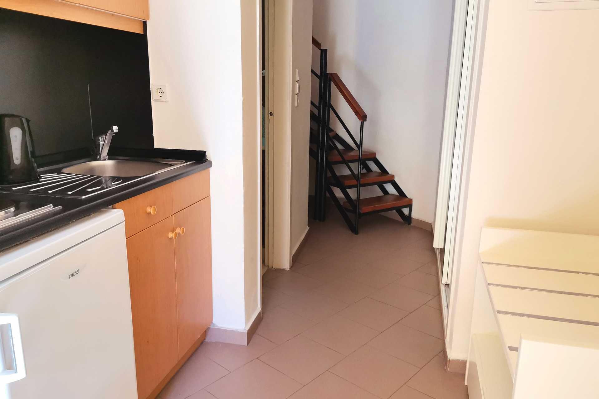 Tvårumslägenhet i etage med balkong eller terrass. På entréplan finns ett kombinerat vardagsrum med minikök samt ett badrum. En trappa upp finns sovloft med två enkelsängar. Öppen planlösning med en smal och brant trappa mellan våningarna. Möjlighet till extrabäddar i bäddsoffa. Minikök med kokplattor, vattenkokare, kylskåp och enkel köksutrustning. Wifi, deponering och luftkonditionering - luftkonditionering finns endast på den övre våningen - ingår. Hårtork. Badrum med dusch och wc. Städning 7 ggr/vecka.