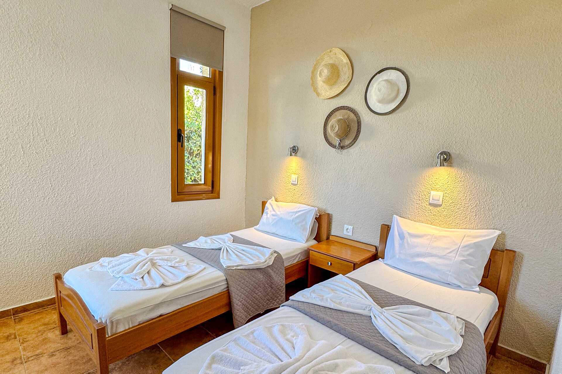 Enrumslägenhet med balkong. Sovrum kombinerat med minikök. Två enkelsängar. Minikök med kylskåp, kaffekokare, smörgåsgrill, kokplattor och enkel köksutrustning. Wifi, luftkonditionering och deponering ingår. Tv med lokala kanaler. Hårtork. Små badrum med dusch och wc. Städning 6 ggr/vecka.
