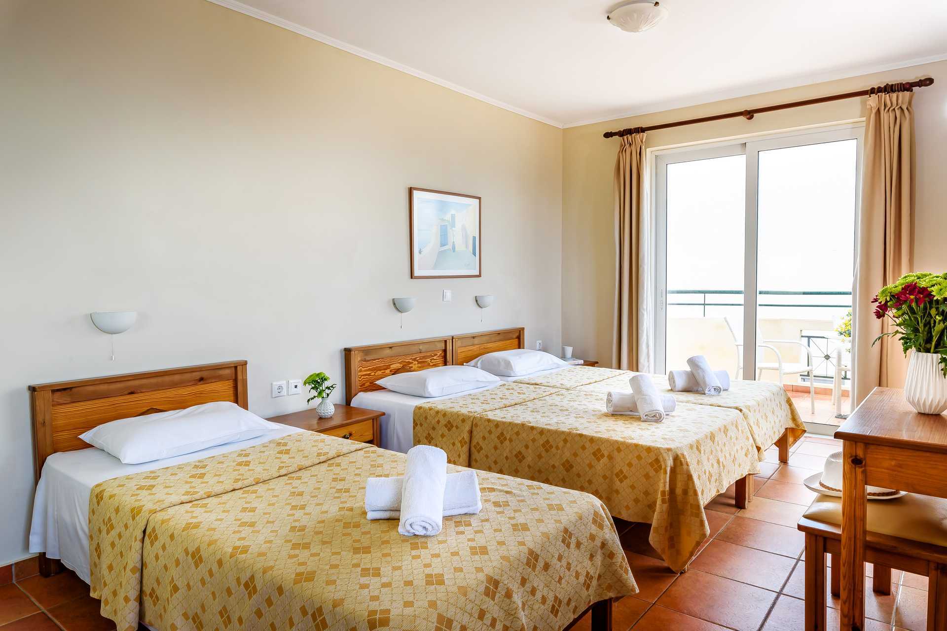 Enrumslägenhet med balkong eller markbalkong, vissa balkonger har begränsad havsutsikt. Kombinerat sovrum med vardagsrum och minikök. Två enkelsängar. Möjlighet till extrabädd i enkelsäng. Minikök med kylskåp, kokplattor och enkel köksutrustning. Wifi och luftkonditionering ingår. Deponering mot avgift. Badrum med dusch och wc. Städning 6 ggr/vecka.