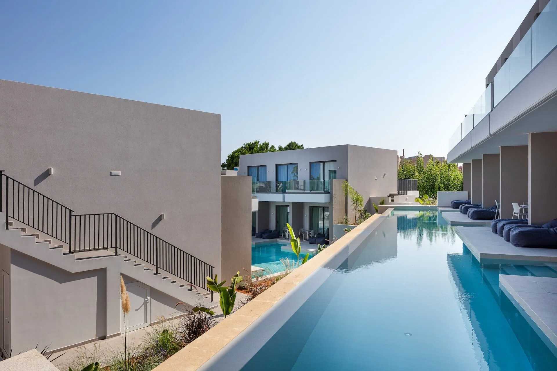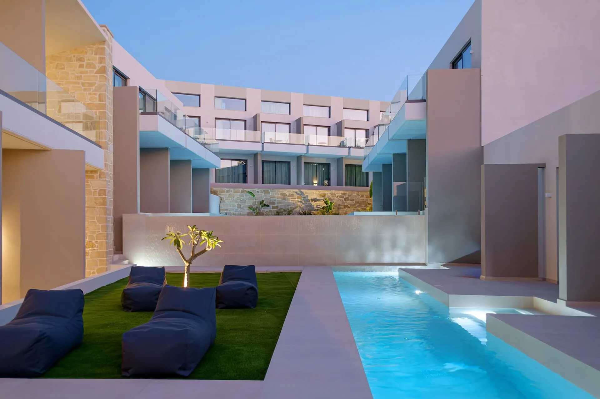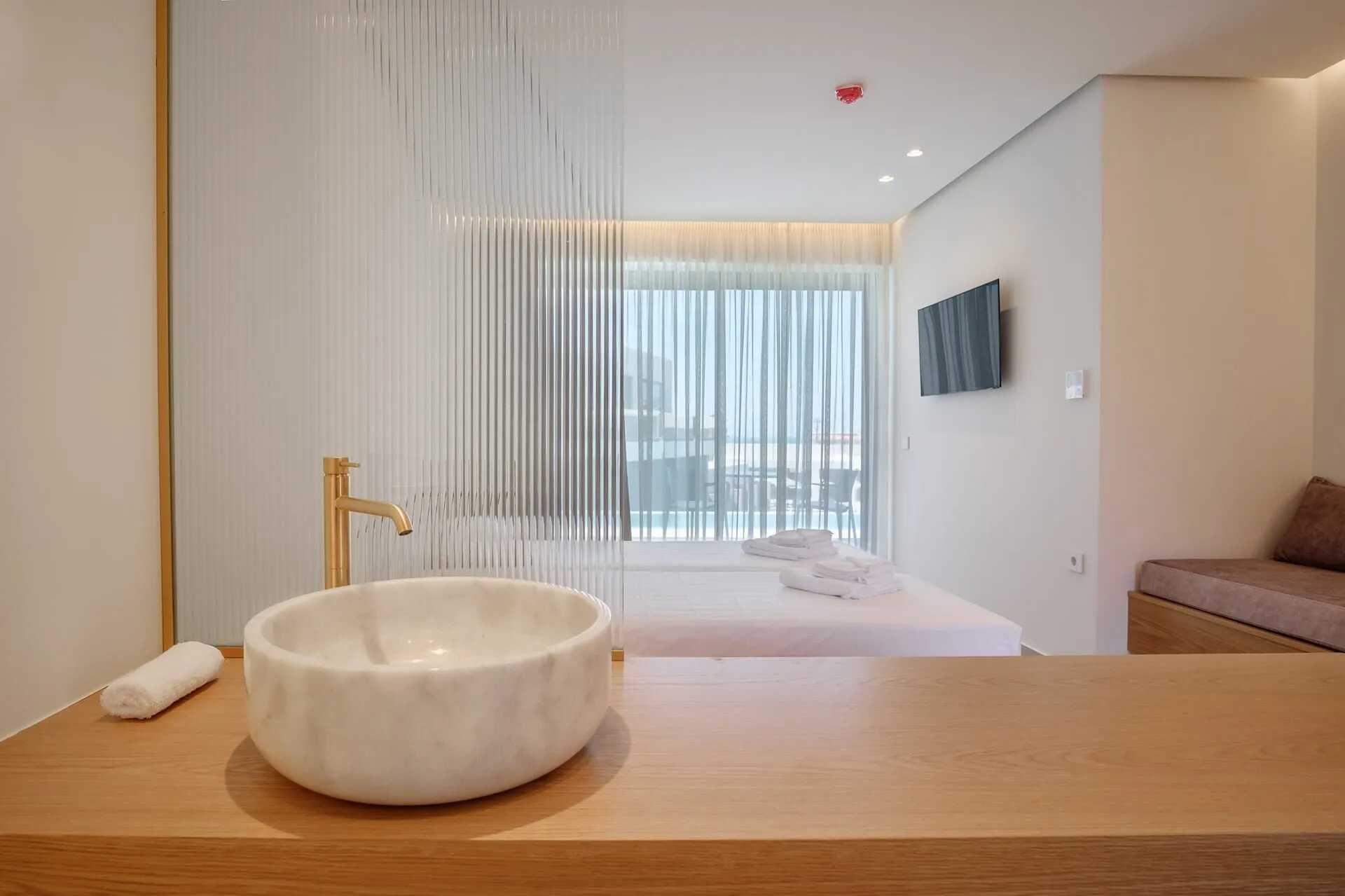 Juniorsvit med terrass och utgång till en gemensam pool. En dubbelsäng eller två enkelsängar. Wifi, luftkonditionering och deponering ingår. Minibar. Vattenkokare samt kaffe och te. Espresso kaffebryggare - två kapslar ingår vid ankomst, påfyllning mot avgift. Badrockar och tofflor. Hårtork. Tvättställ i rummet. Frostad glasdörr till dusch och wc. Städning 7 ggr/vecka.