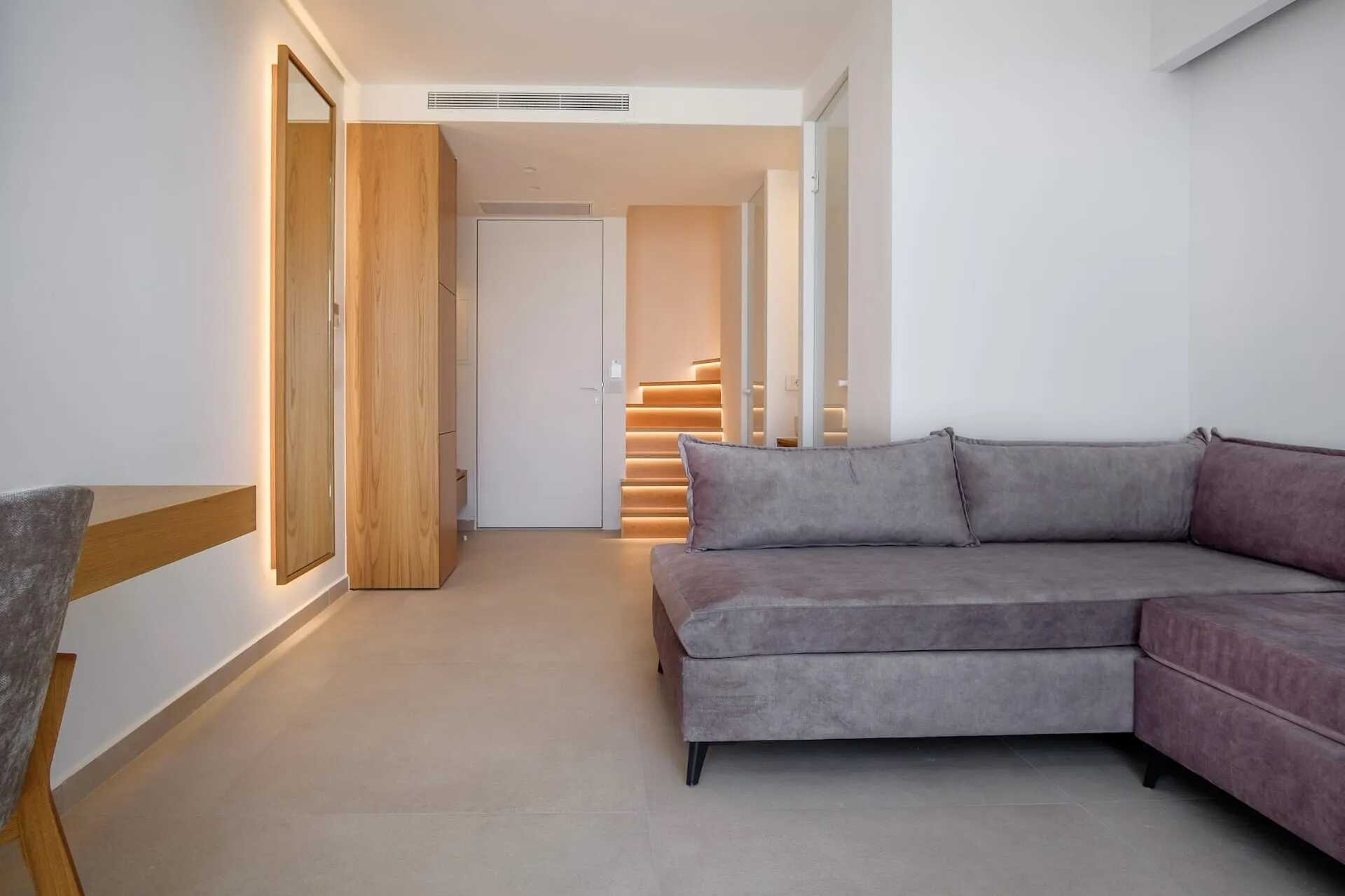 Svit med balkong eller terrass. I entréplan finns ett vardagsrum med tvättfat i rummet samt frostade glasdörrar till dusch och wc, två bäddsoffor som extrasängar samt en balkong. En trappa upp finns ett sovloft med en dubbelsäng eller två enkelsängar och ett badrum. Wifi, luftkonditionering och deponering ingår. Minibar. Vattenkokare samt kaffe och te. Espresso kaffebryggare - två kapslar ingår vid ankomst, påfyllning mot avgift. Badrockar och tofflor. Hårtork. Städning 7 ggr/vecka.