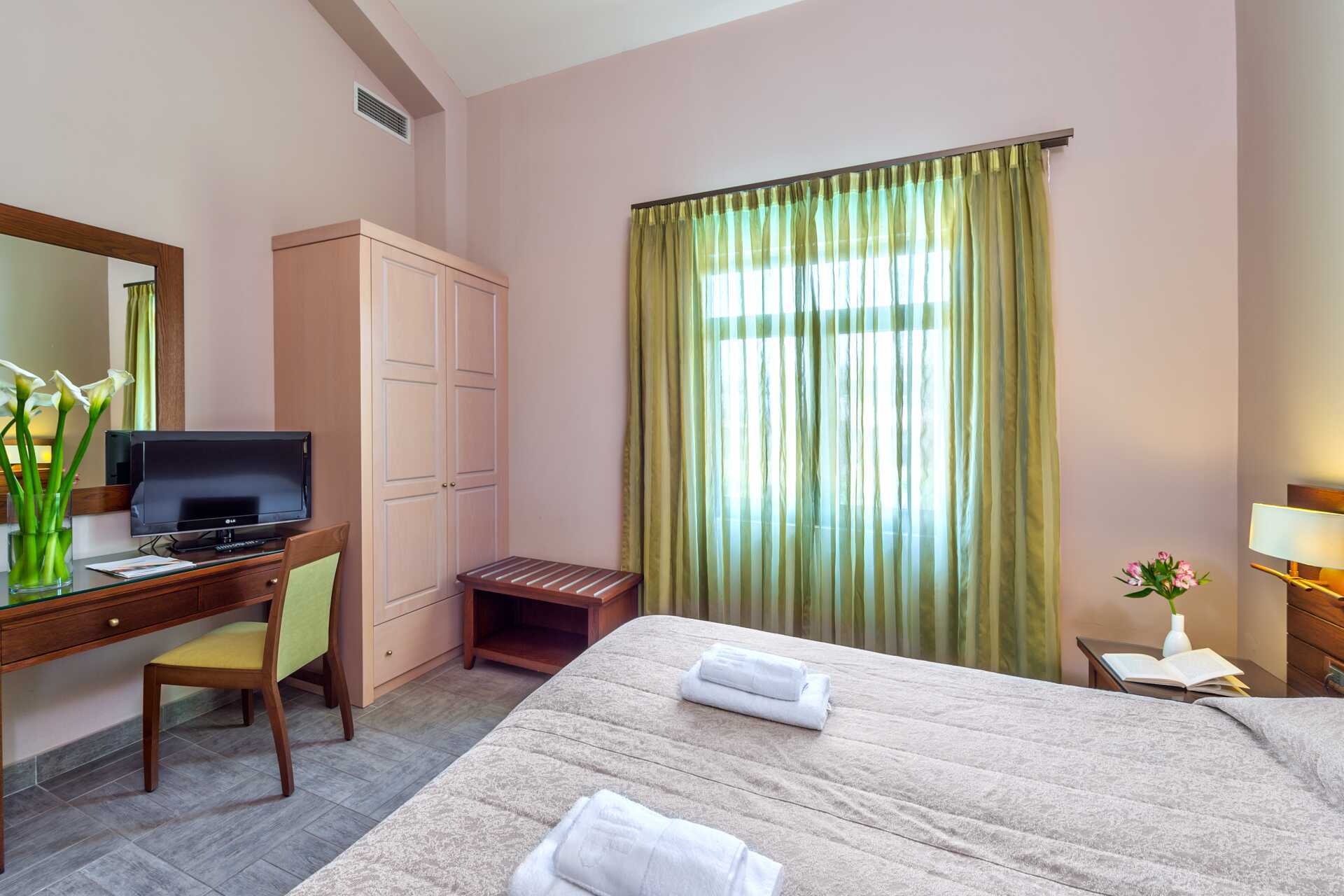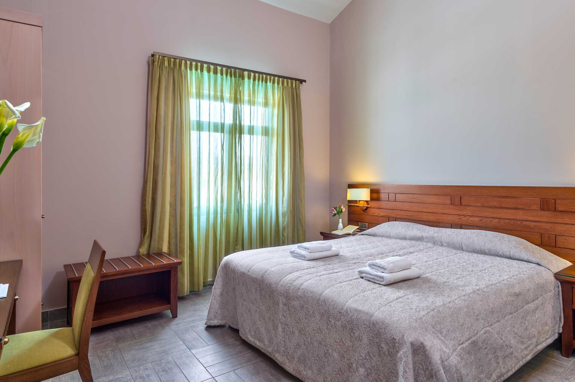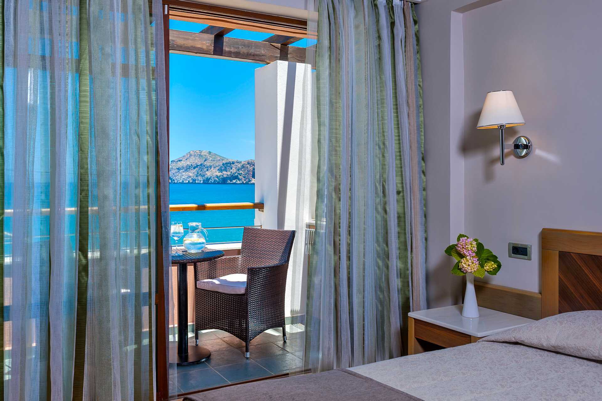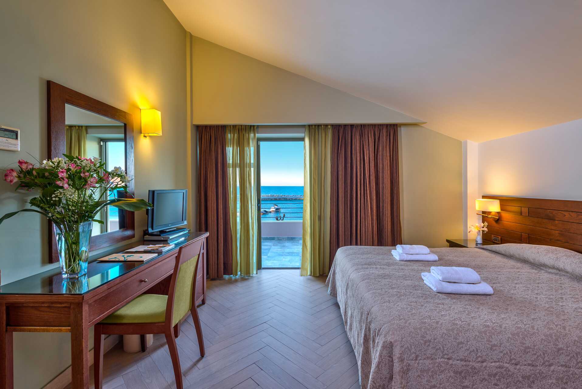 Dubbelrum med balkong eller terrass, vissa med havsutsikt, med begränsad havsutsikt eller med poolo-/trädgårdsutiskt. En dubbelsäng eller två enkelsängar. Möjlighet till extrabädd i hopfällbar säng. Wifi och luftkonditionering ingår. Deponering mot avgift. Kylskåp. Tv med internationella kanaler. Badrum med badkar eller dusch samt wc. Städning 7 ggr/vecka. Barn under två år räknas in i maxantalet personer i rummet.