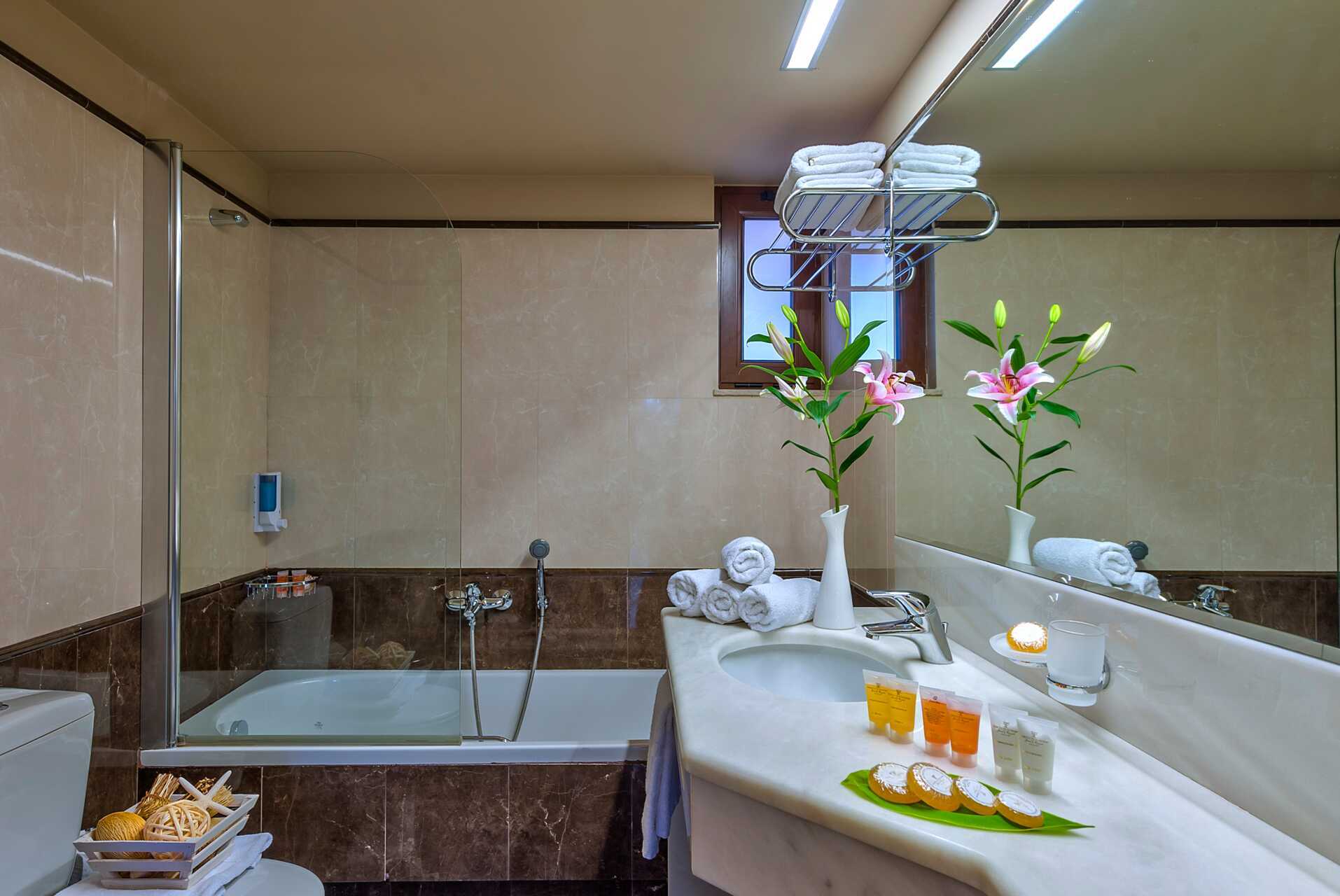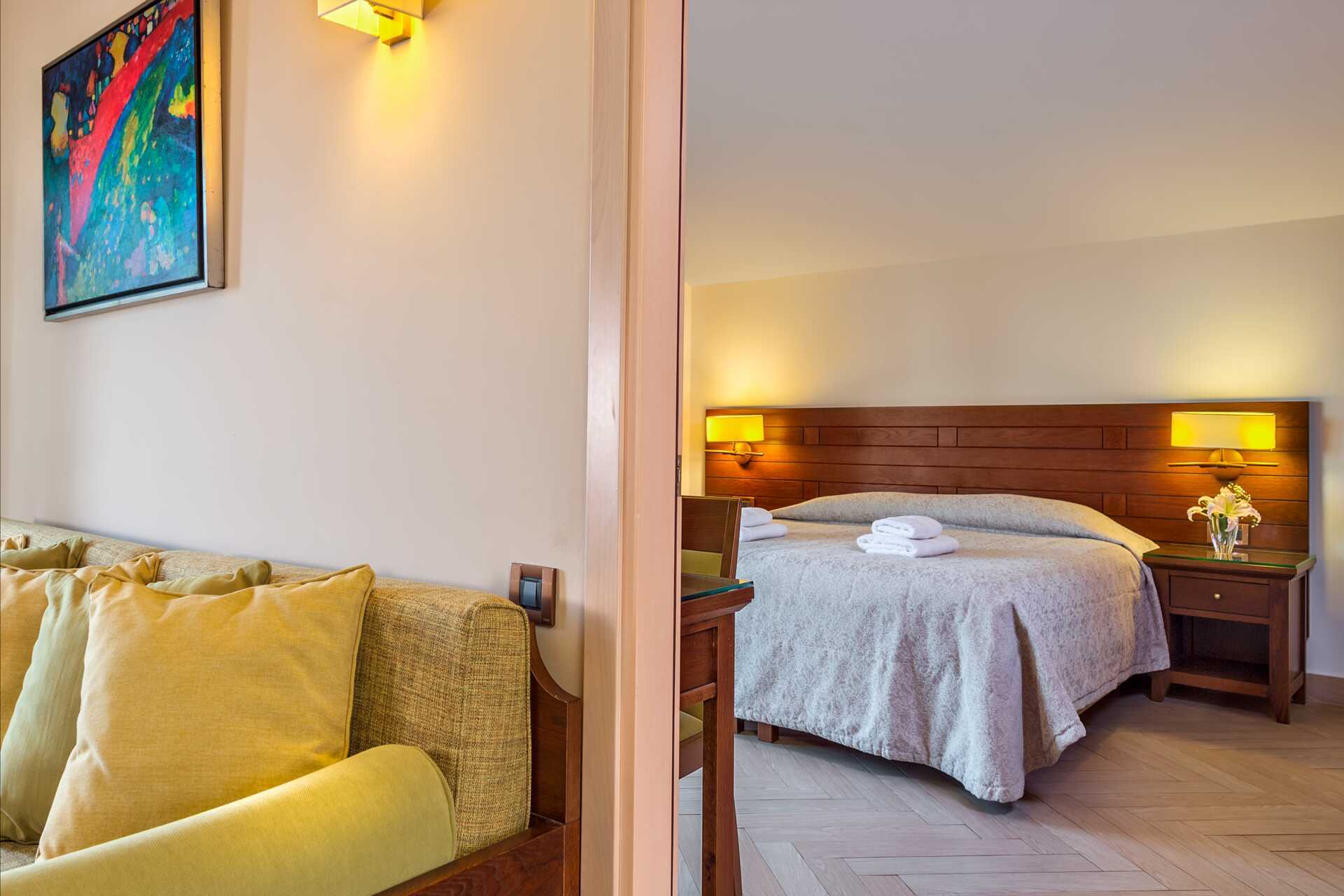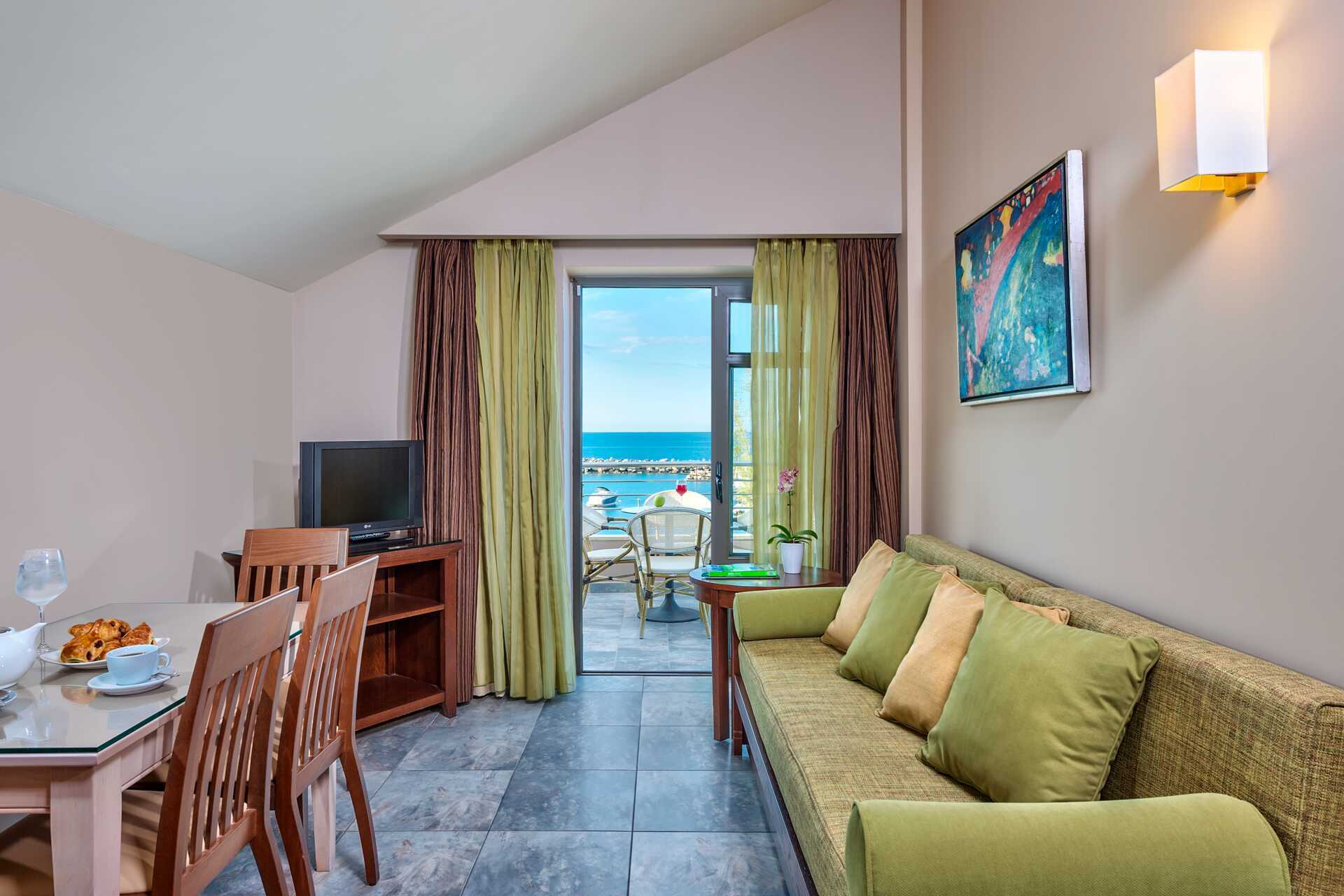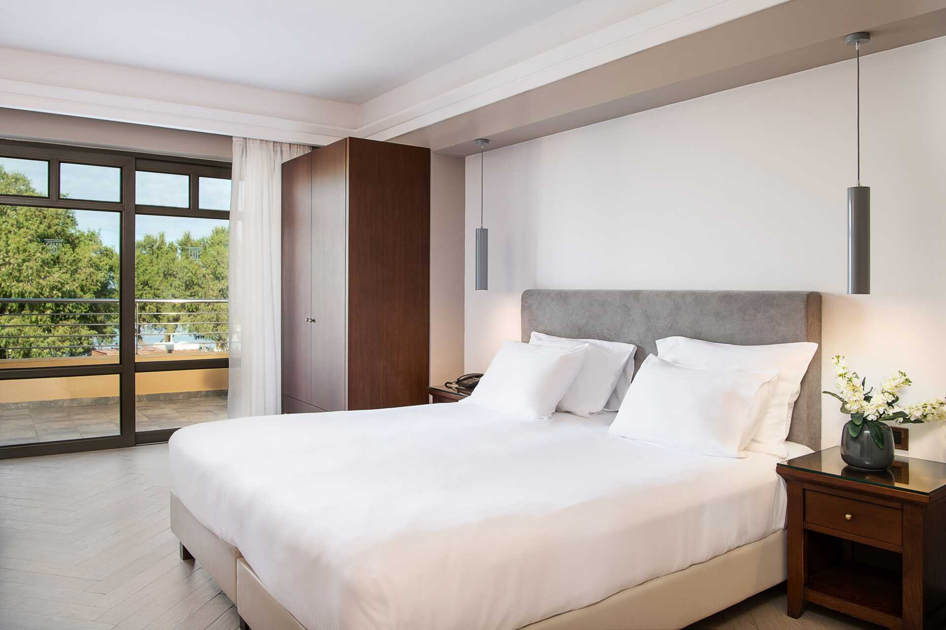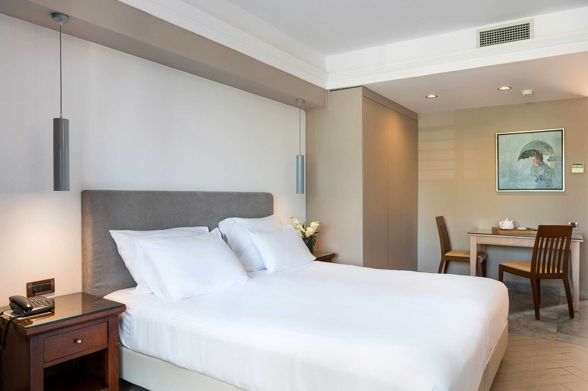 Dubbelrum med balkong eller terrass, vissa med havsutsikt, med begränsad havsutsikt eller med poolo-/trädgårdsutiskt. En dubbelsäng eller två enkelsängar. Möjlighet till extrabädd i hopfällbar säng. Wifi och luftkonditionering ingår. Deponering mot avgift. Kylskåp. Tv med internationella kanaler. Badrum med badkar eller dusch samt wc. Städning 7 ggr/vecka. Barn under två år räknas in i maxantalet personer i rummet.