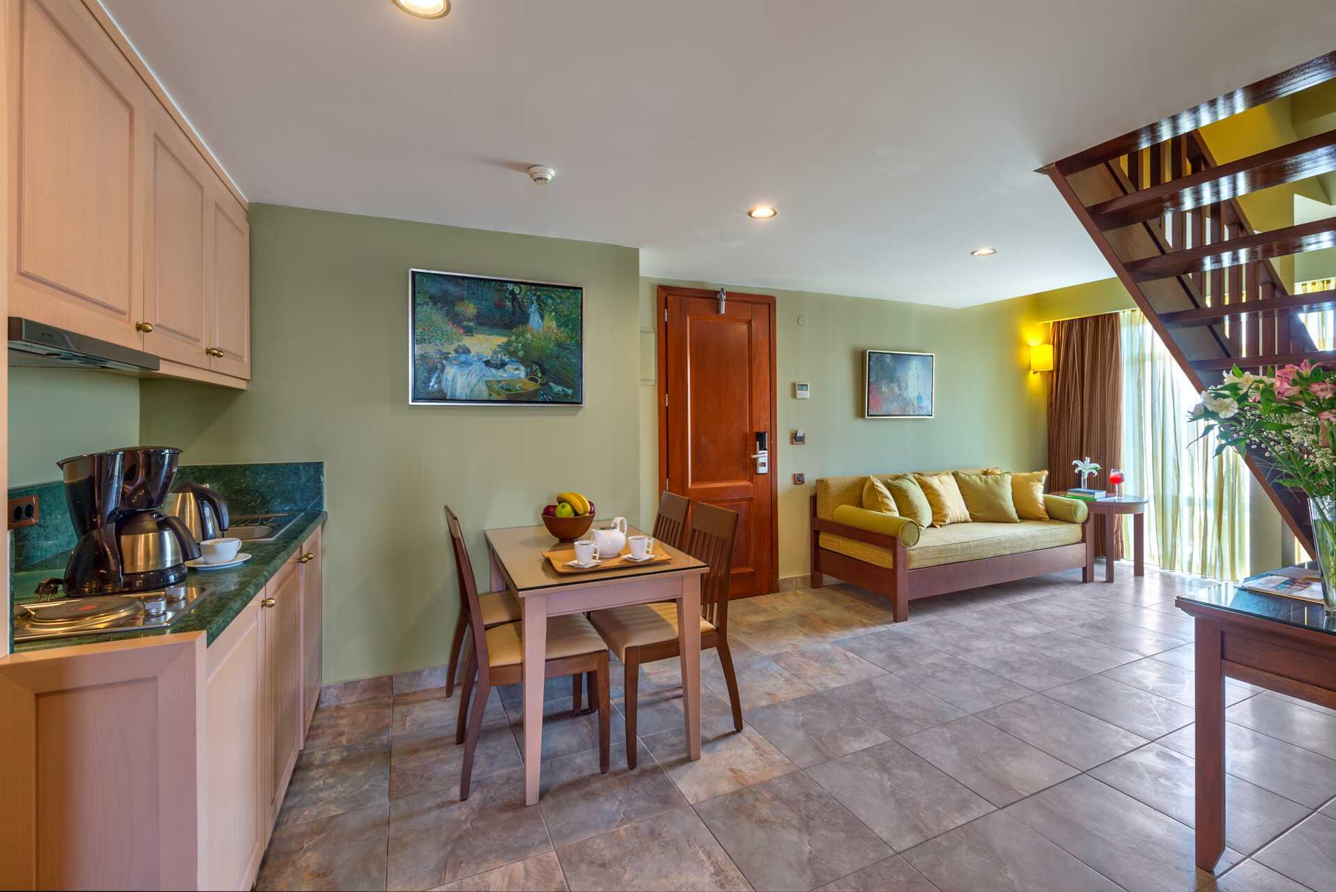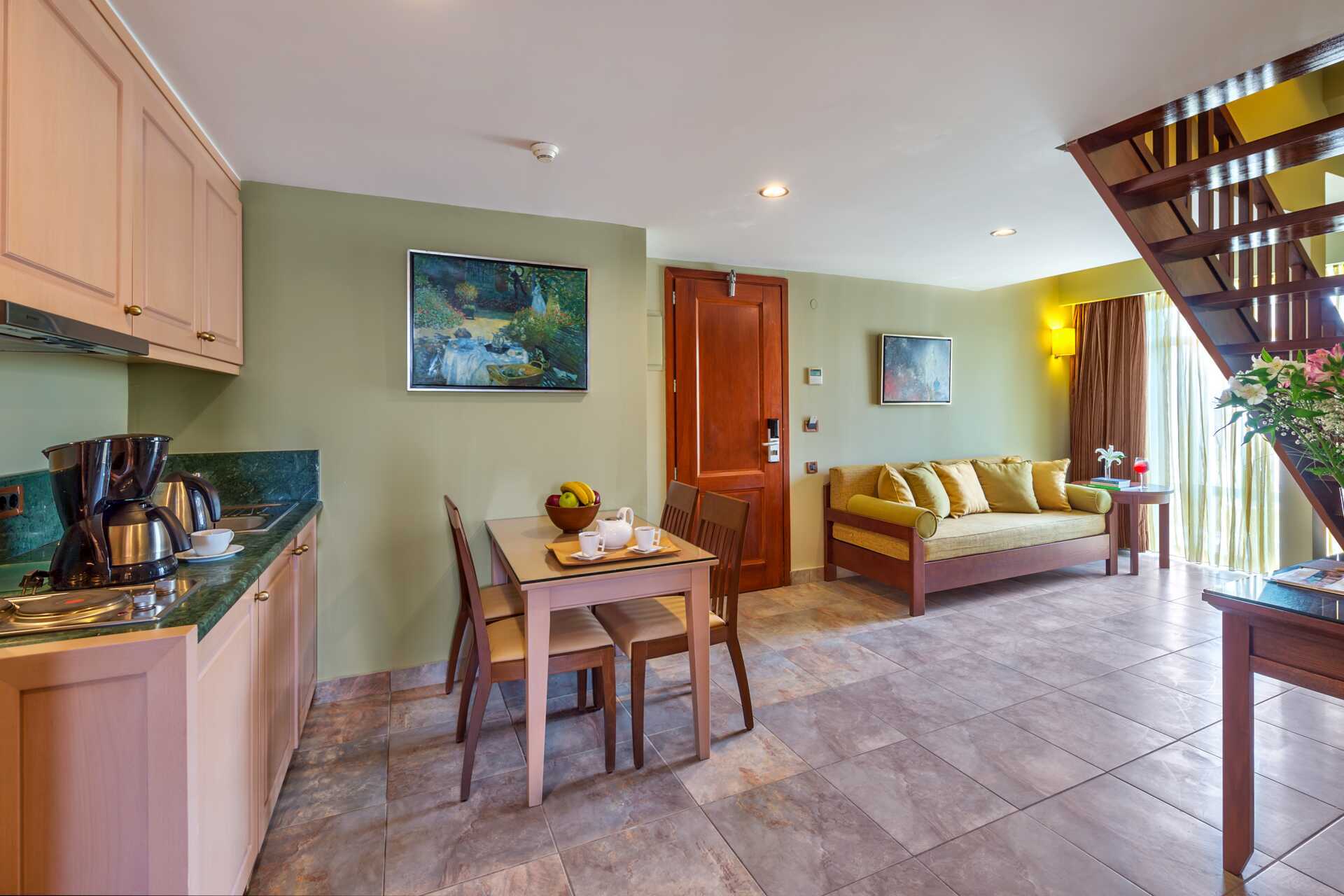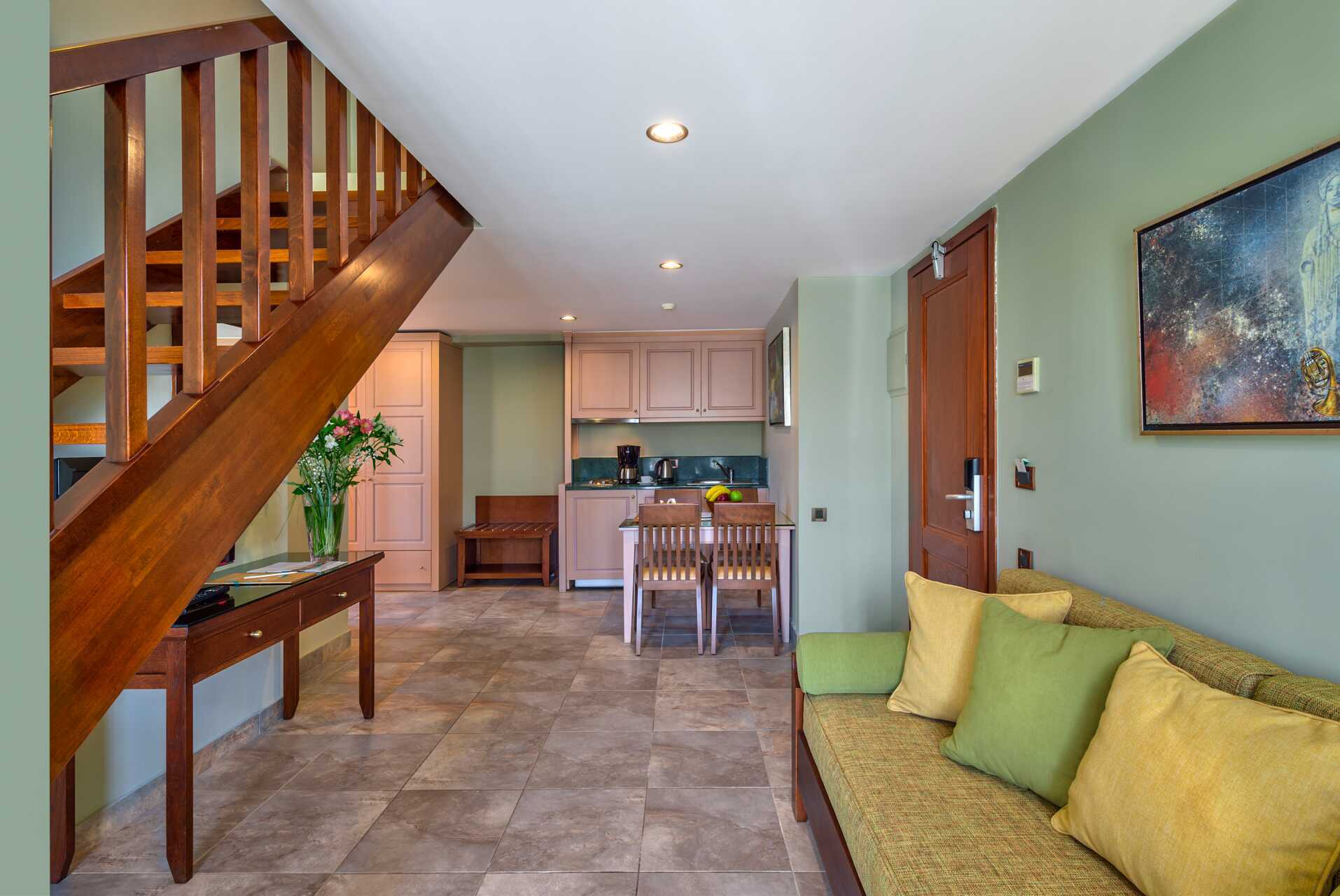Dubbelrum i etage med balkong eller terrass och poolutsikt. I entréplan finns möjlighet till extrabäddar i två bäddsoffor samt ett badrum. En trappa upp finns ett sovloft med en dubbelsäng eller två enkelsängar. En skjutdörr skiljer rummet från sovloftet. Wifi och luftkonditionering ingår. Deponering mot avgift. Kylskåp. Tv med internationella kanaler. Badrum med dusch och wc. Städning 7 ggr/vecka. Barn under två år räknas in i maxantalet personer i rummet.