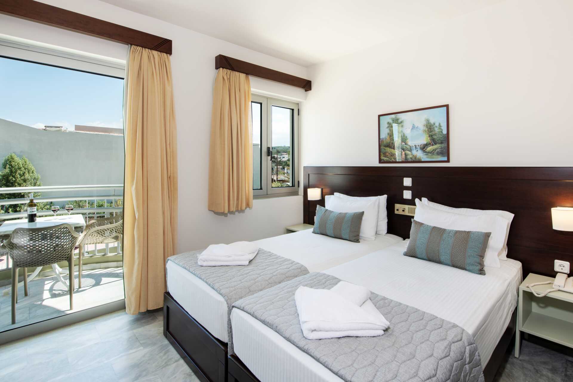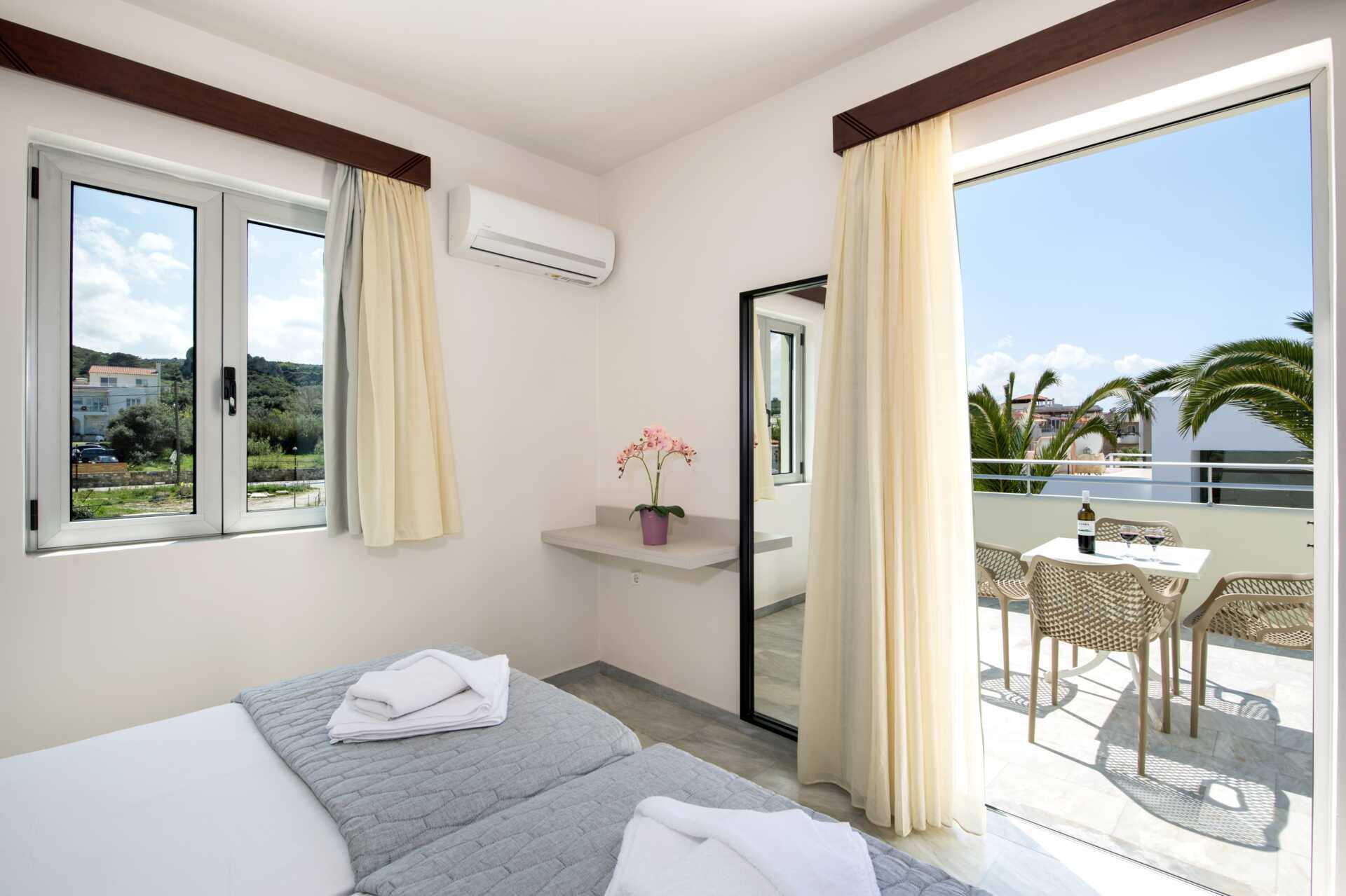 Tvårumslägenheter belägna i strand-/poolbyggnaden. Balkong, vissa med havsutsikt eller begränsad havsutsikt. Ett sovrum samt ett kombinerat vardagsrum/minikök. Två enkelsängar. Möjlighet till extrabäddar i två bäddsoffor. I lägenheterna finns en flaska vin och en flaska vatten vid ankomst. Minikök med kokplattor, kylskåp, kaffebryggare, vattenkokare, brödrost och enkel köksutrustning. Wifi, luftkonditionering och deponering ingår. Tv med satellitkanaler. Strykjärn och strykbräda. Badrockar och tofflor. Hårtork. Badrum med dusch och wc. Städning 6 gånger/vecka.
