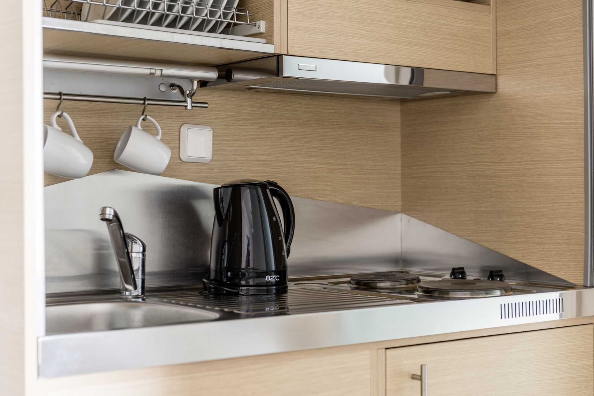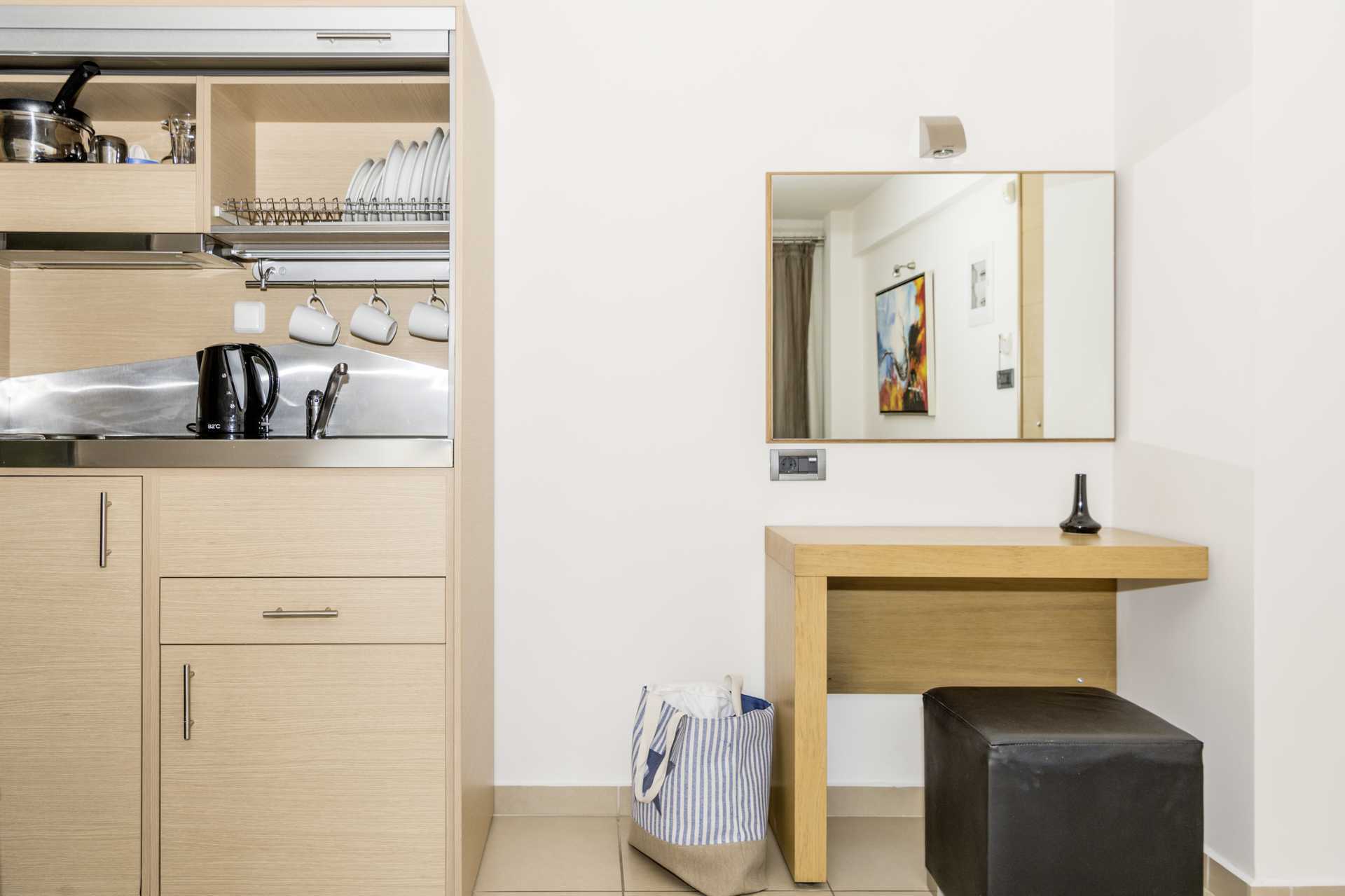 Enrumslägenhet med balkong eller markterrass, vissa med utsikt mot poolen. Kombinerat sovrum och minikök. Två enkelsängar. Möjlighet till extrabädd i bäddsoffa. Minikök med kokplattor, kylskåp, vattenkokare och enkel köksutrustning. Wifi och luftkonditionering ingår. Deponering mot avgift. Tv med internationella kanaler. Hårtork. Badrum med dusch och wc. Städning 6 ggr/vecka.