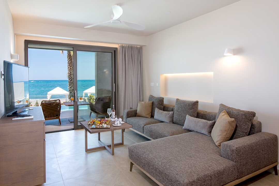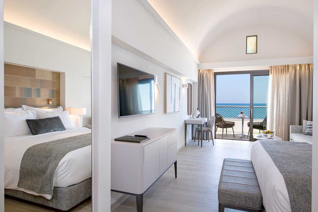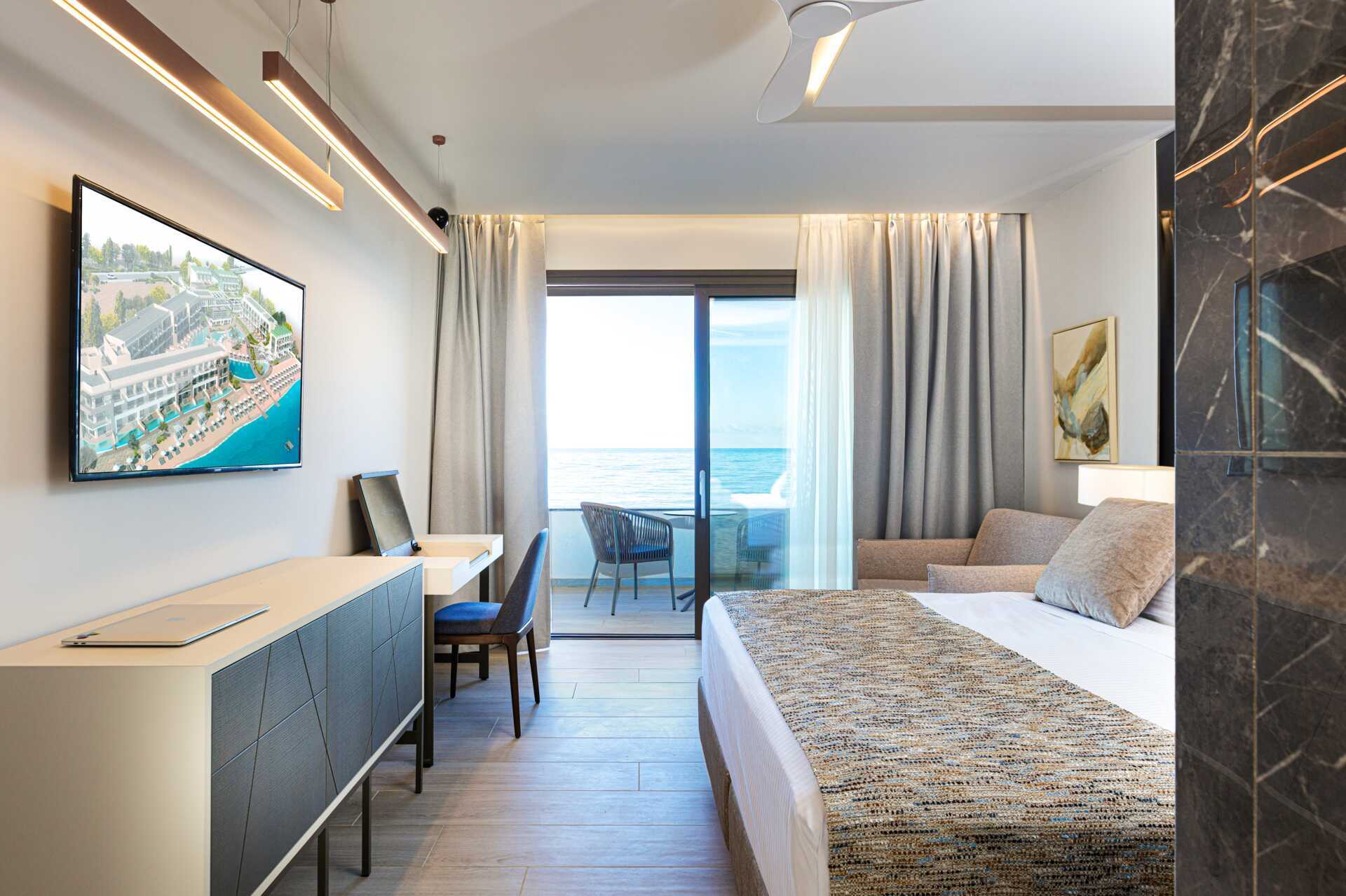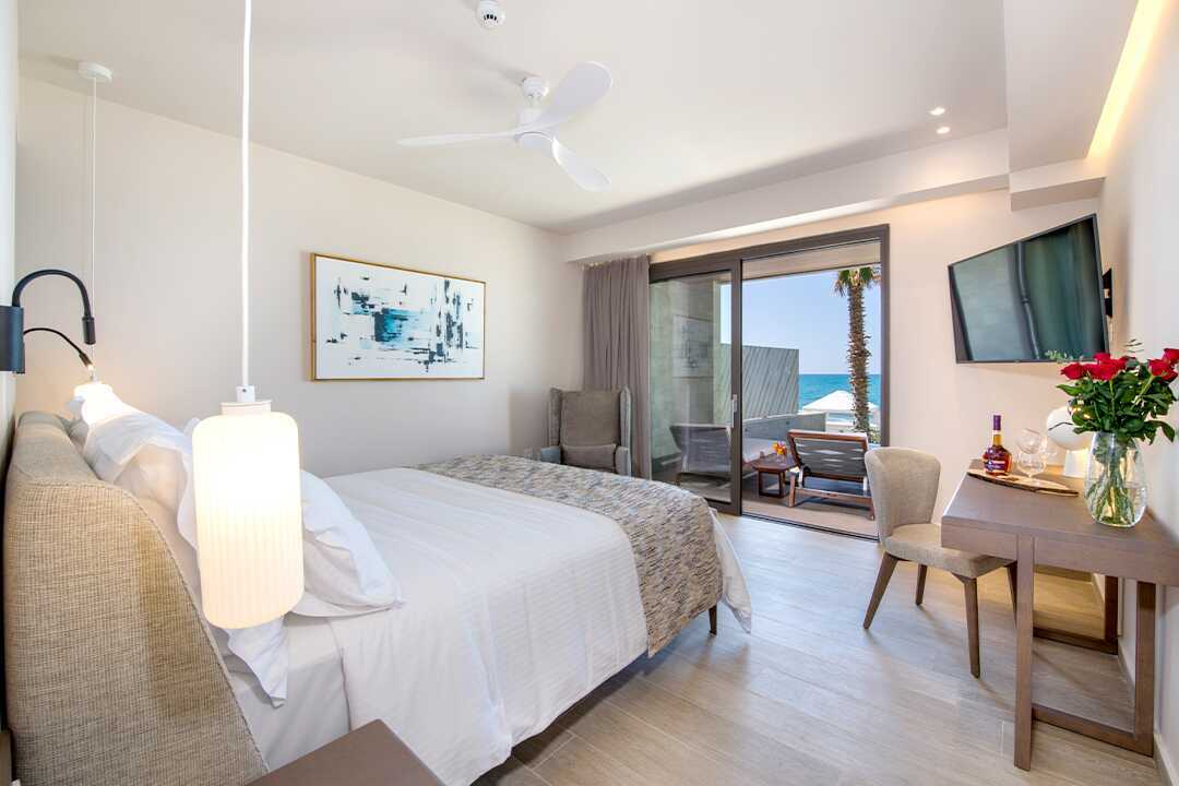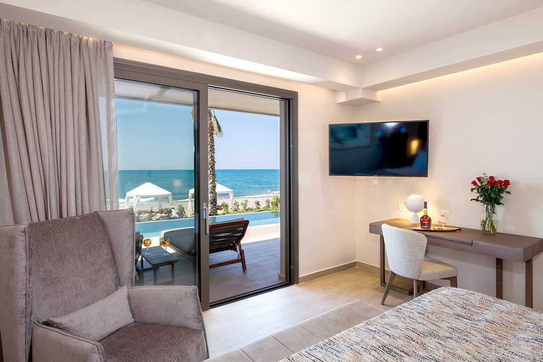 Juniorsvit Seafront med balkong och havsutsikt. Juniorsviterna ligger med bästa läge nära stranden och havet. En dubbelsäng. Möjlighet till extrabädd i bäddsoffa. Wifi, luftkonditionering och deponering ingår. Kylskåp. Espresso kaffemaskin - kapslar ingår och fylls på varje dag. Vattenkokare samt kaffe och te. Tv med internationella kanaler. Strykjärn och strykbräda. Badrockar och tofflor. Hårtork. Badrum med badkar eller dusch samt wc. Städning 7 ggr/vecka.