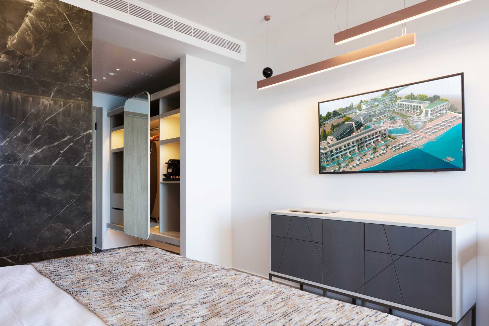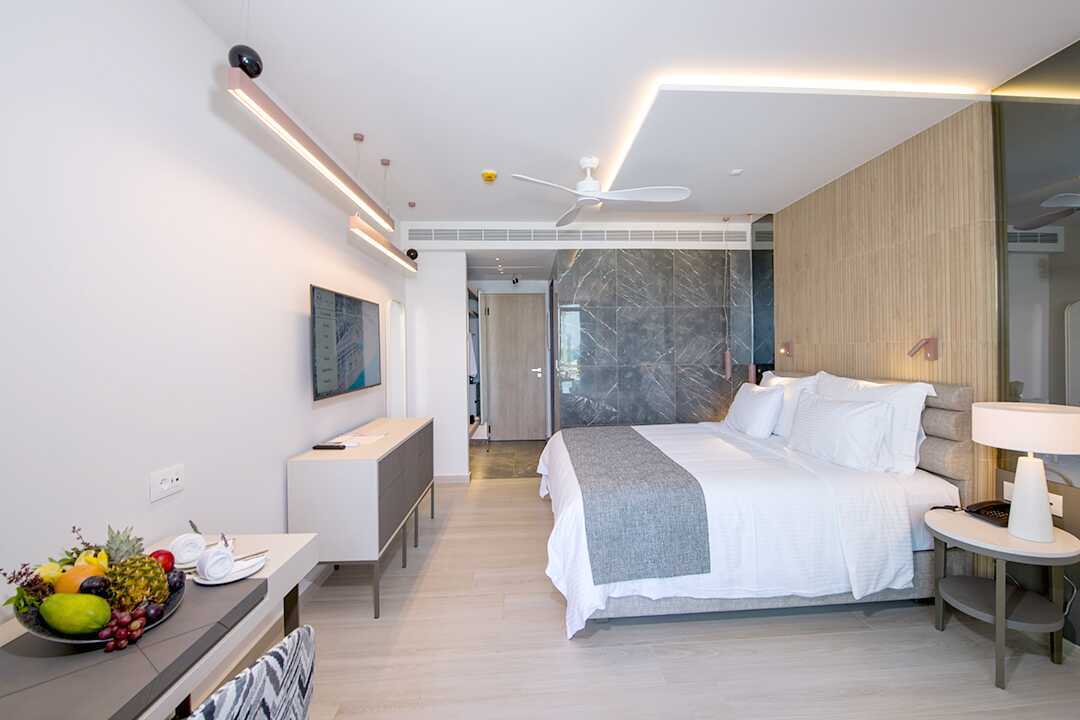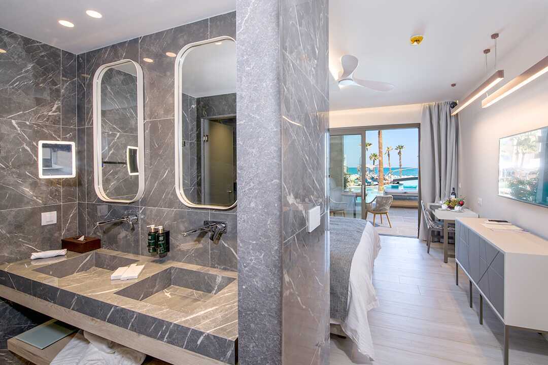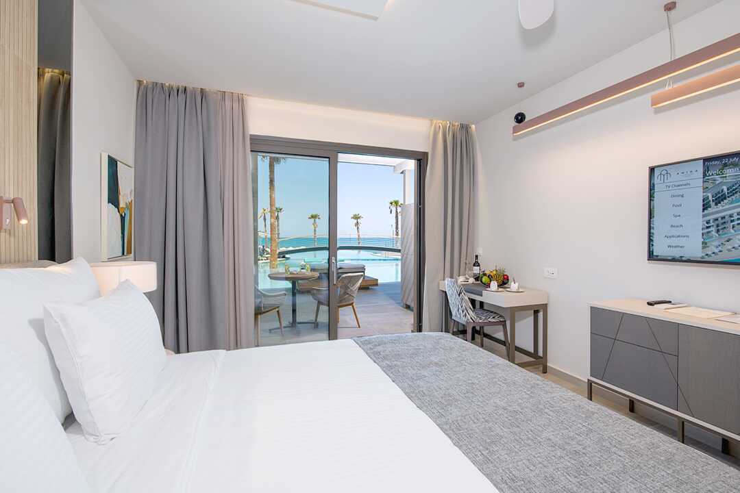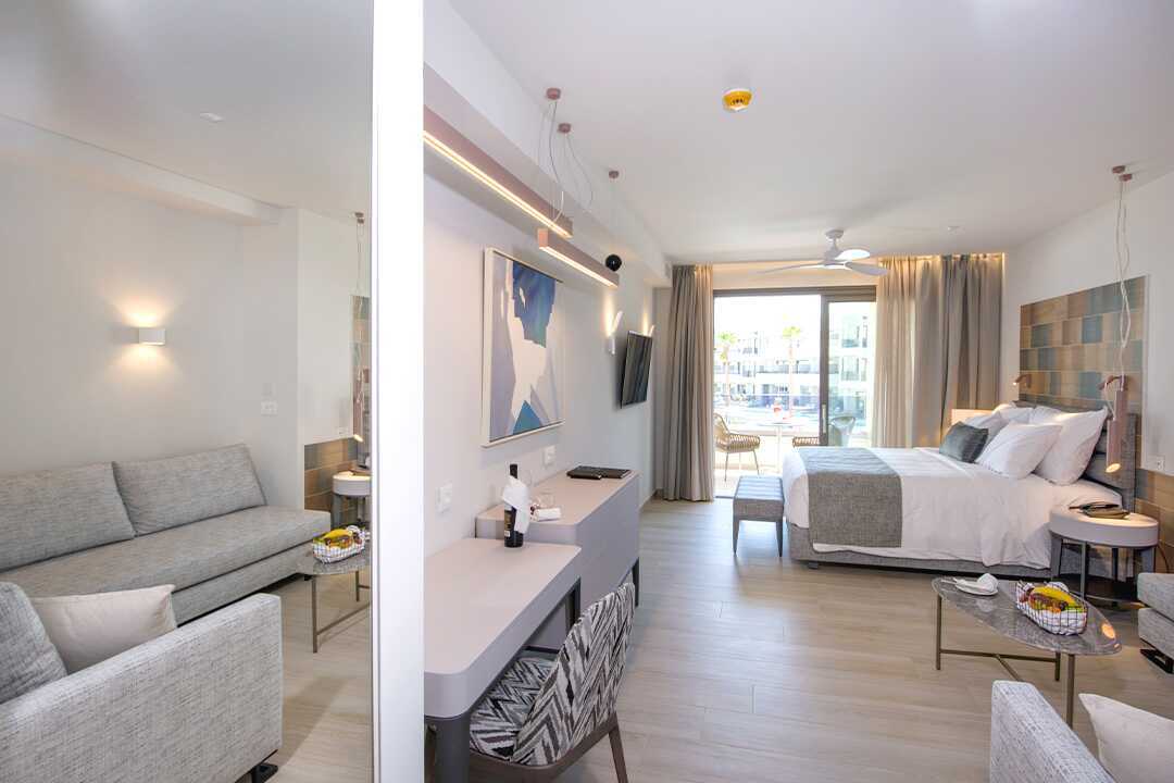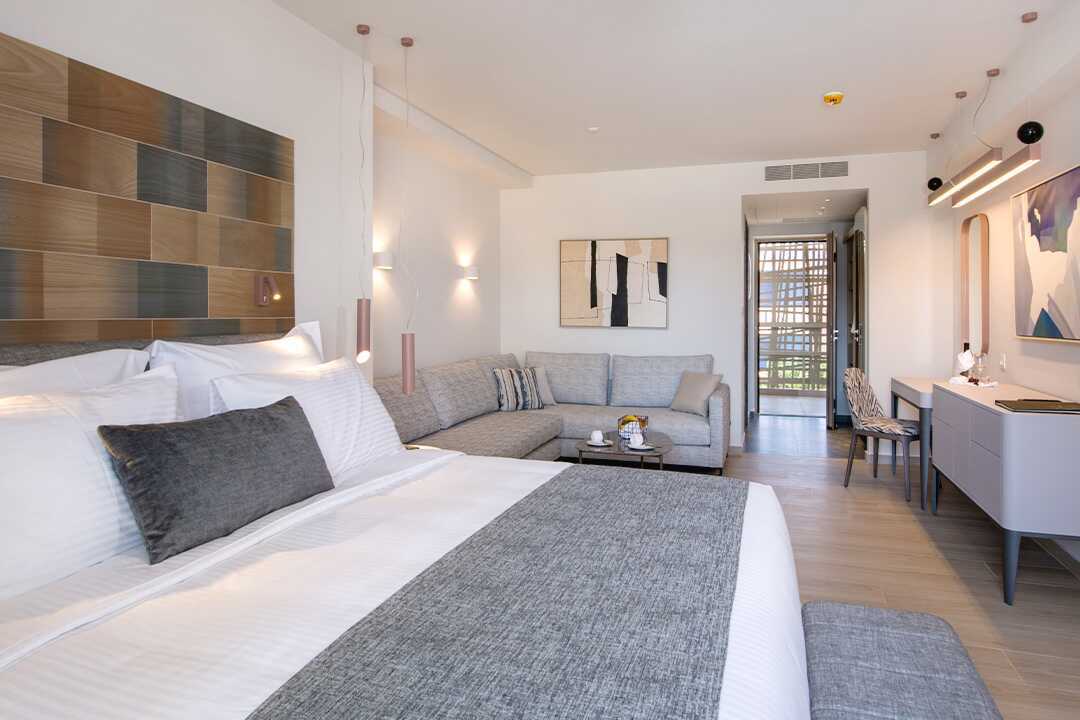 Juniorsvit Seafront med balkong och havsutsikt. Juniorsviterna ligger med bästa läge nära stranden och havet. En dubbelsäng. Möjlighet till extrabädd i bäddsoffa. Wifi, luftkonditionering och deponering ingår. Kylskåp. Espresso kaffemaskin - kapslar ingår och fylls på varje dag. Vattenkokare samt kaffe och te. Tv med internationella kanaler. Strykjärn och strykbräda. Badrockar och tofflor. Hårtork. Badrum med badkar eller dusch samt wc. Städning 7 ggr/vecka.