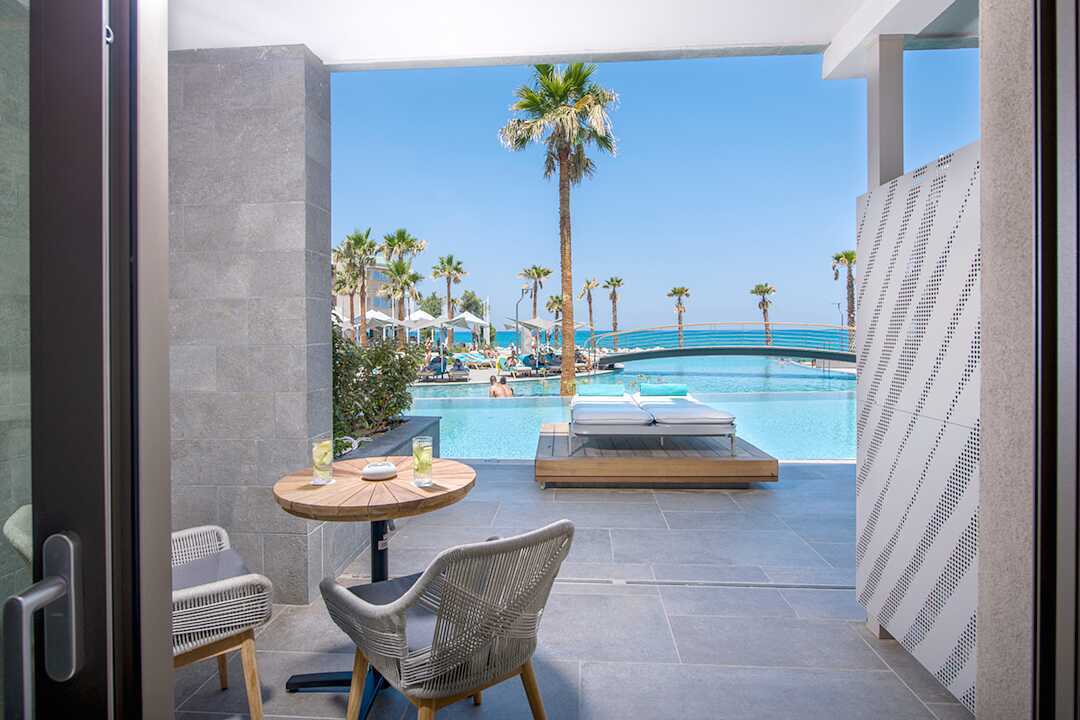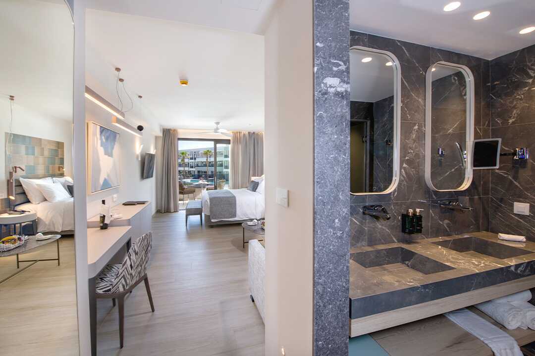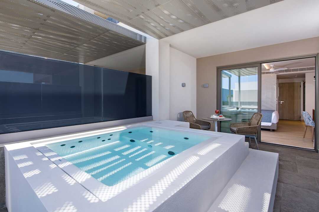 Juniorsvit med uteplats och delad pool med poolutsikt. På uteplatsen finns bord och stolar samt solstolar. En dubbelsäng. Möjlighet till extrabädd i bäddsoffa. Wifi, luftkonditionering och deponering ingår. Kylskåp. Espresso kaffemaskin - kapslar ingår och fylls på varje dag. Vattenkokare samt kaffe och te. Tv med internationella kanaler. Strykjärn och strykbräda. Badrockar och tofflor. Hårtork. Badrum med badkar eller dusch samt wc. Städning 7 ggr/vecka.