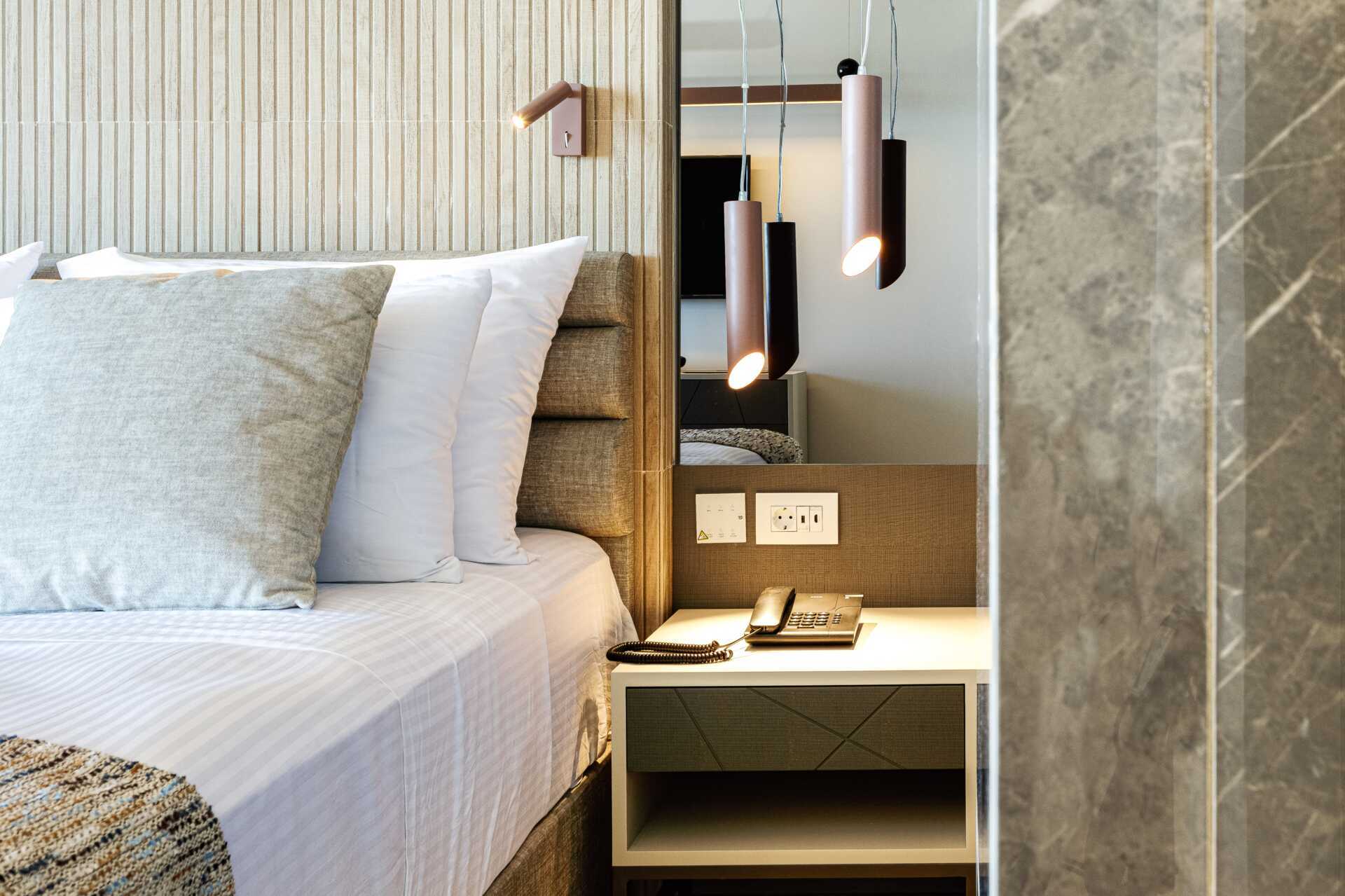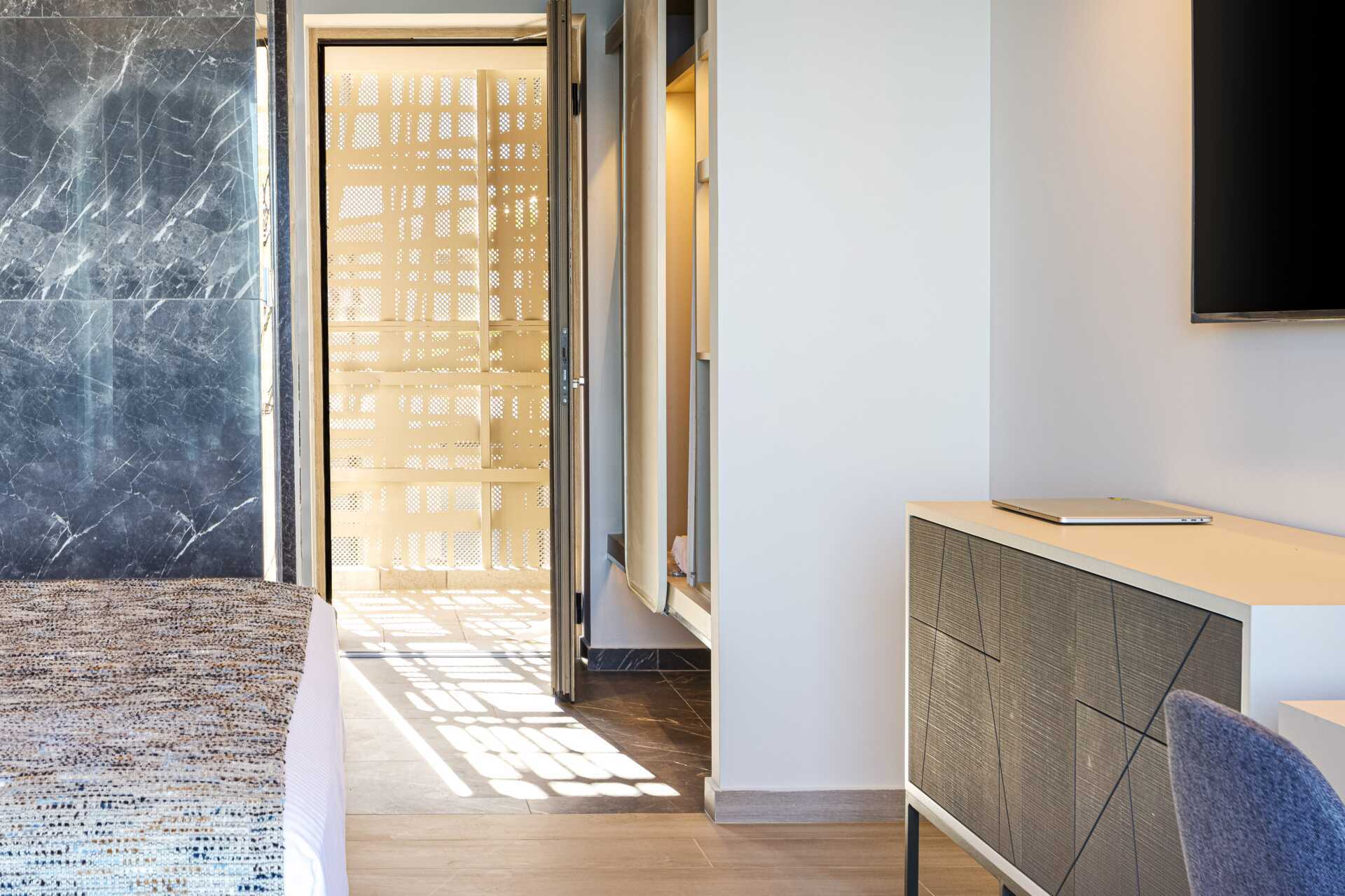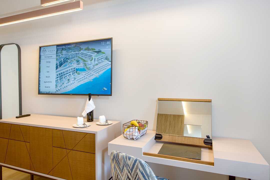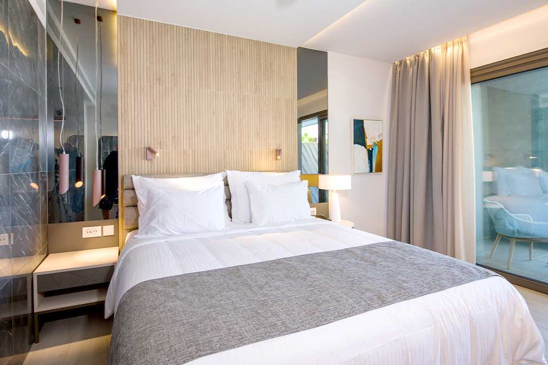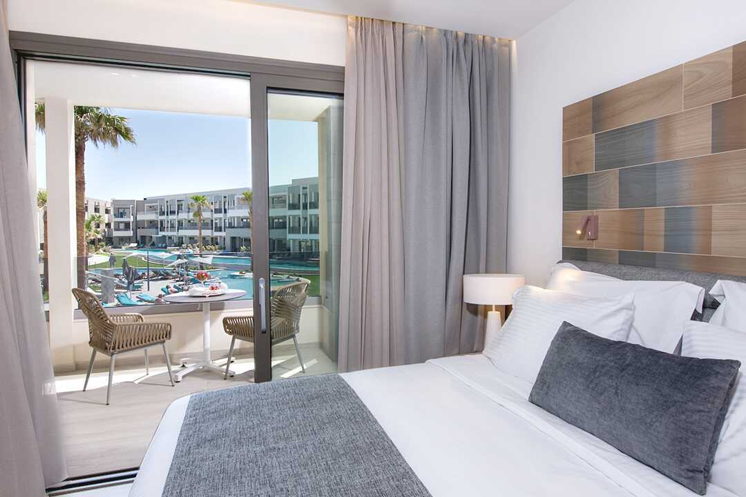 Superiorrum med utgeplats och utgång till delad pool, vissa med havsutsikt och vissa med poolutsikt. På uteplatsen finns solstolat samt bord och stolar. En dubbelsäng. Wifi, luftkonditionering och deponering ingår. Kylskåp. Espresso kaffemaskin - kapslar ingår och fylls på varje dag. Vattenkokare samt kaffe och te. Tv med internationella kanaler. Strykjärn och strykbräda. Badrockar och tofflor. Hårtork. Badrum med badkar eller dusch samt wc. Städning 7 ggr/vecka.