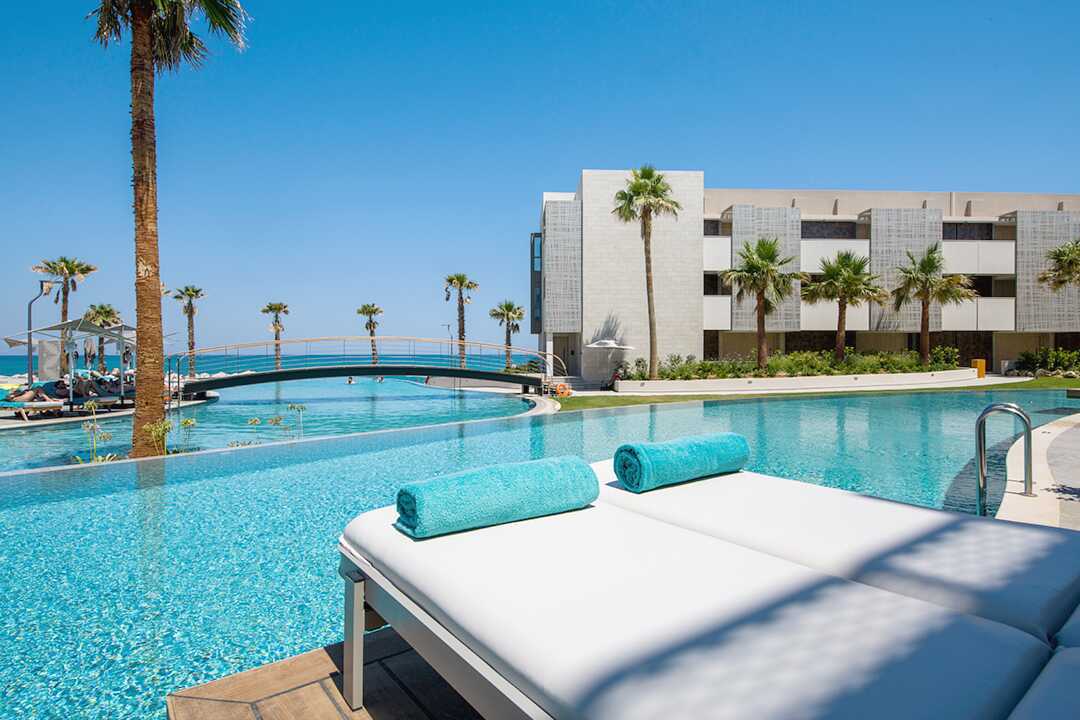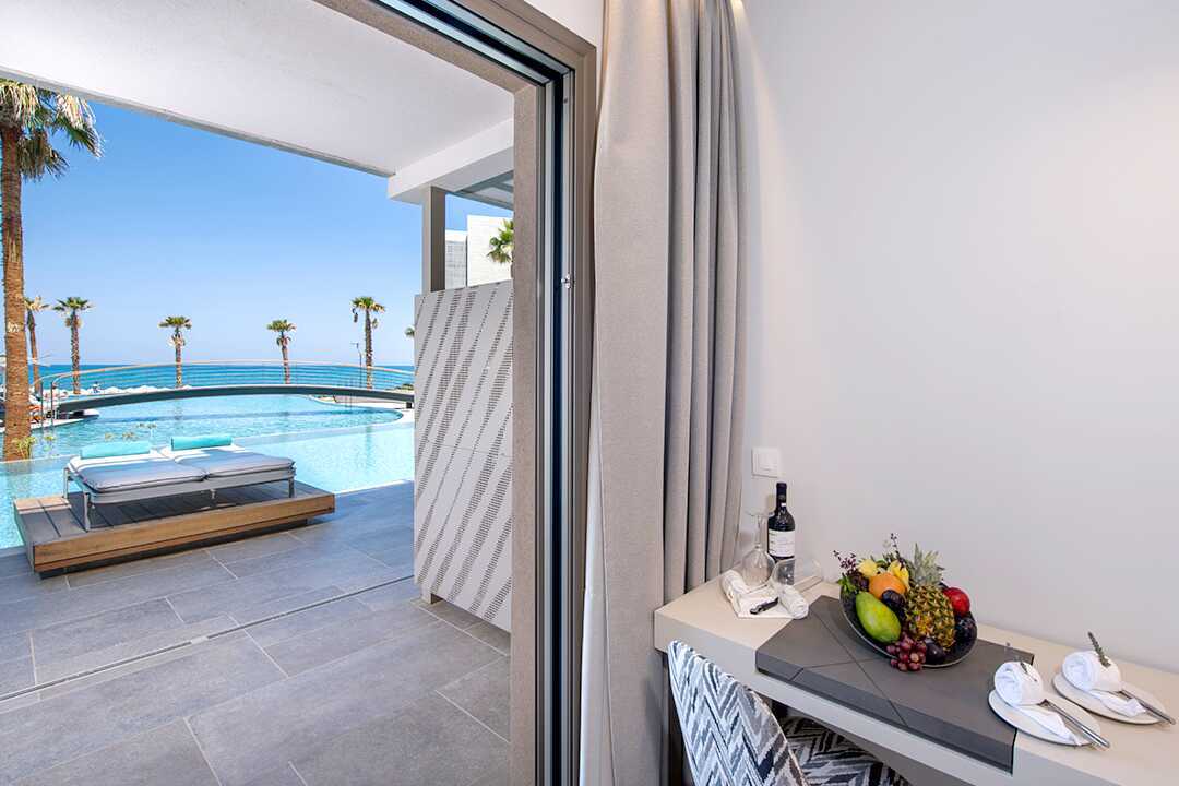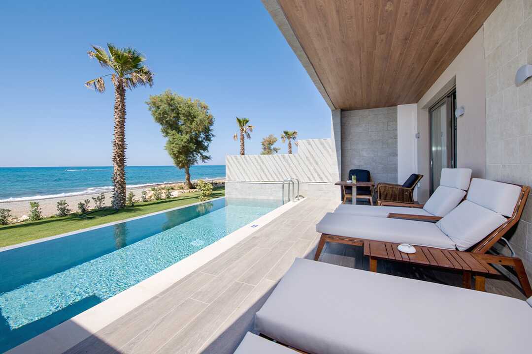 Svit med uteplats och privat pool samt havsutsikt. På uteplatsen finns solstolar samt bord och stolar. En dubbelsäng. Möjlighet till extrabädd i bäddsoffa. Wifi, luftkonditionering och deponering ingår. Kylskåp. Espresso kaffemaskin - kaplar ingår och fylls på varje dag. Vattenkokare samt kaffe och te. Tv med internationella kanaler. Strykjärn och strykbräda. Badrockar och tofflor. Hårtork. Badrum med badkar eller dusch samt wc. Städning 7 ggr/vecka.